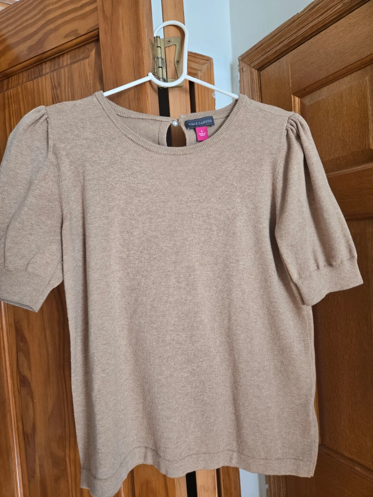 15Selling a Vince Camuto sweater in a lovely beige color! It features stylish puff sleeves and is a size small. Perfect for adding a touch of elegance to your Spring/Fall wardrobe and it is super soft.