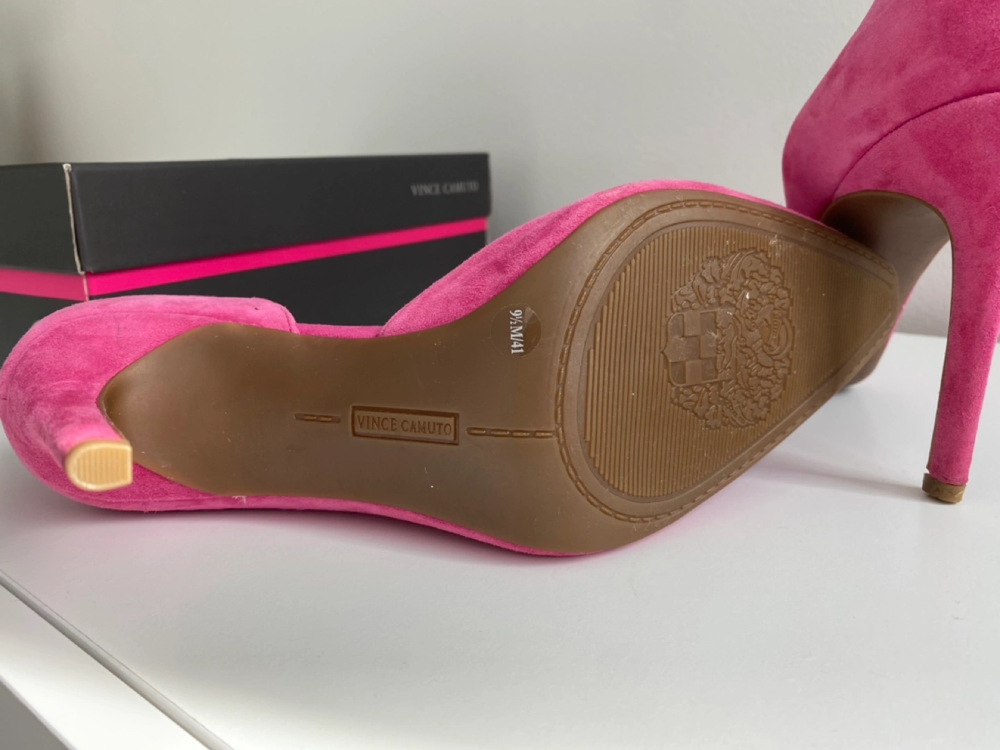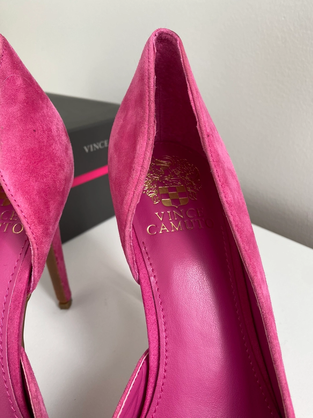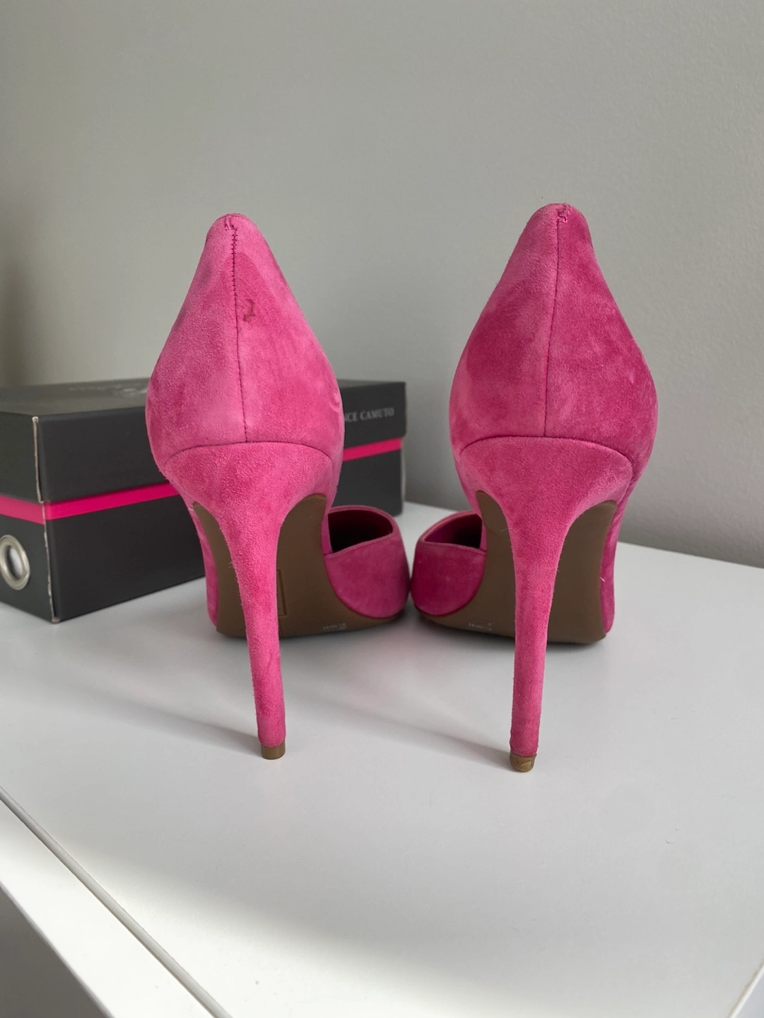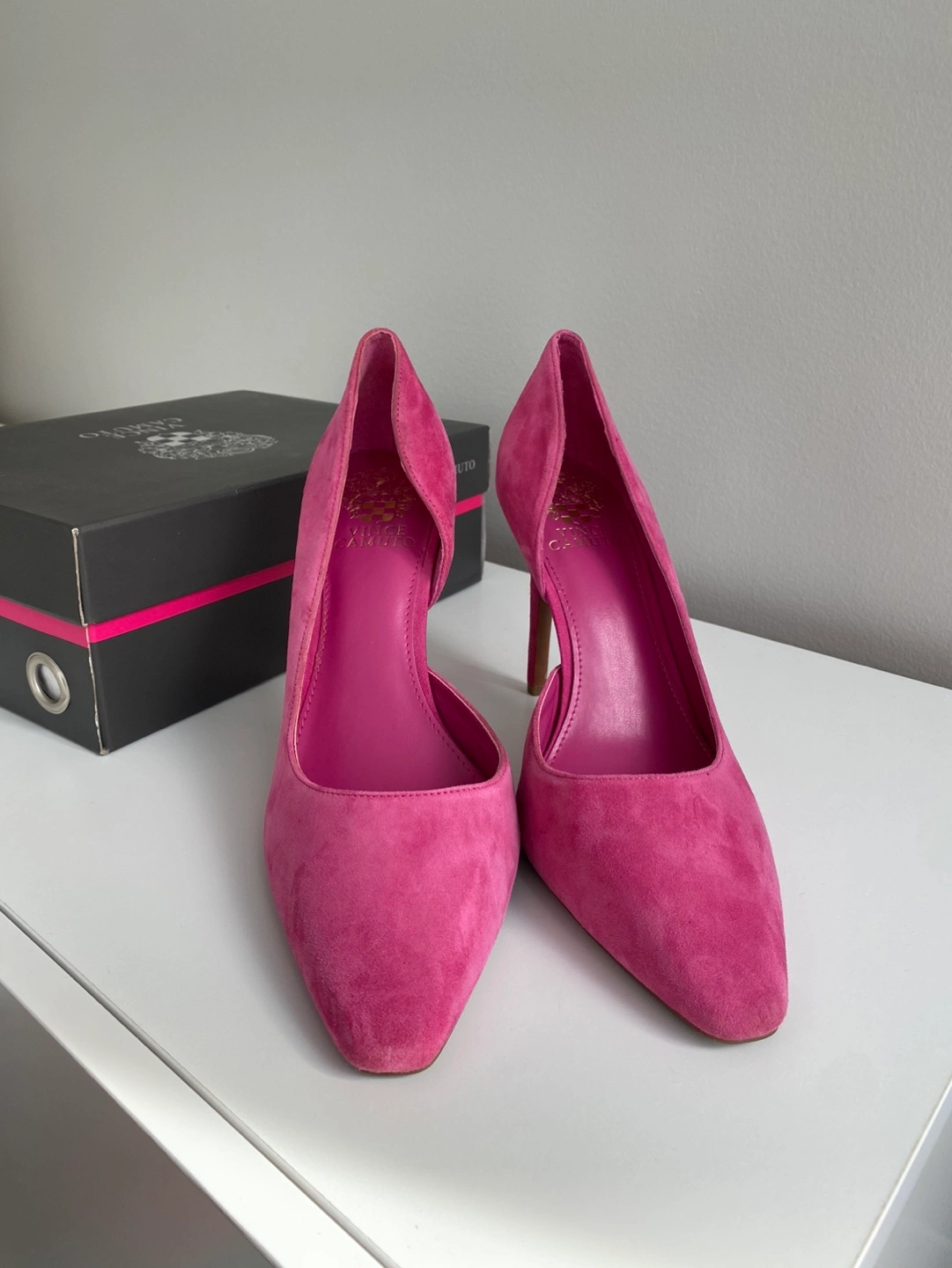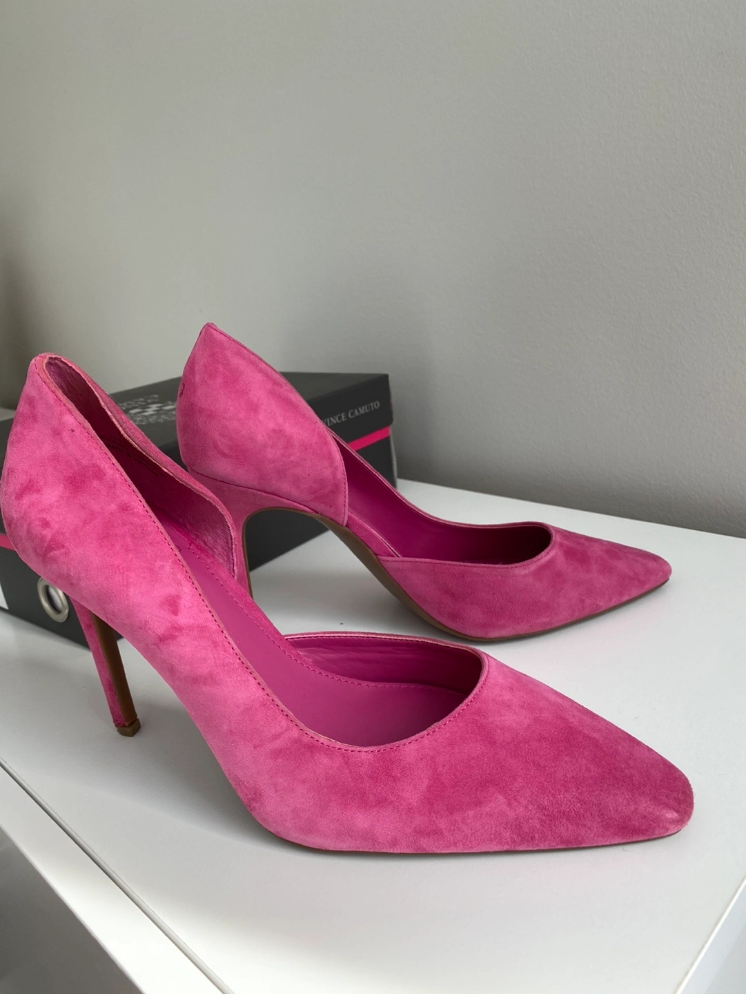 31Beautiful pink suede heels. Pointed toe, stiletto heel. Size 9.5M. Come with original box.