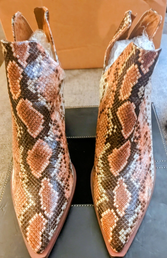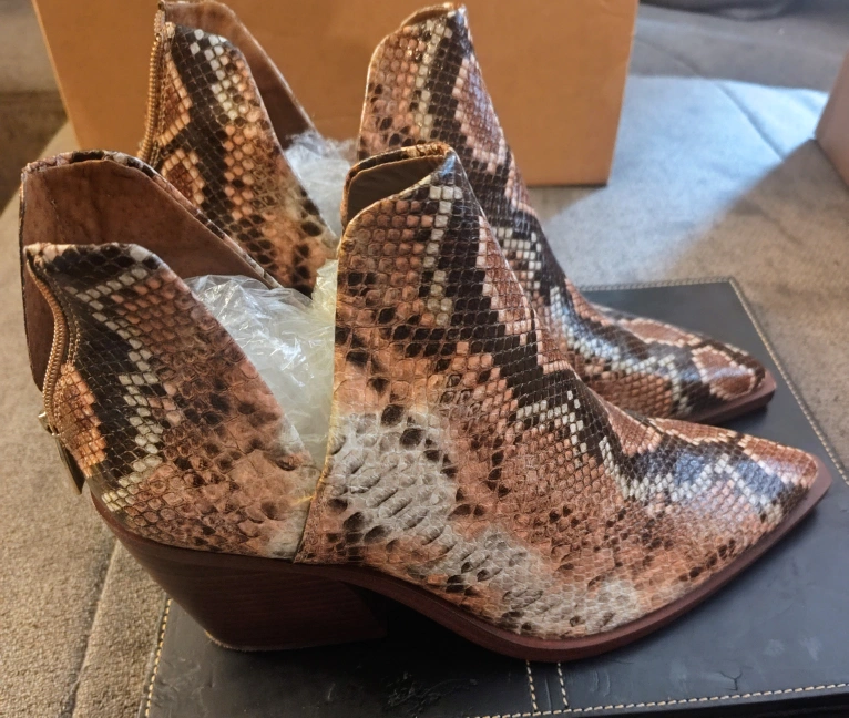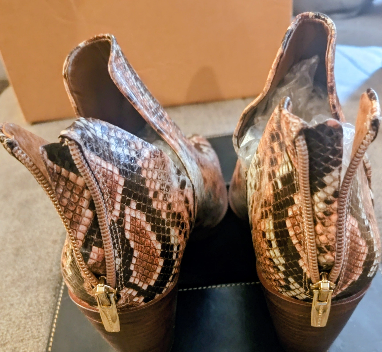 Snakeskin print Vince Camuto booties. They have a back zipper and a wood-look heel. These are a great neutral boot! for painting the town or dressing down.