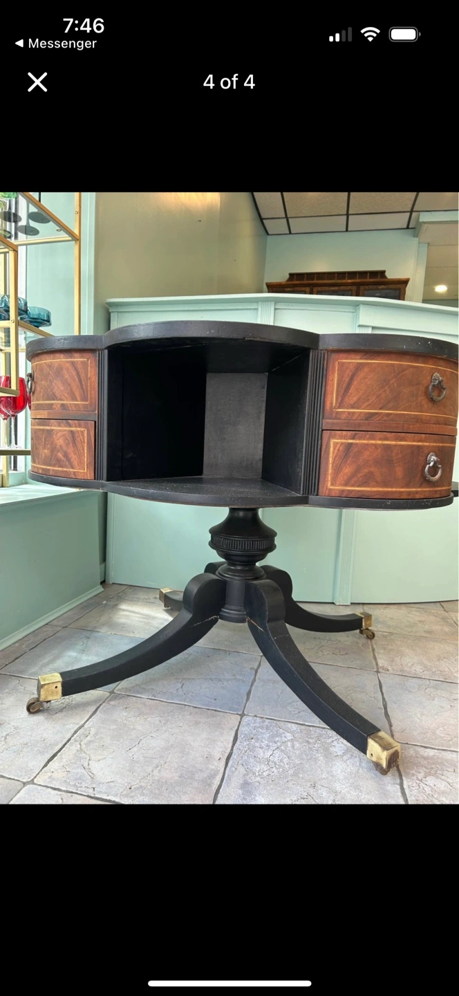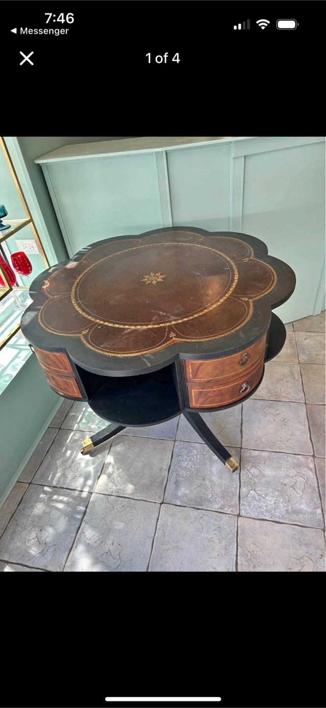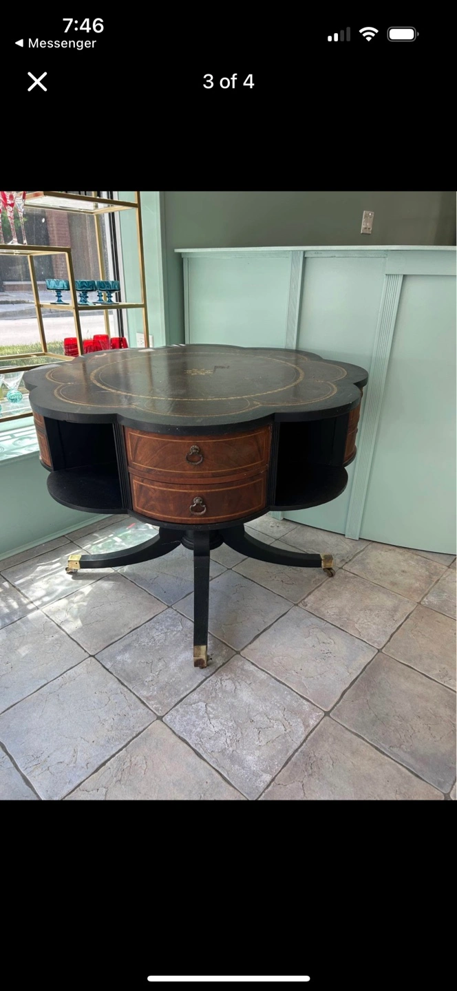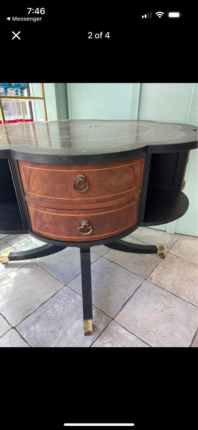 427This is a beautiful vintage round accent table. It features 4 drawers and a unique design. The table has a dark top with gold accents and a brown wood grain on the drawers. The legs are black with gold-colored feet. It would make a lovely addition to any room! Has leather top. (Best offer)