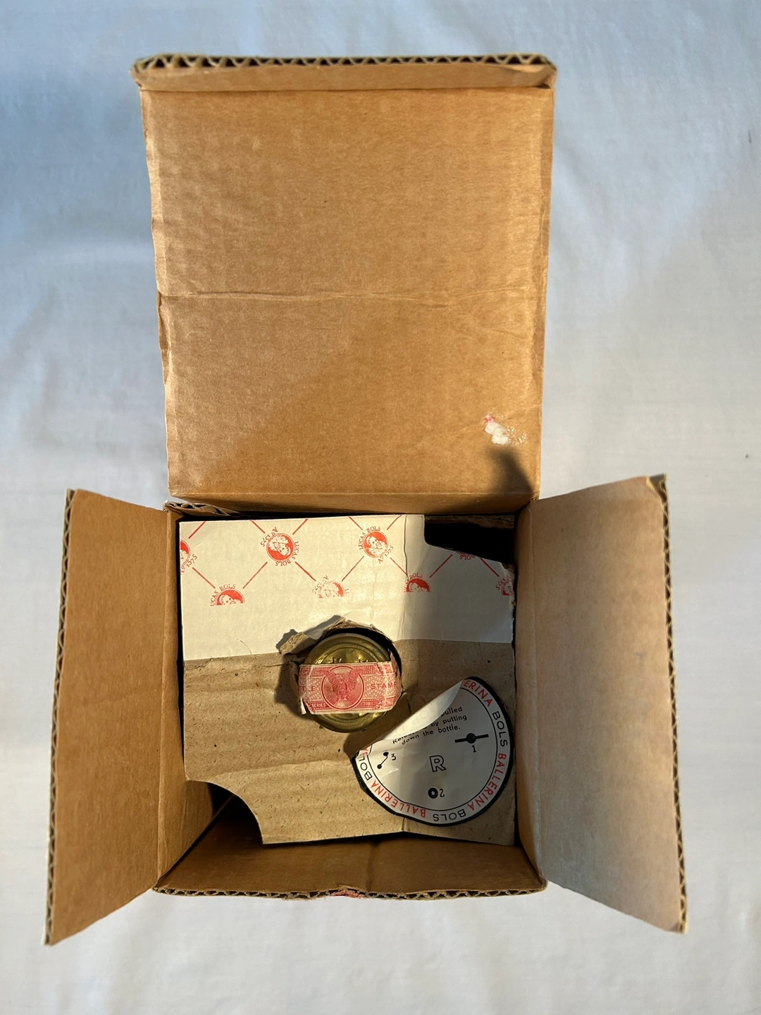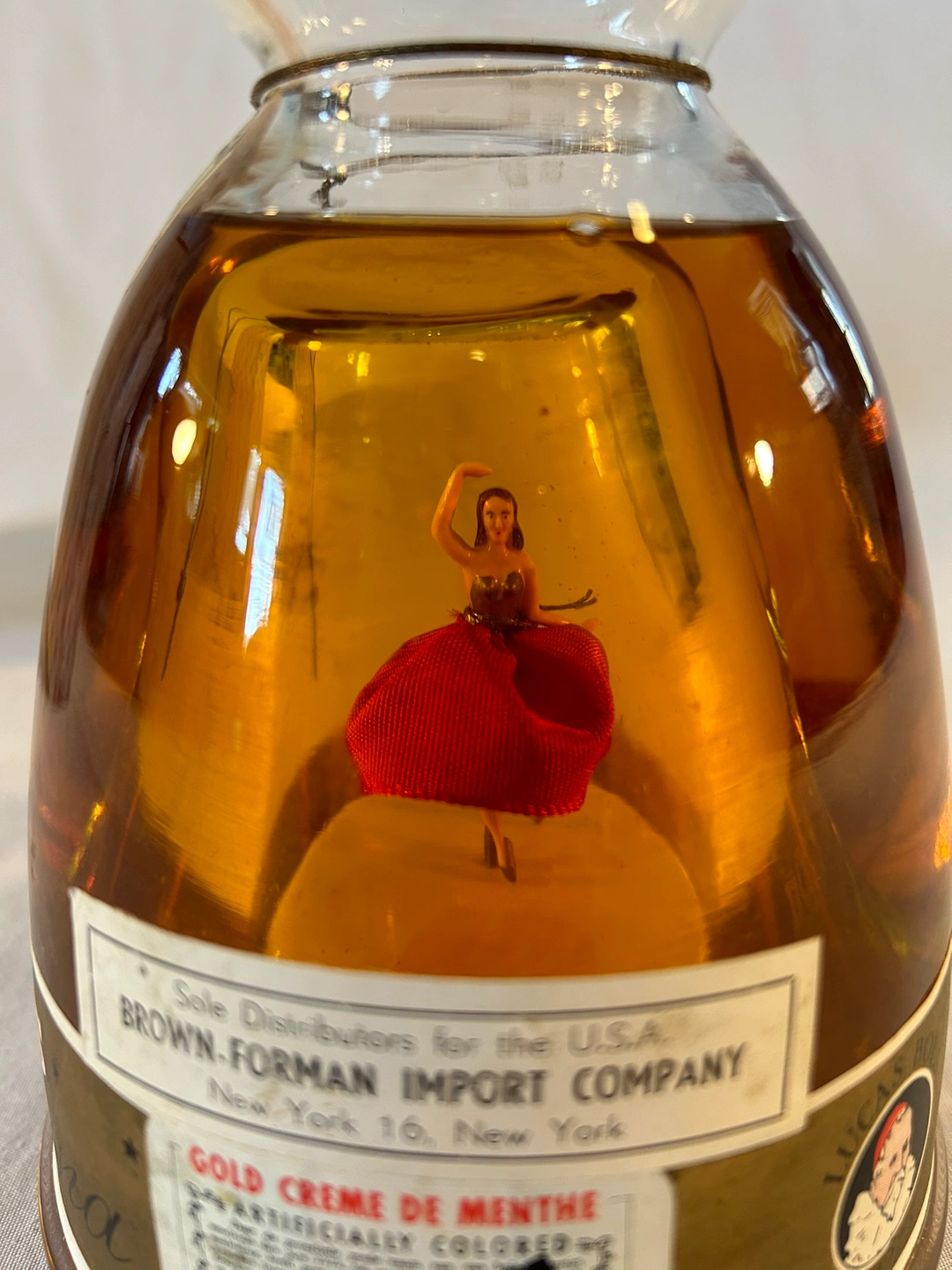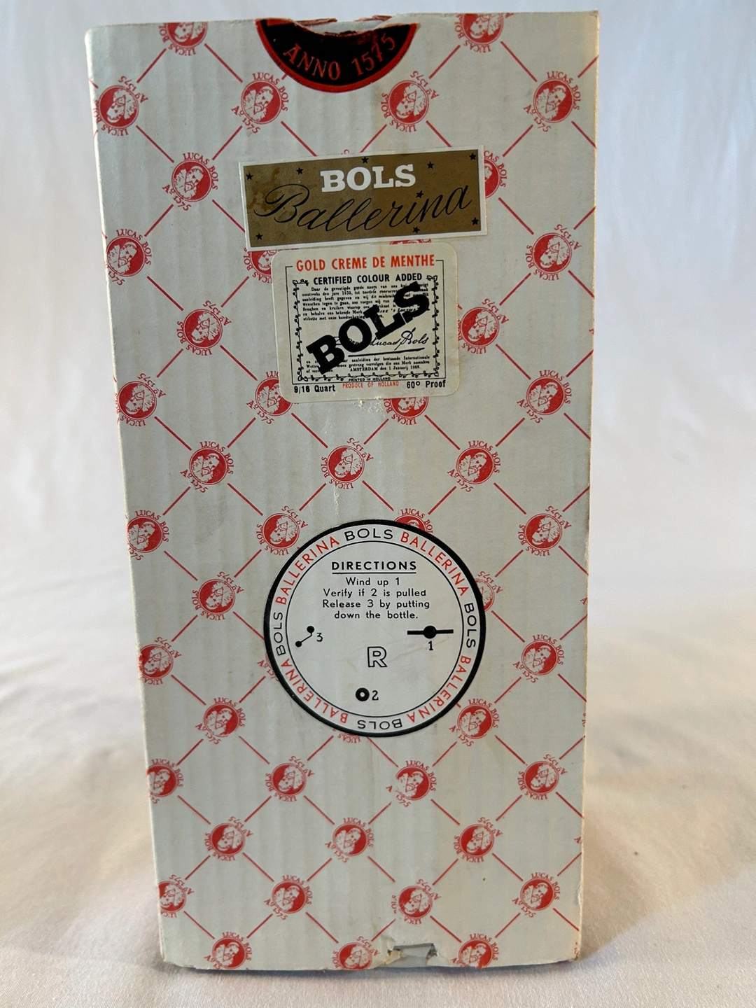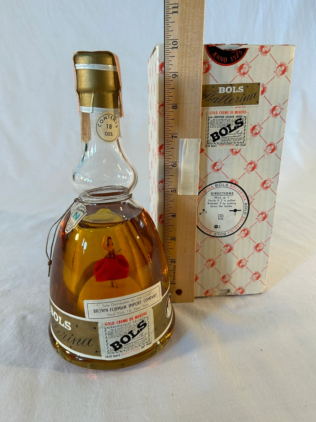 For true VINTAGE collectors - RARE FIND in this condition with orig box. Red skirt ballerina dances to “Valse des Patineurs” inside Bols Creme de Menthe bottle. Music box made in France, bottle made in Holland. Brown Forman Import product. Tax stamp intact. Exquisite piece. Bottle unopened, sealed. Online pricing ranges $320-$450, most without box.