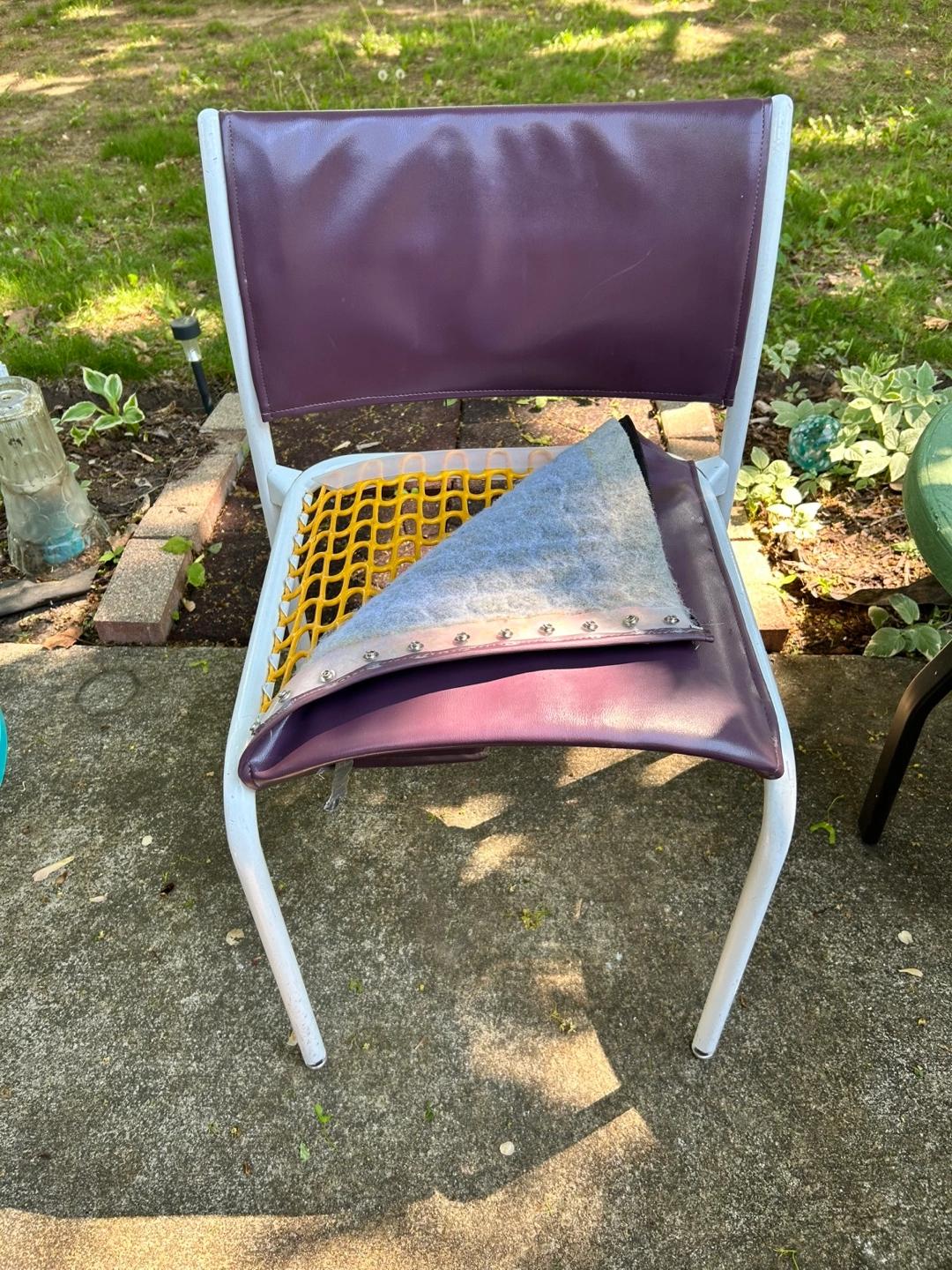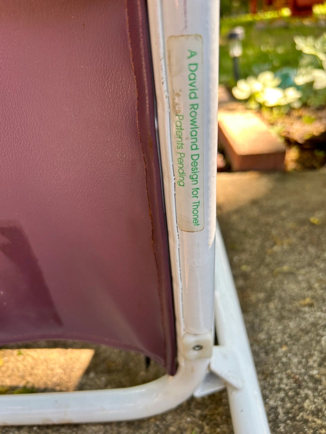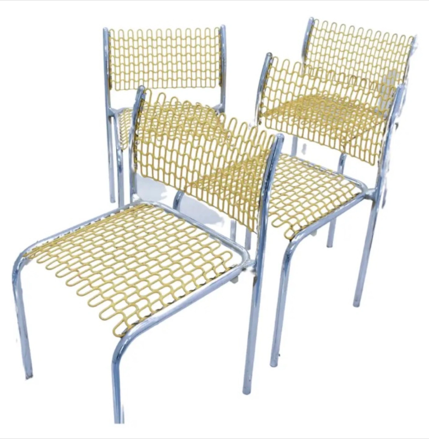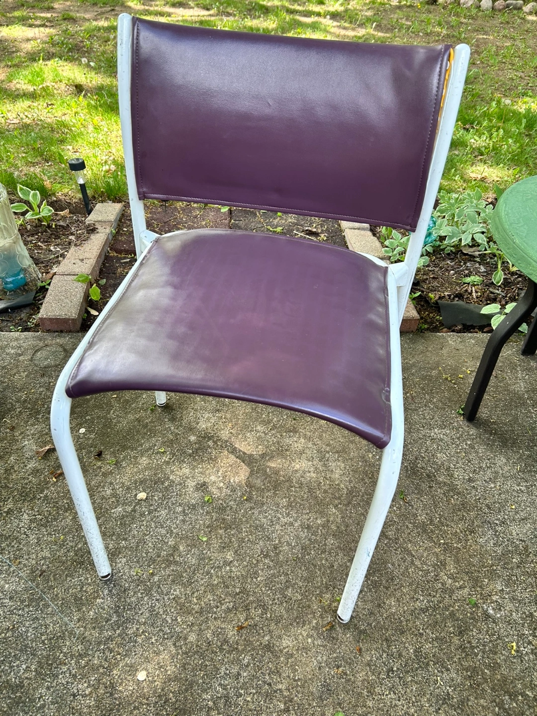 Selling these cool vintage authentic chairs! Mid century modern. They have a unique metal frame with woven seats. Purple Slip covers for a different look, that zip on off. Have protected the mesh, so excellent condition. Very comfortable. 5 chairs are white and yellow one chair is red and white. 6 total. $250 each. Legs need cleaning, magic eraser works well. Signed on bottom of chairs. Great for adding a retro touch to your space