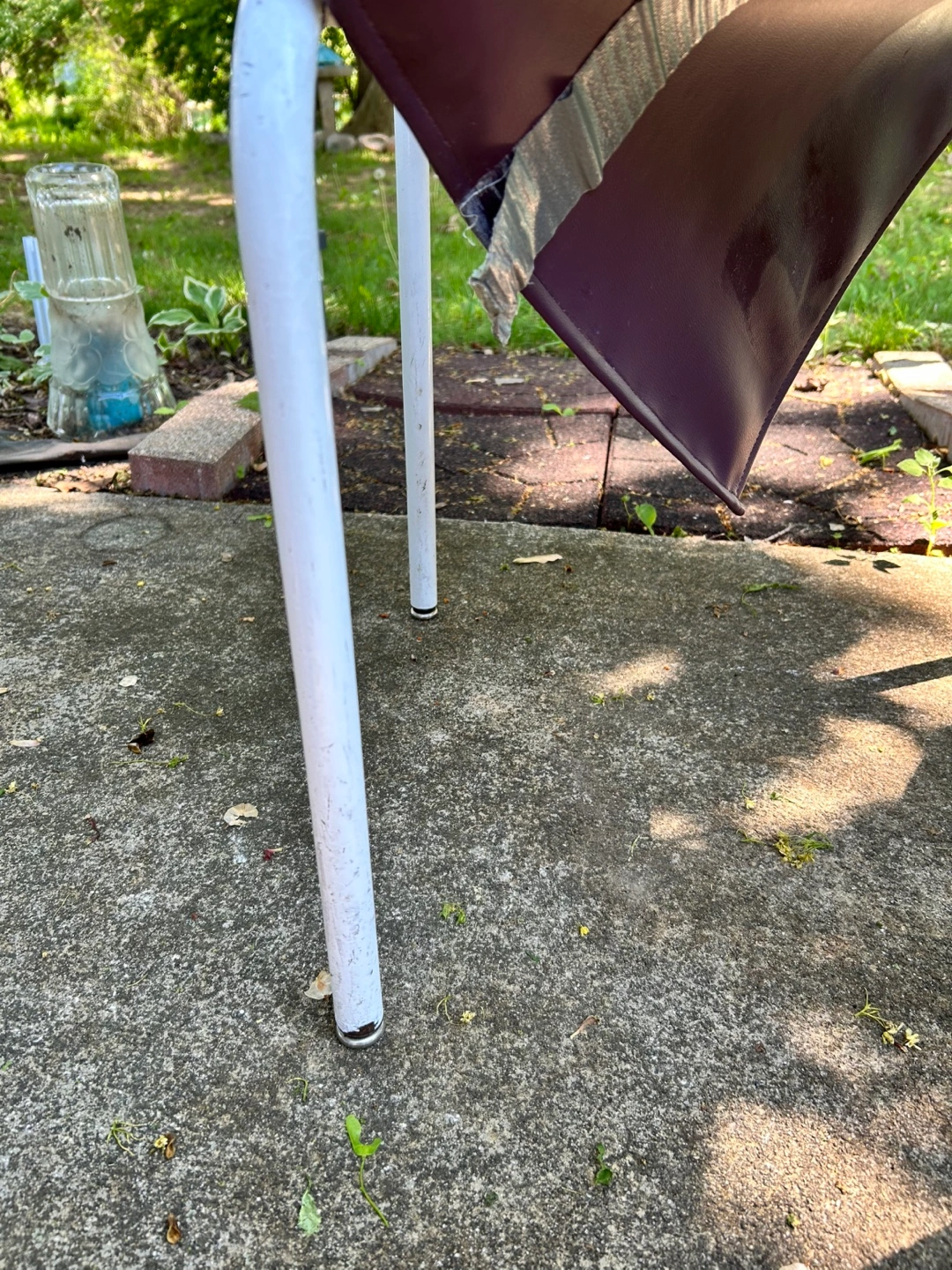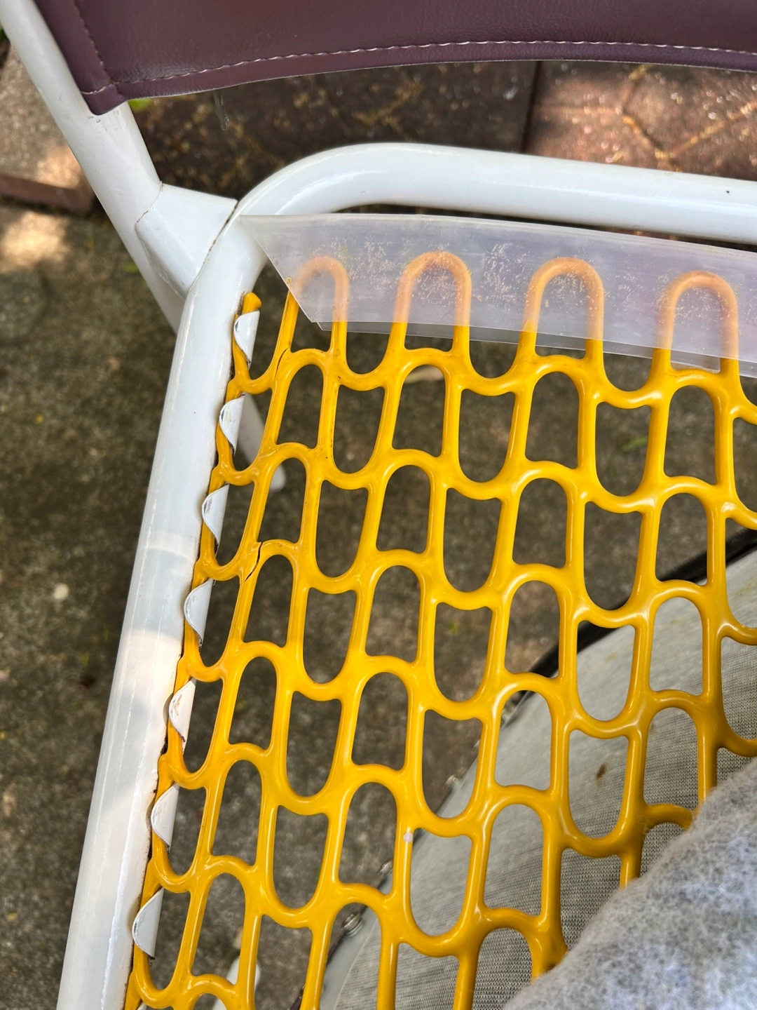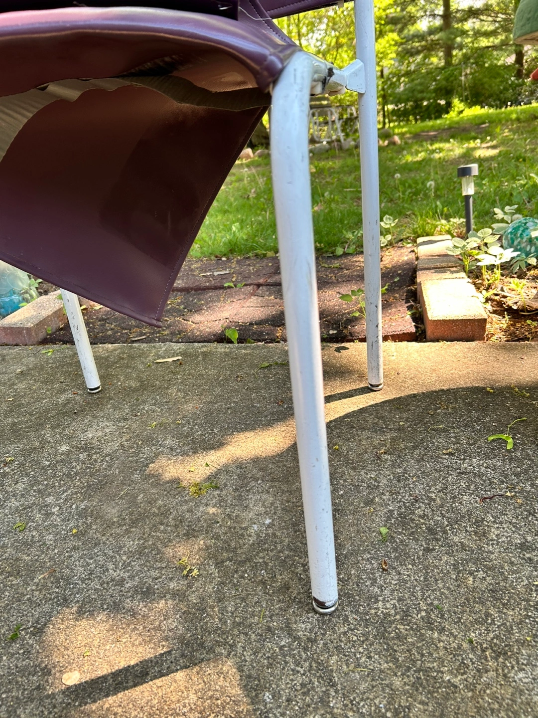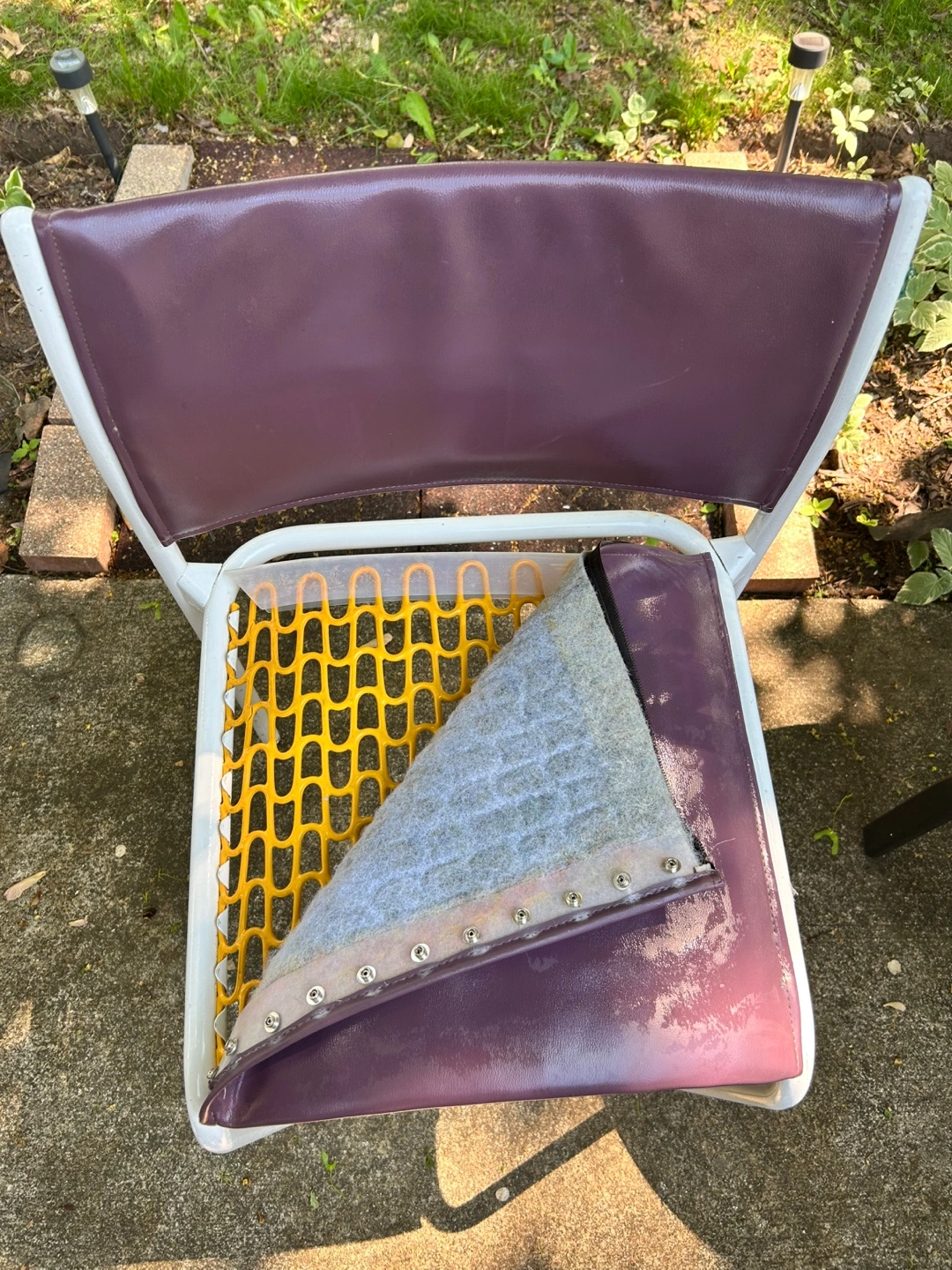 Selling these cool vintage authentic chairs! Mid century modern. They have a unique metal frame with woven seats. Purple Slip covers for a different look, that zip on off. Have protected the mesh, so excellent condition. Very comfortable. 5 chairs are white and yellow one chair is red and white. 6 total. $250 each. Legs need cleaning, magic eraser works well. Signed on bottom of chairs. Great for adding a retro touch to your space