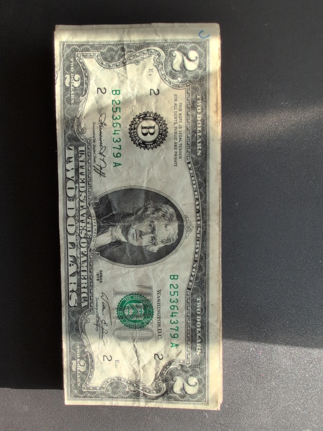 10Series 1976 $2 bill. Shows some wear. Legal tender.