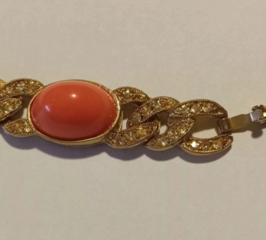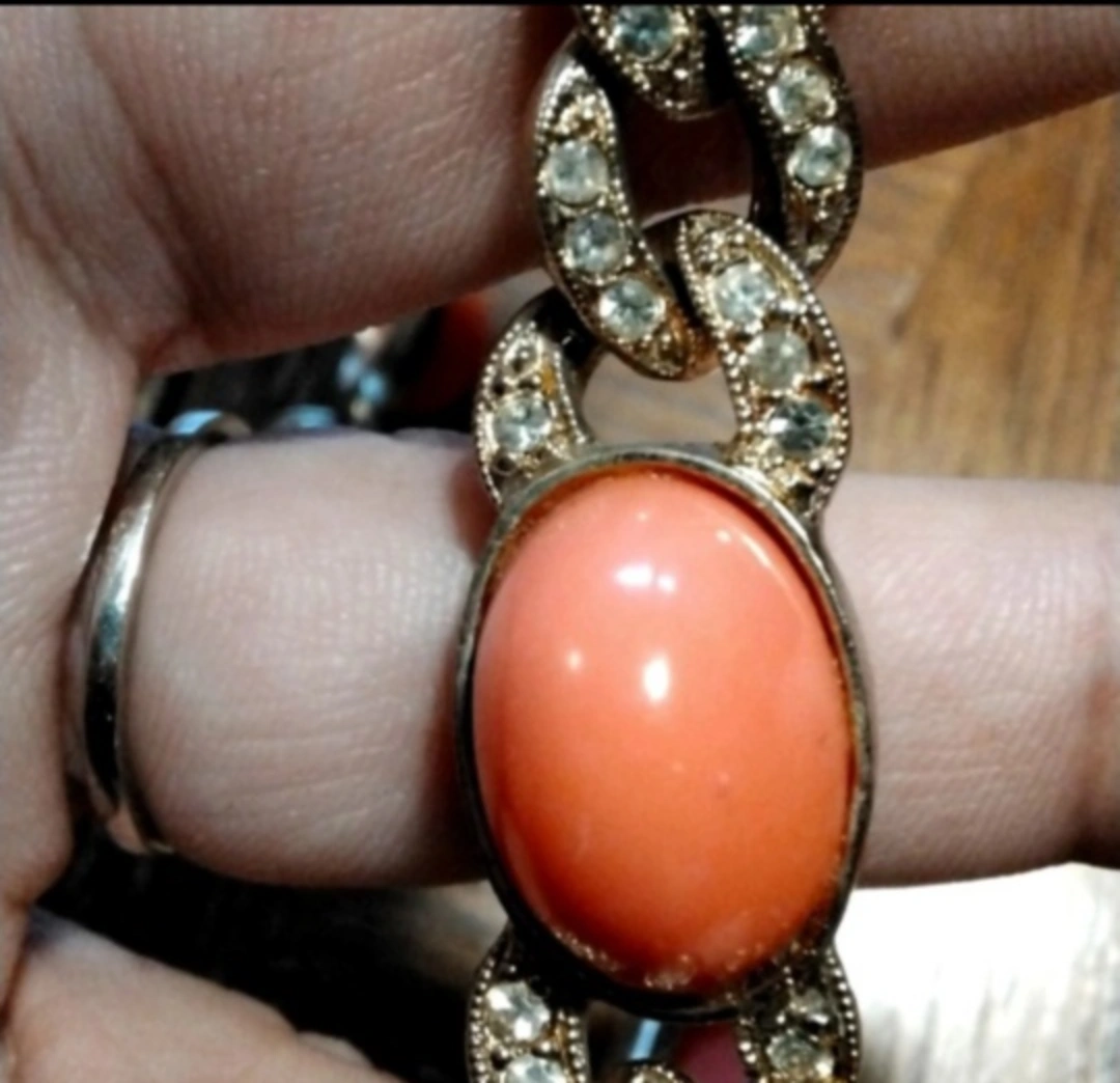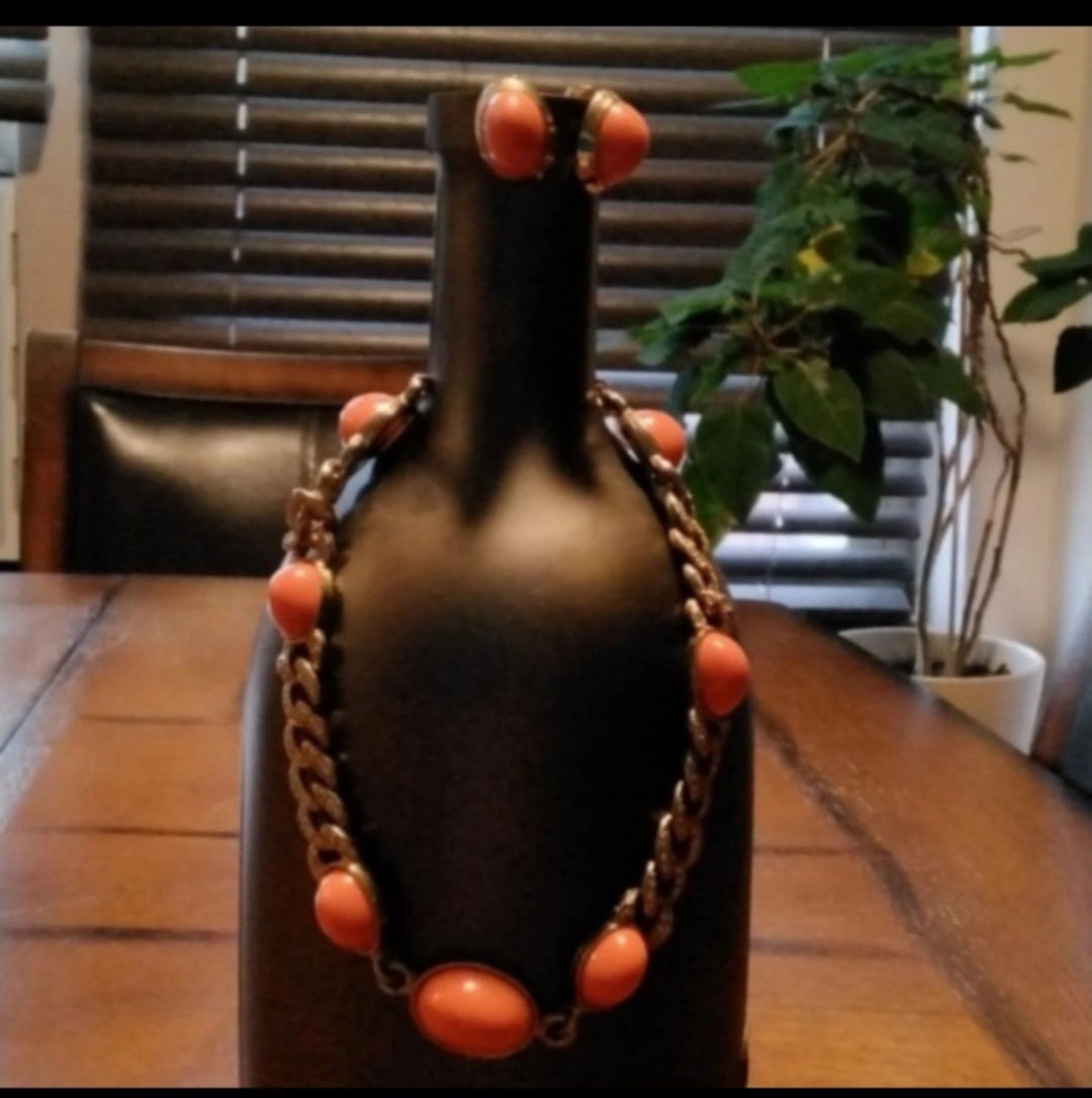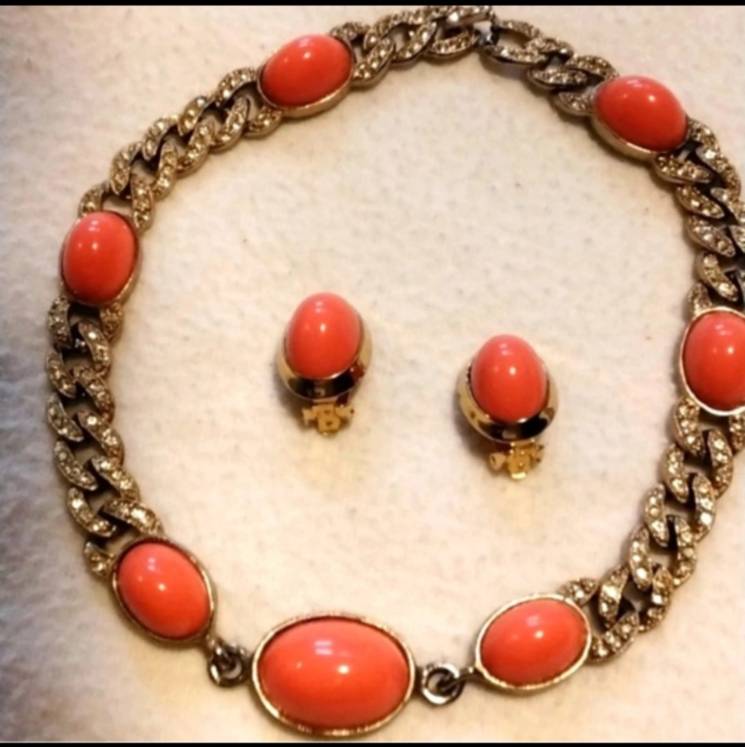 Vintage 1980's Kenneth Jay Lane Necklace and Earrings ▪︎Goldtone ▪︎crystals throughout necklace ▪︎coral colored stones ▪︎17" Strand ▪︎Clip on Earrings ▪︎photo with mark/tag appears to be green, it is not. it only a reflection ▪︎Unique Item cannot be found on internet Open to reasonable offers