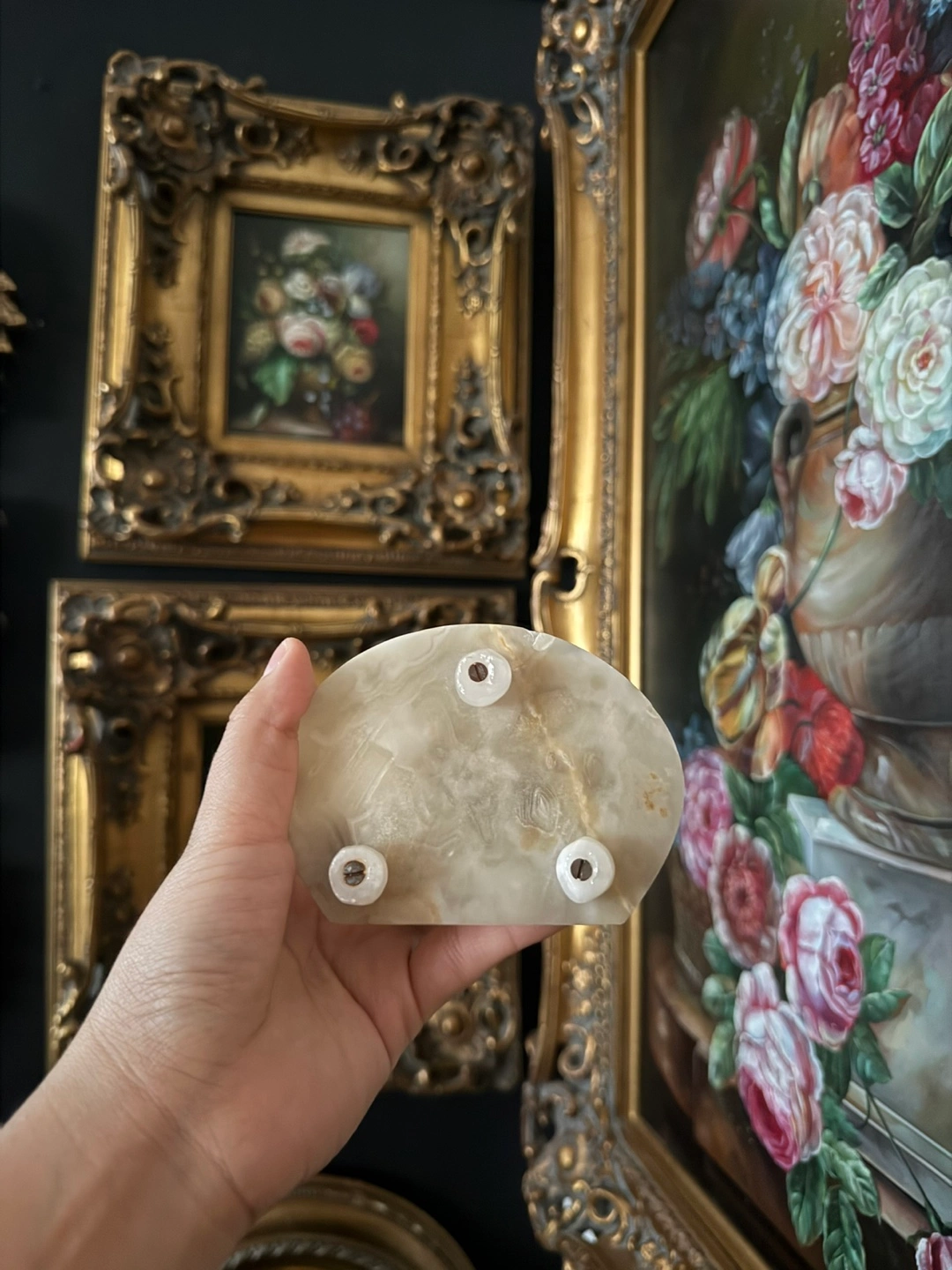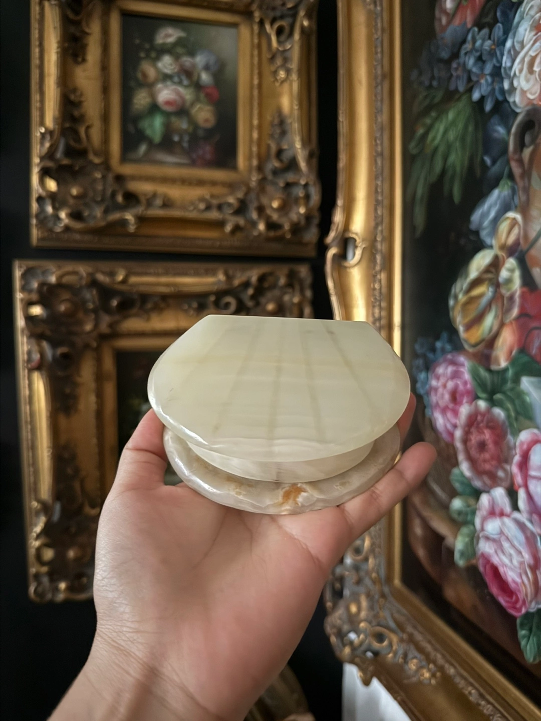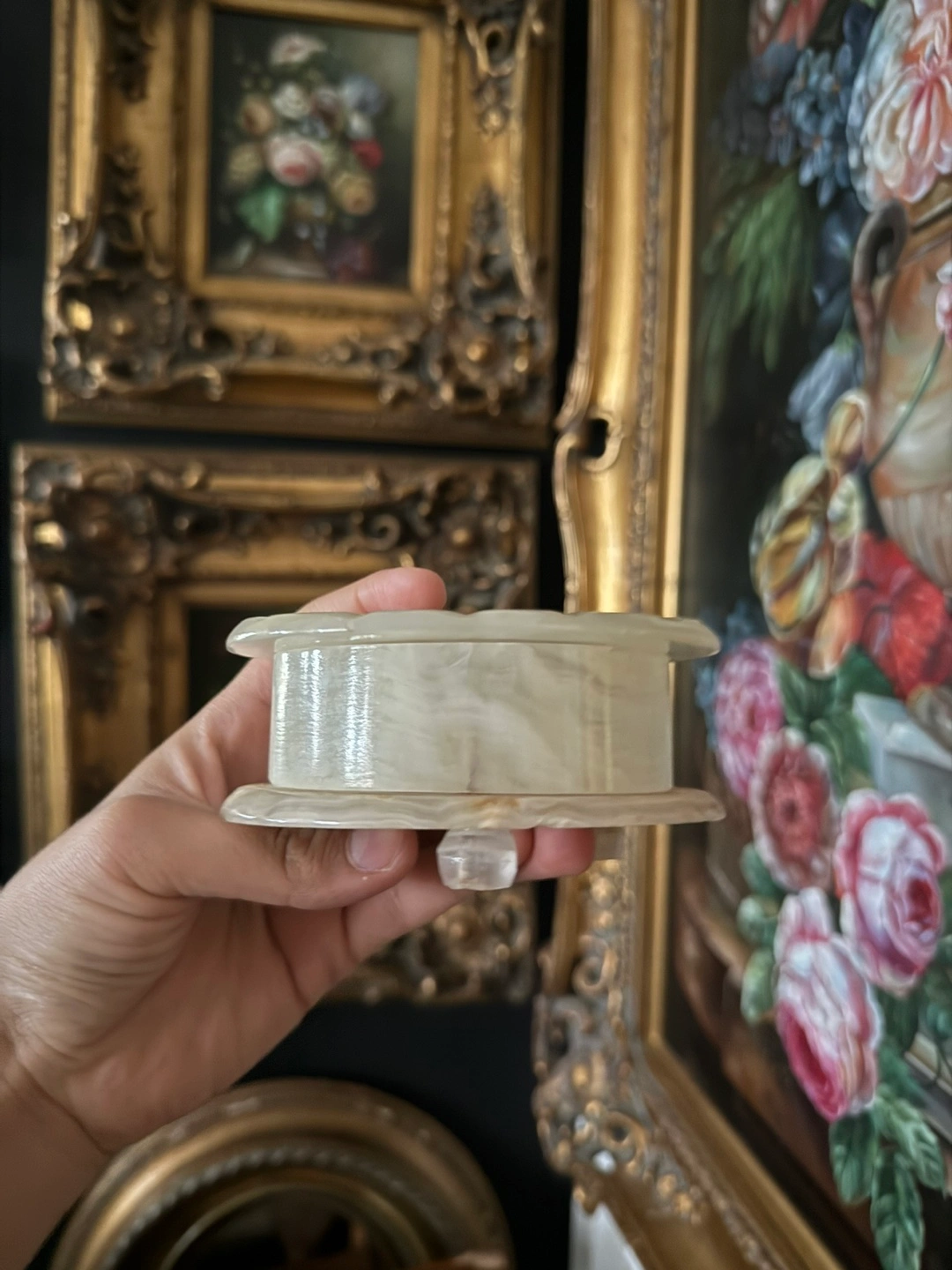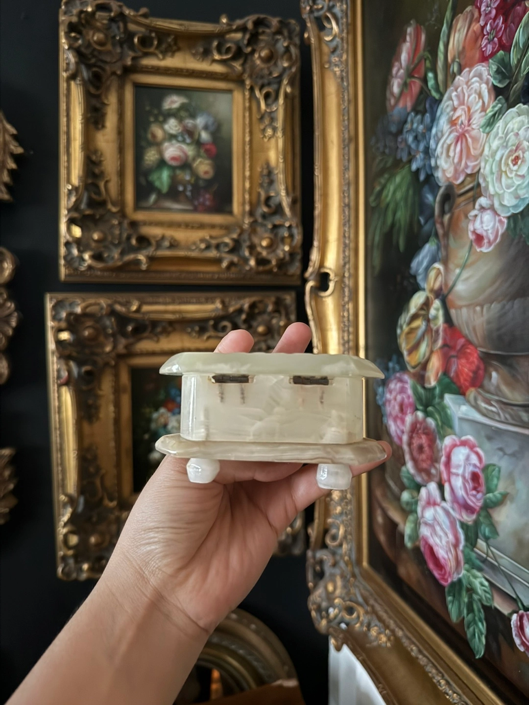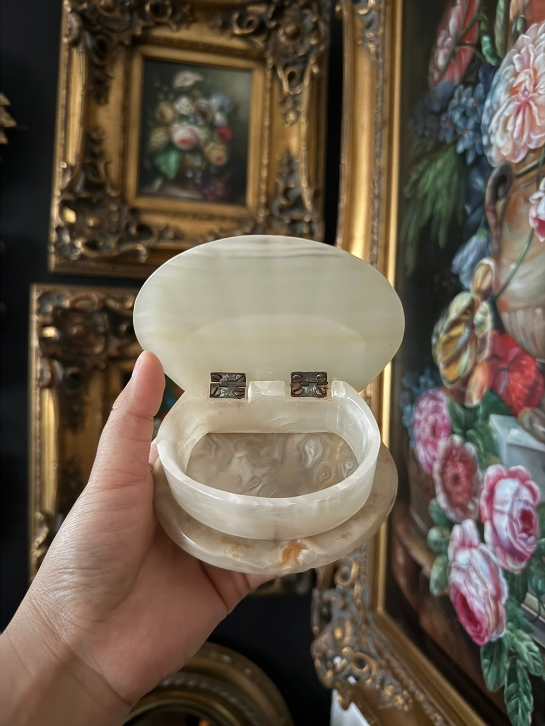 This is a lovely vintage alabaster trinket box! It's perfect for storing small jewelry or other precious items. The alabaster gives it a unique and elegant look, and it would make a great addition to any vanity or dresser.