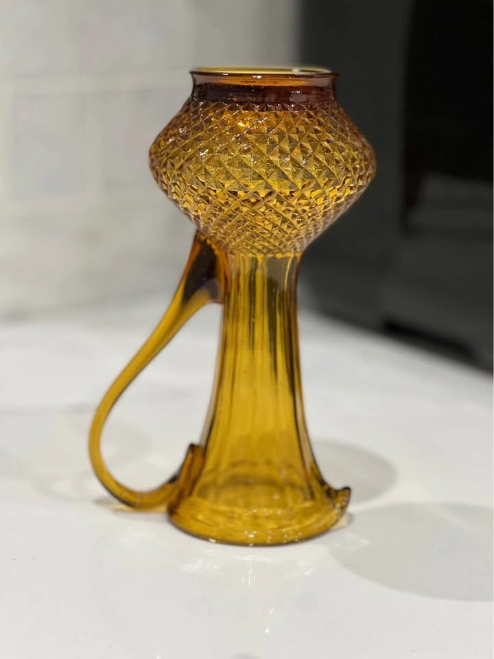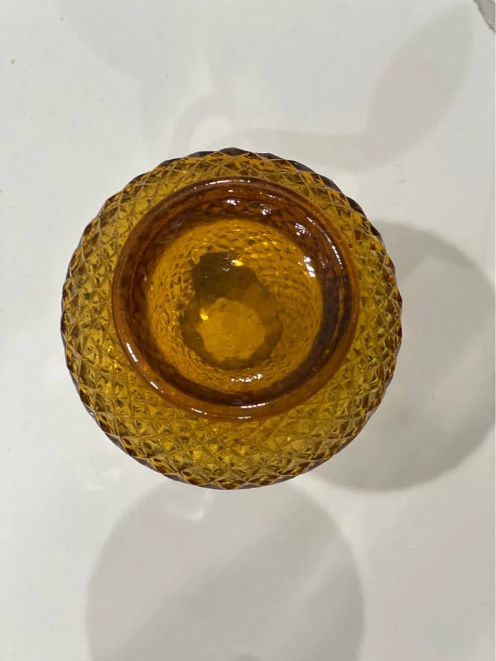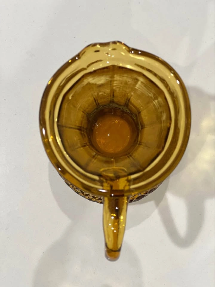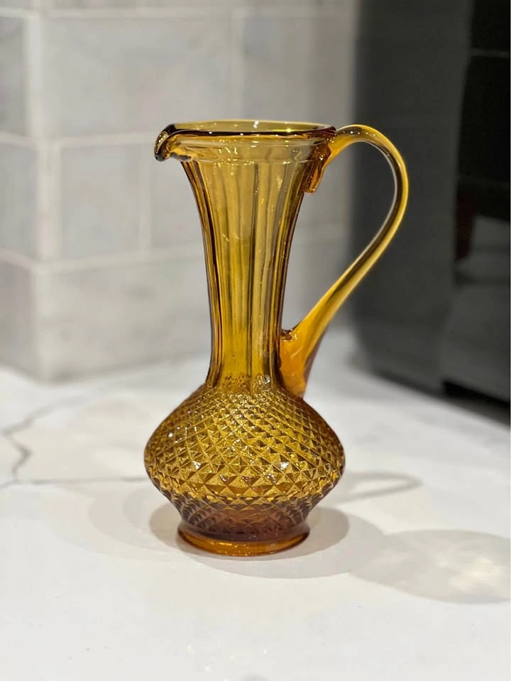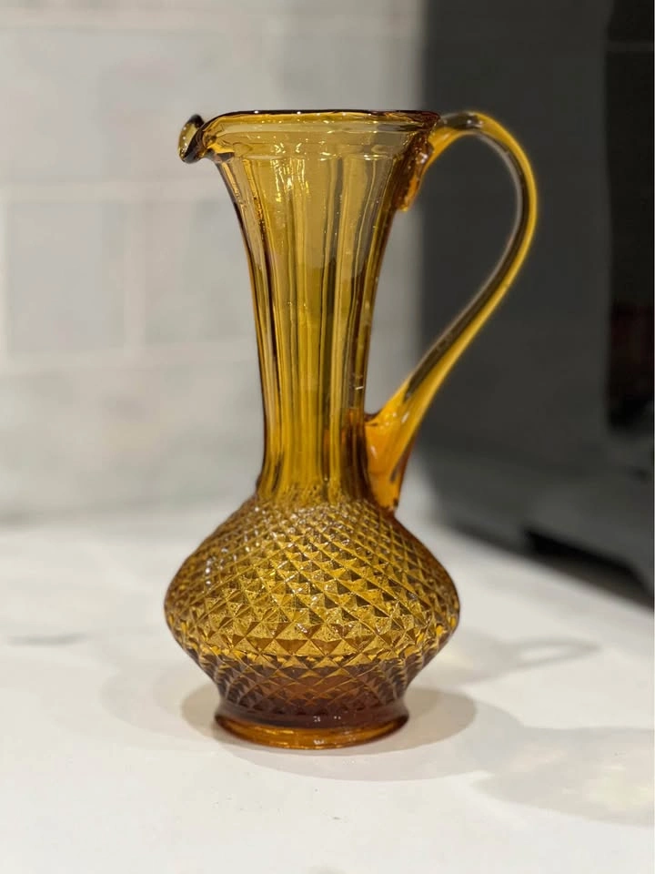 Selling a vintage amber glass pitcher, also referred to as a carafe. This style of glassware is often associated with mid-century design, particularly from the 1950s and 1960s. The pitcher features a diamond or hobnail pattern on the bulbous base. The upper section has a fluted, ribbed design leading to a spout and a large handle. The color is a rich, golden amber hue.