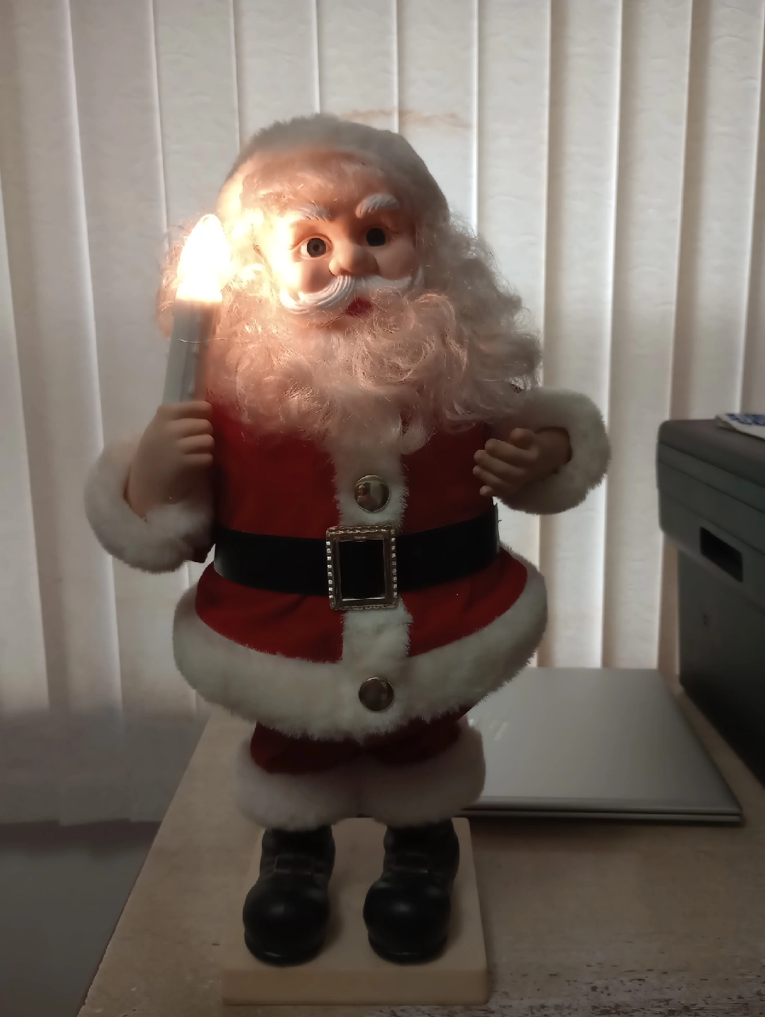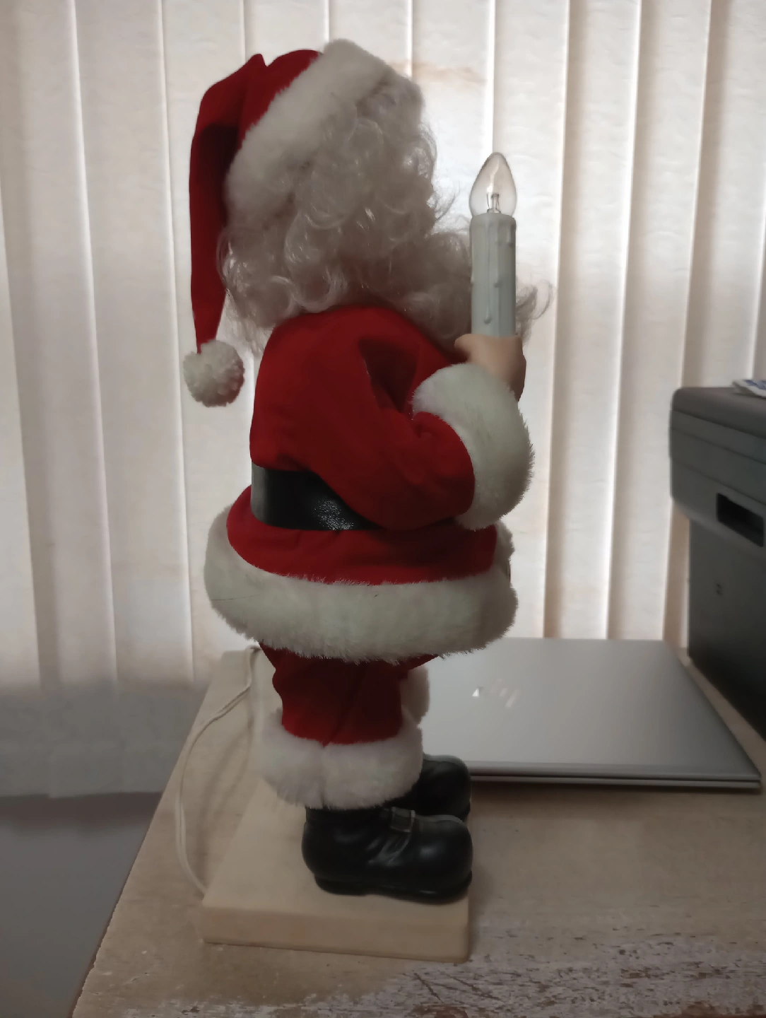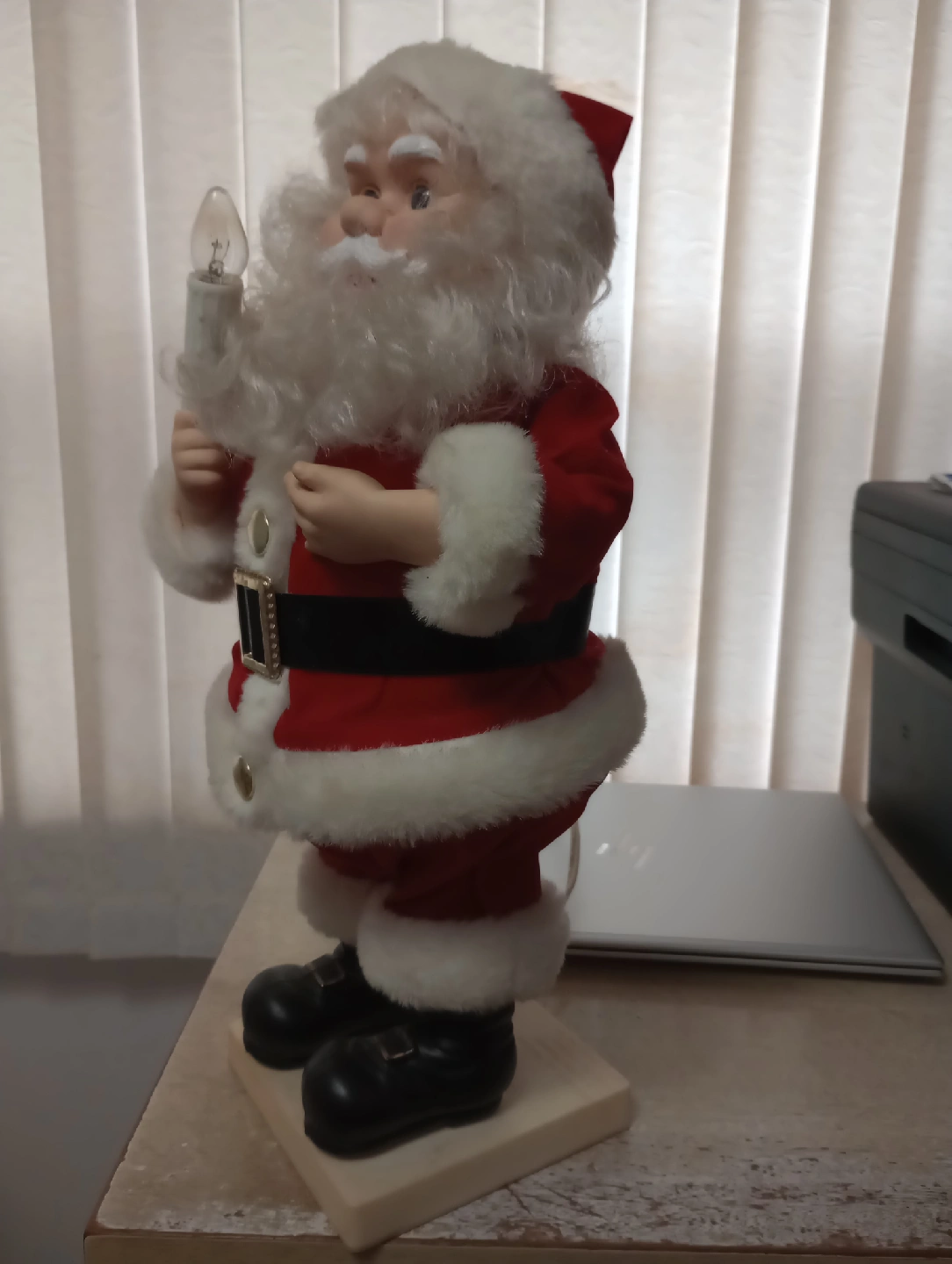 10Hi! Thank you for visiting my listings. Today, I'm selling a vintage animated/lighted Santa Claus figure! He's dressed in his classic red suit with white trim and a black belt. He's holding a candle (that lights up!). I really think this festive fellow would be a great addition to your holiday decor. Please take a peek at the pics to see if you agree. BTW, I have been a 100% Top-rated seller on eBay (my avatar/name on that platform is felicitasmaximus) for many years. So, although this is one of my first ventures on Karrot, you can certainly buy with confidence. Thanks for looking. Best wishes from West Lawn...