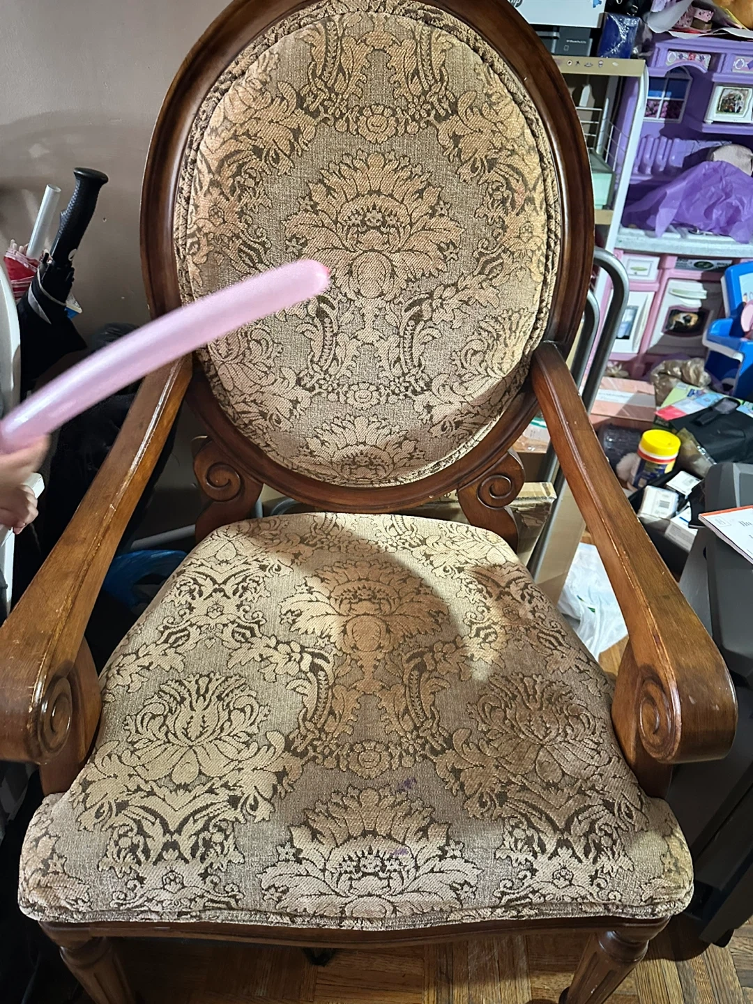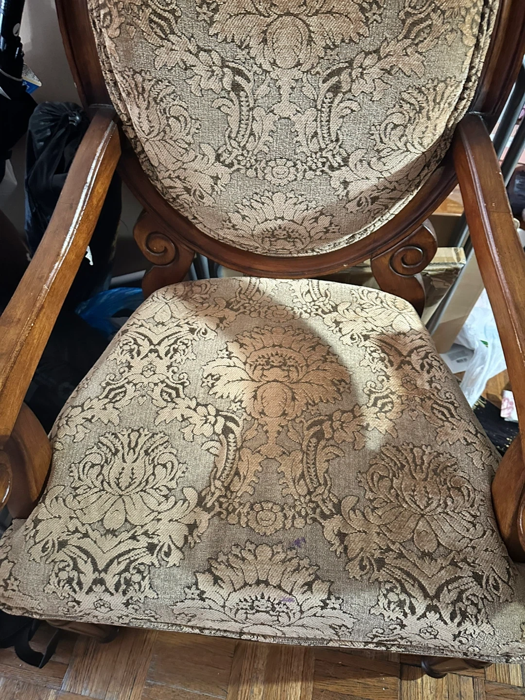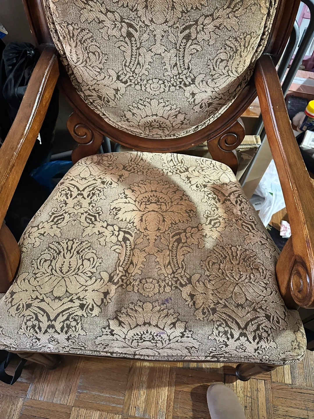 20Selling a vintage armchair with a beautiful floral pattern. The chair features a wooden frame with ornate carvings. The fabric is a neutral color with a detailed floral design. It would be a great addition to any home!