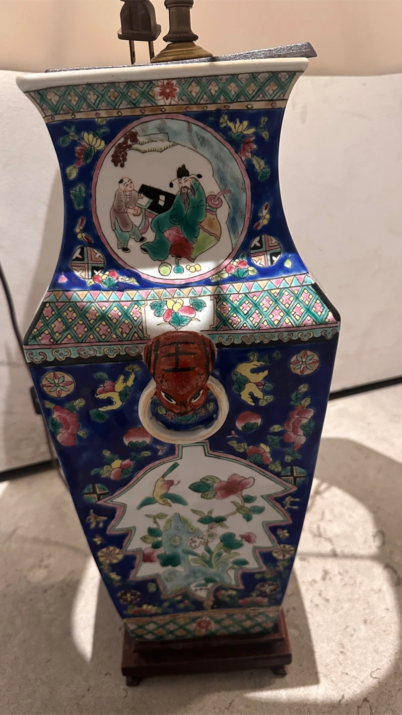 10Beautiful vintage table lamp with an Asian-inspired design! It features intricate floral and scenic patterns in vibrant colors on a blue background. The lamp has a unique shape and is mounted on a wooden base. It would make a lovely addition to any room