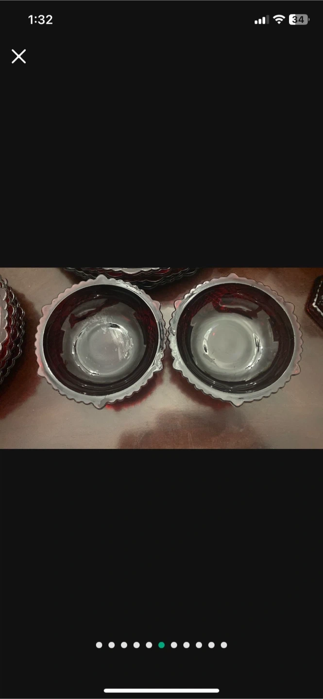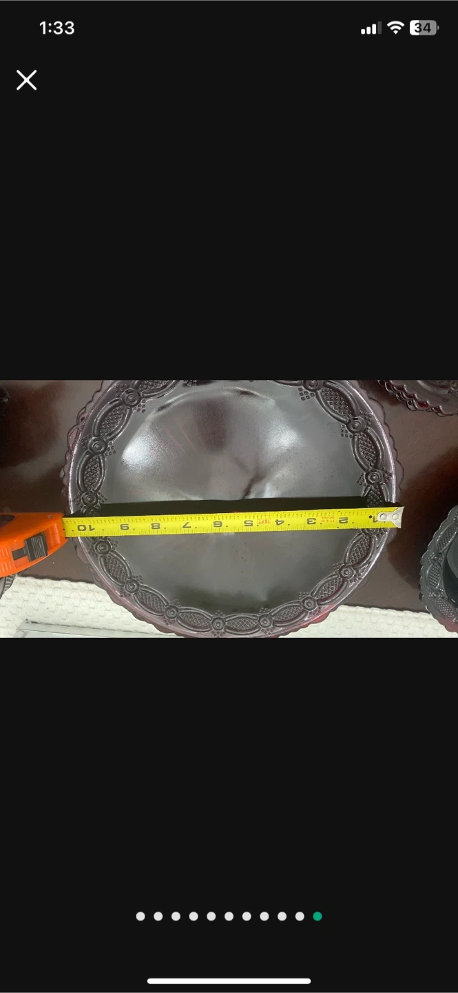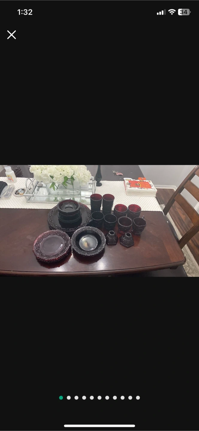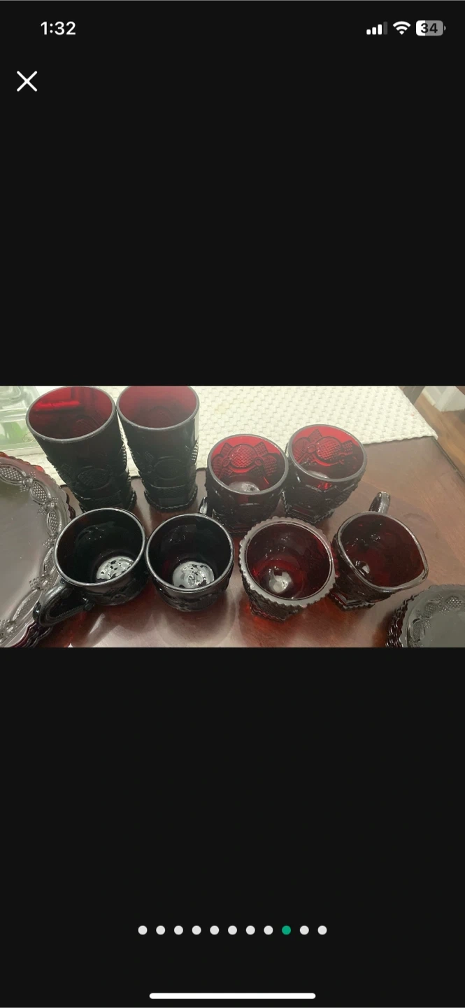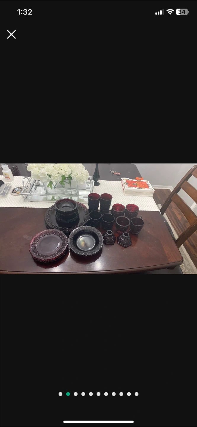 10Selling a vintage avonGlass Ruby Red dish This set includes plates, bowls, cups, and other serving pieces. The plates are approximately 9 inches in diameter. This set is in excellent condition and would make a beautiful addition to any table setting 26 pcs