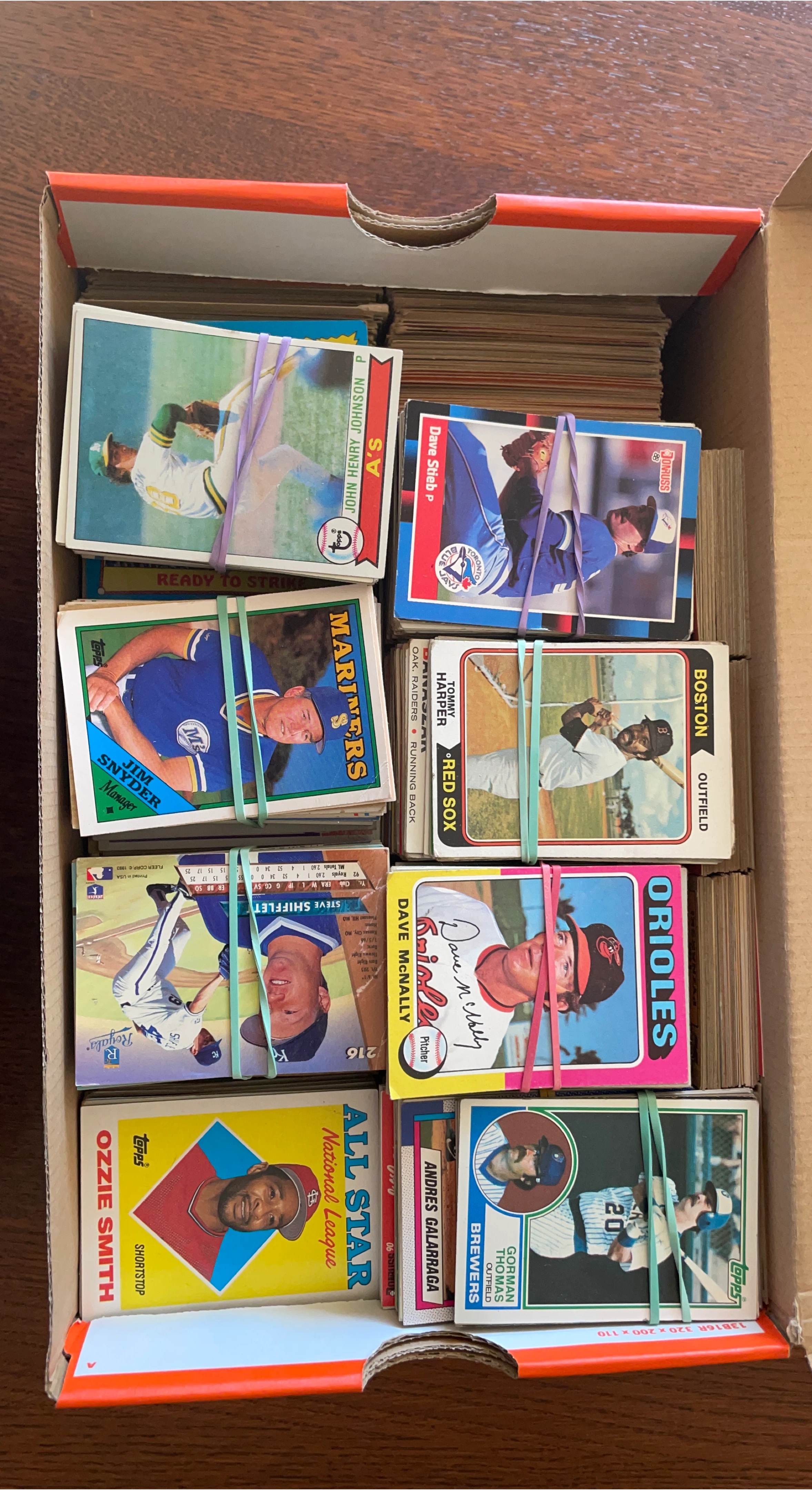 10Selling a box of assorted vintage sports cards! Primarily baseball but also includes some football and basketball cards as well. These cards would be great for any sports fan or collector looking to add to their collection. May be a fun item for someone young just getting into collecting.