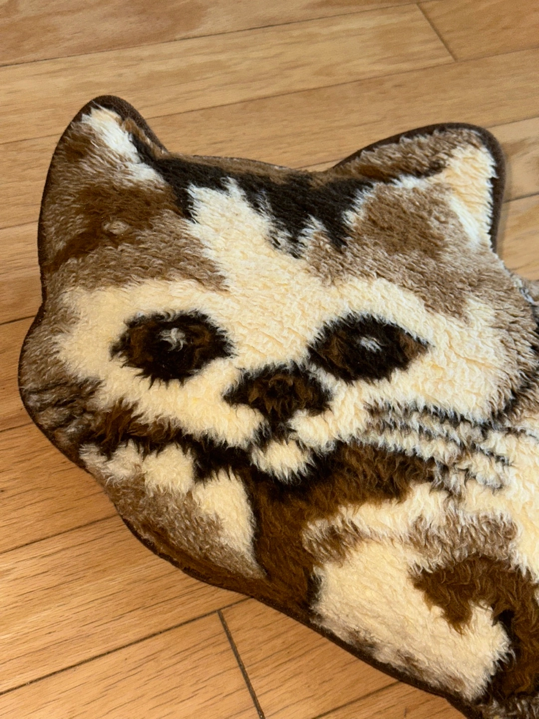 Adorable vintage cat shaped plush pillow. Brown, cream, and dark brown colors. Soft plush material. Perfect for cat lovers or a unique addition to your home decor. 25 x 7 X 12