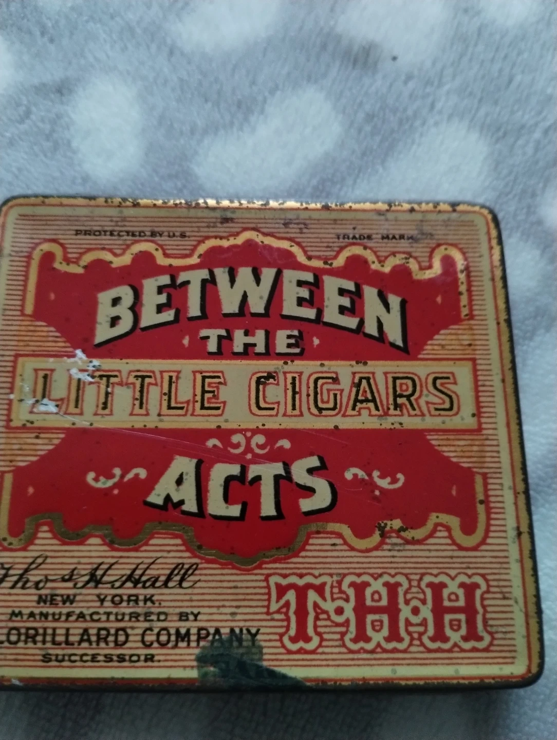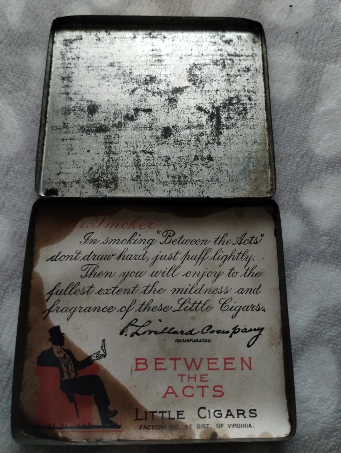 85Selling a vintage "Between the Acts" little cigars tin. It shows signs of wear and age, adding to its charm. Perfect for collectors of tobacco memorabilia or vintage tins!