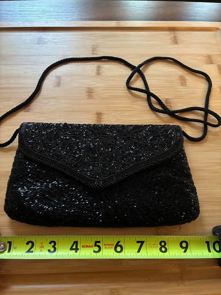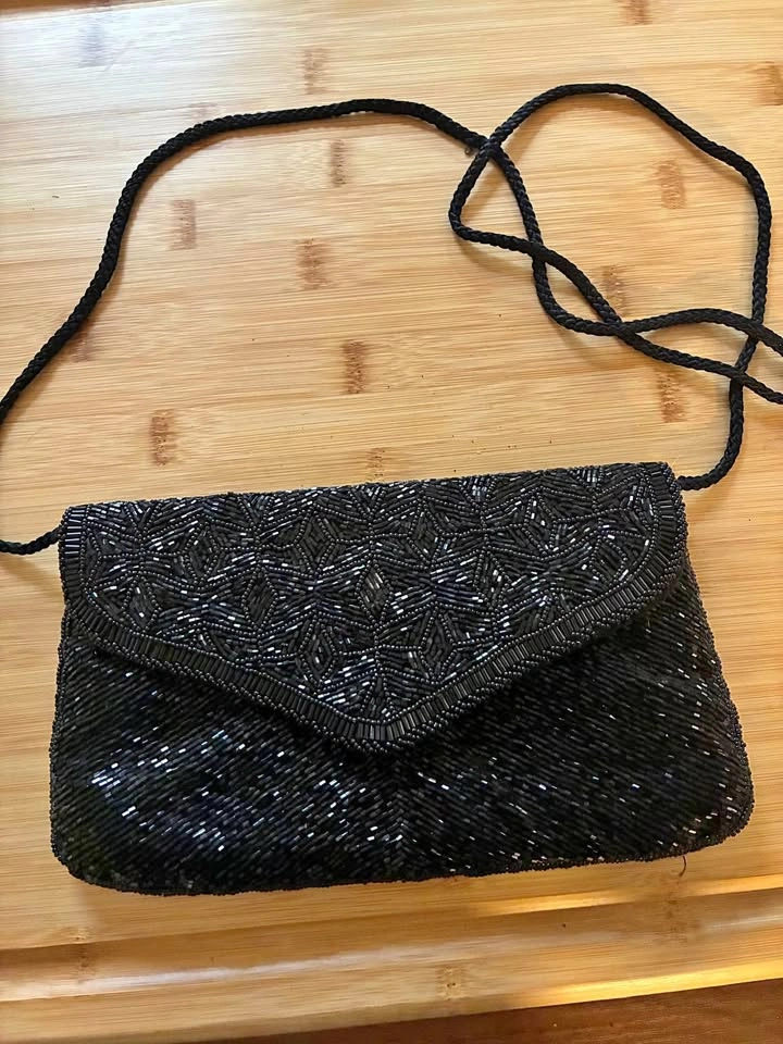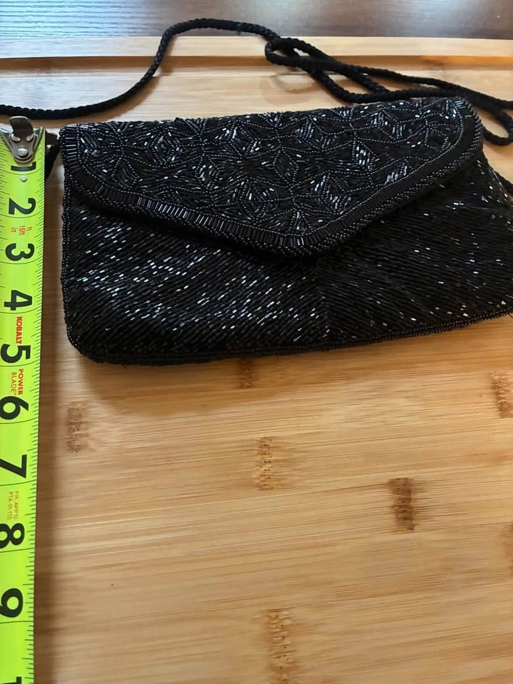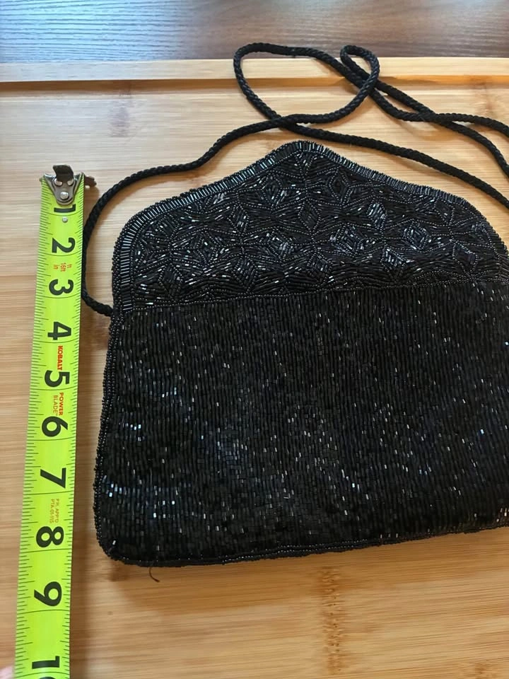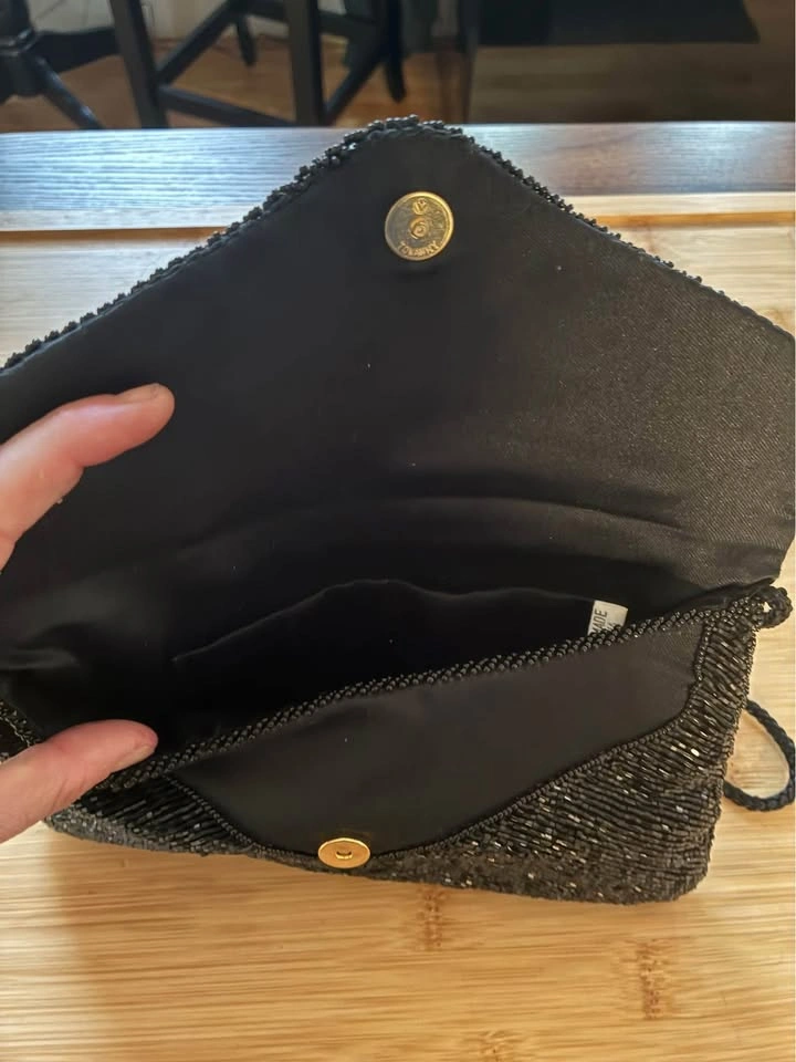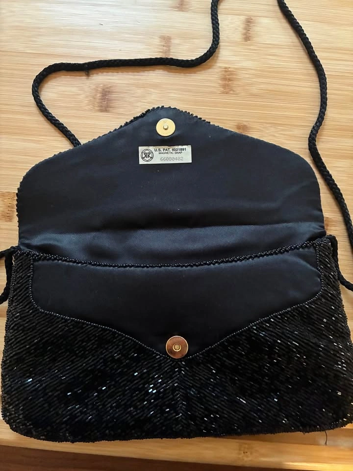 Gorgeous black beaded vintage handbag with magnetic closure. Two pockets within.