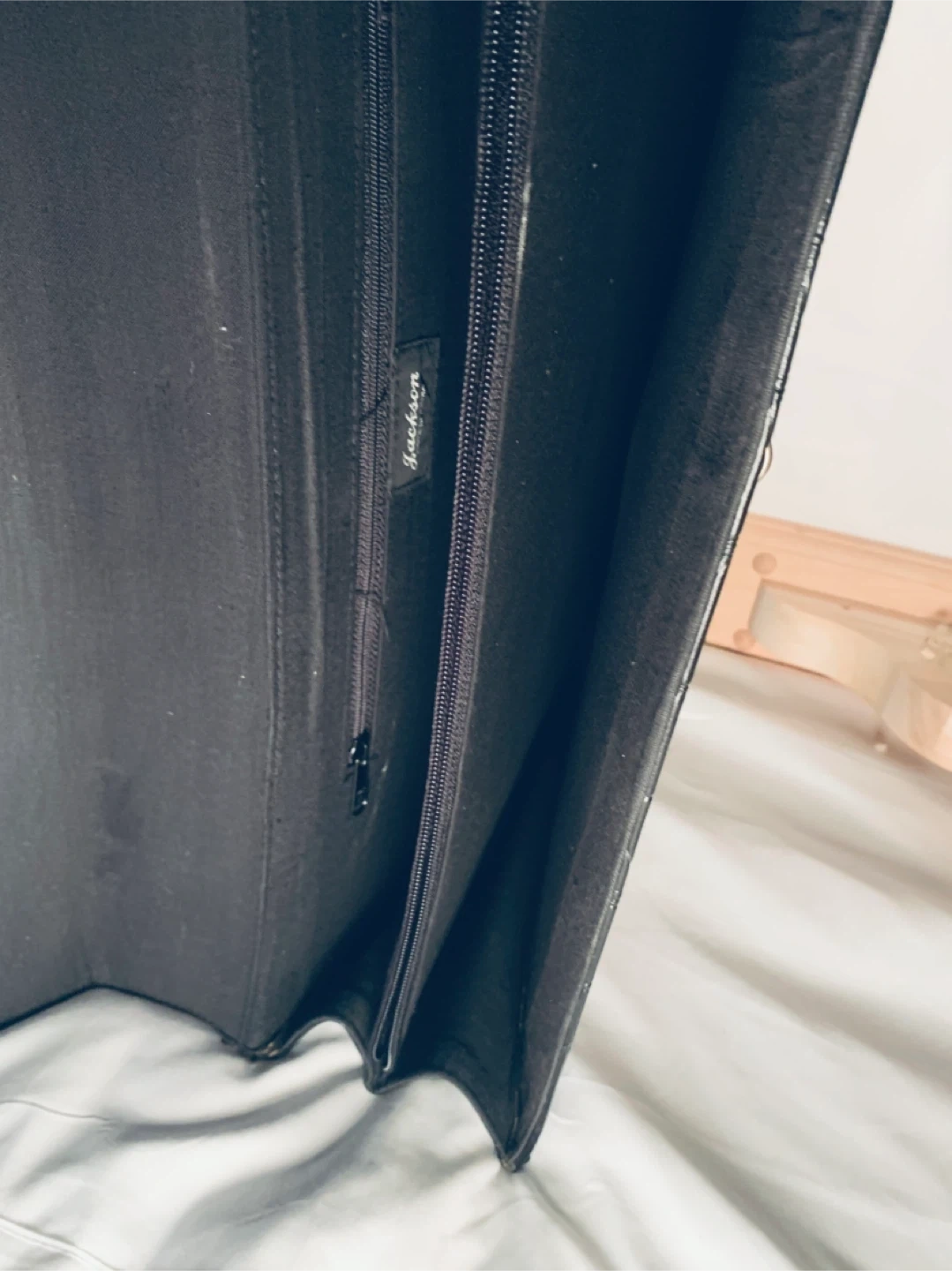 Elegant vintage-style black briefcase with crocodile-style textured exterior and gold-tone clasp. Inside features multiple compartments with zippers for organized storage. Labeled “Jackson.” Classic piece for carrying documents, a laptop, or as a stylish vintage accessory. In good pre-loved condition.