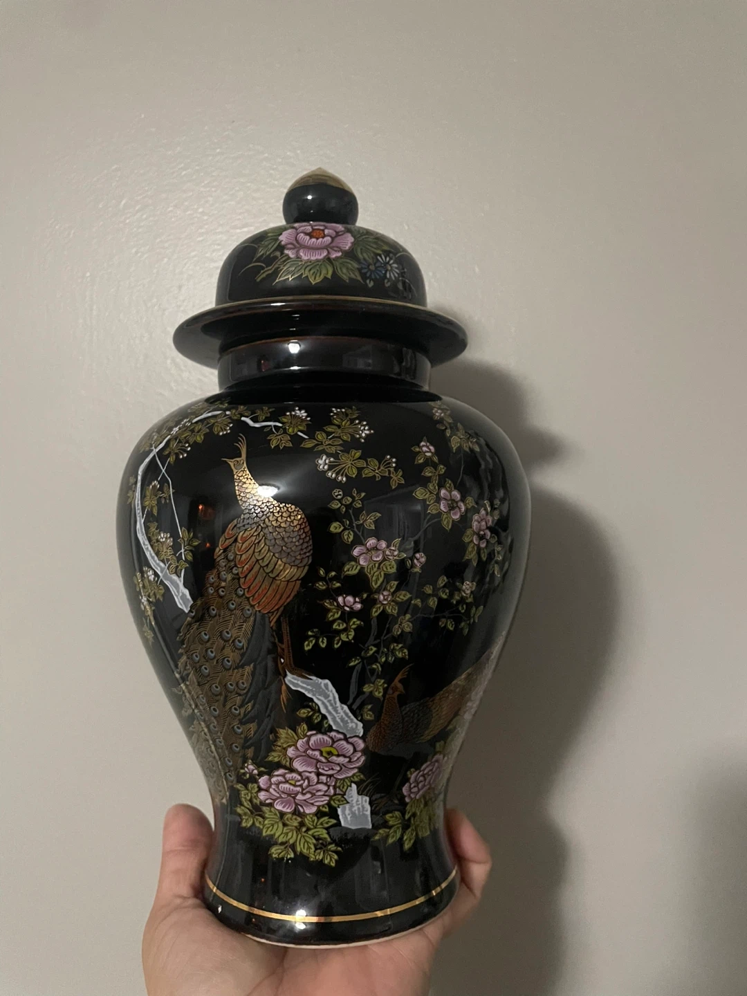 Beautiful vintage black vase with a peacock and floral design. It comes with a matching lid. Perfect for adding a touch of elegance to any room!