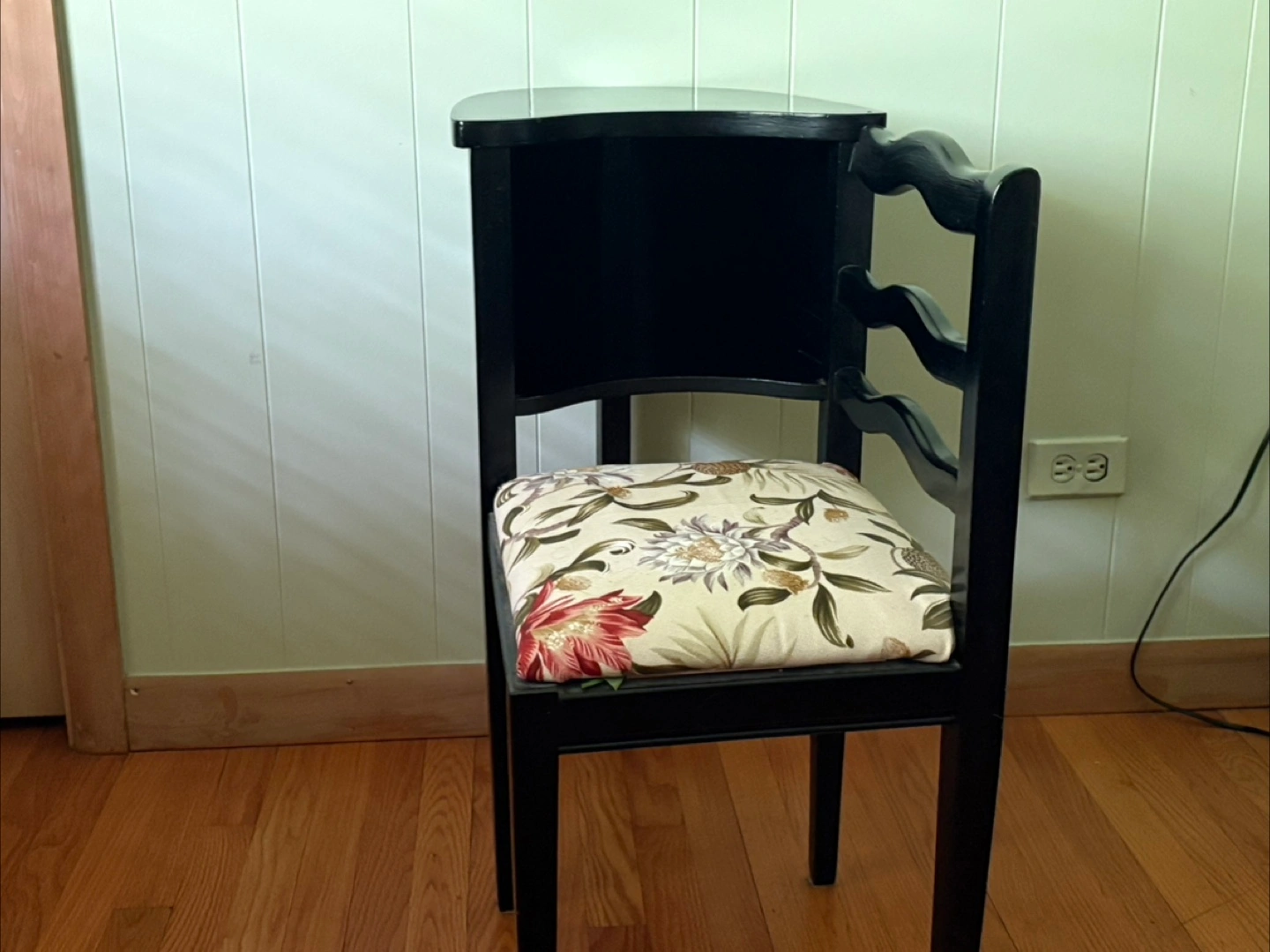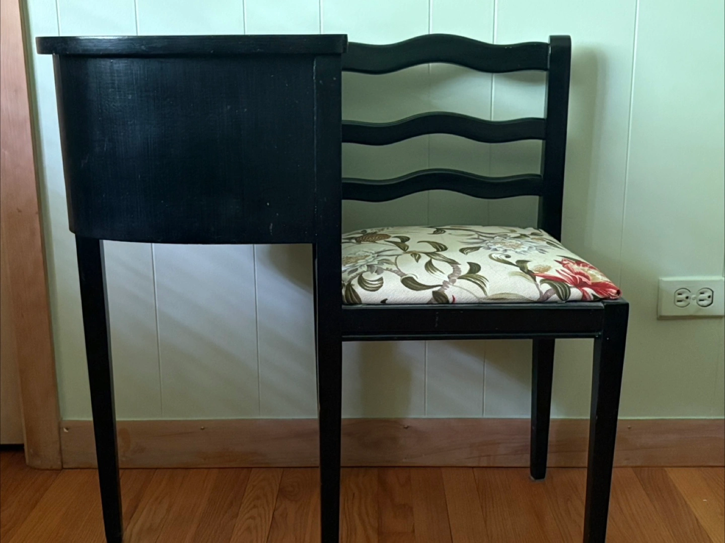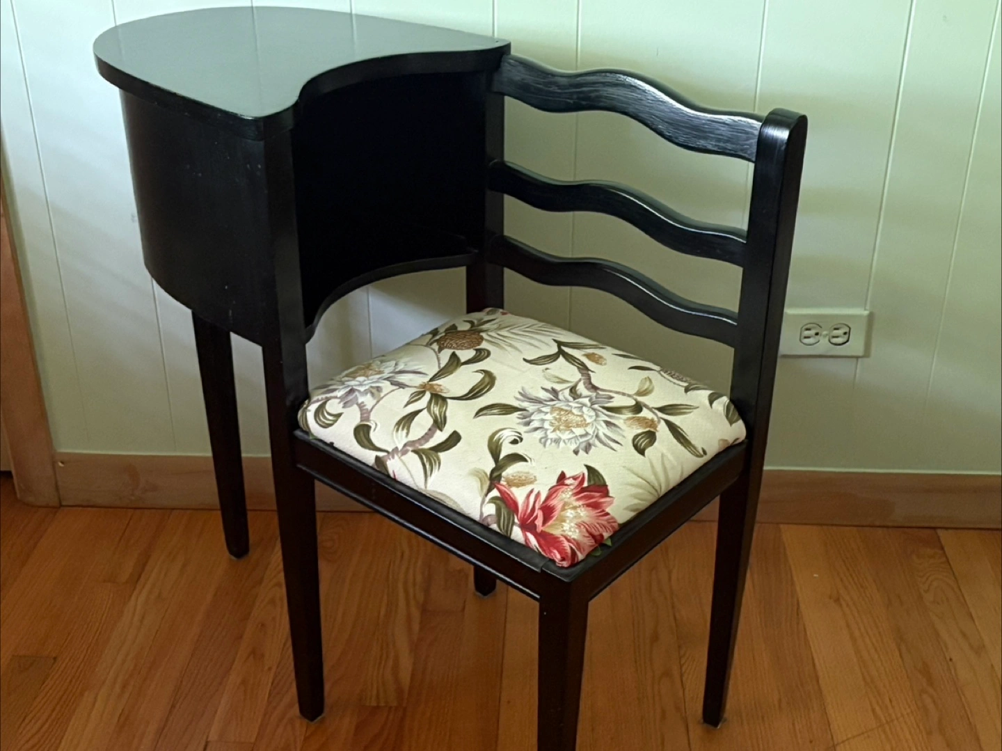 Selling a charming vintage telephone chair! It features a unique design with a side table for storing your sewing essentials. The chair has a comfortable floral cushion, perfect for long crafting sessions. The chair is black and in good condition.