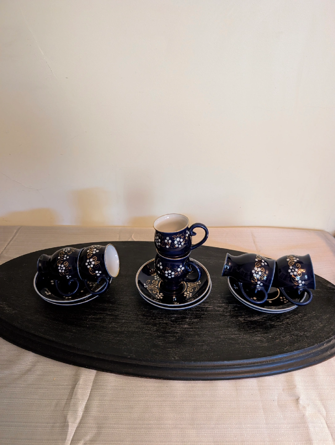 Here's a set of 6 vintage espresso cups and saucers. They are a dark blue color with a delicate floral design in white and gold. Perfect for adding a touch of elegance to your coffee routine