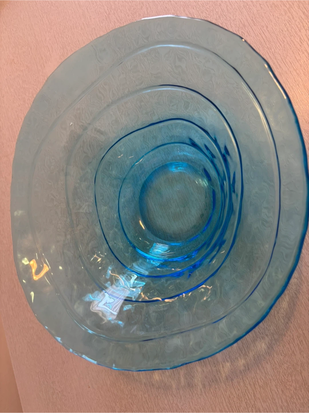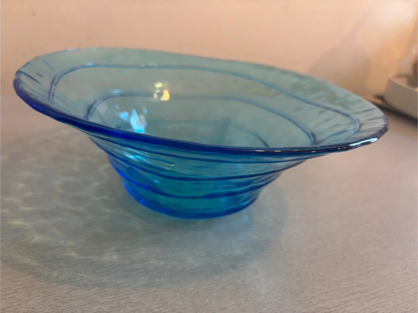 Selling a beautiful vintage blue glass bowl! It's in great condition and would look lovely as a decorative piece or serving bowl. The unique design adds a touch of elegance to any table setting