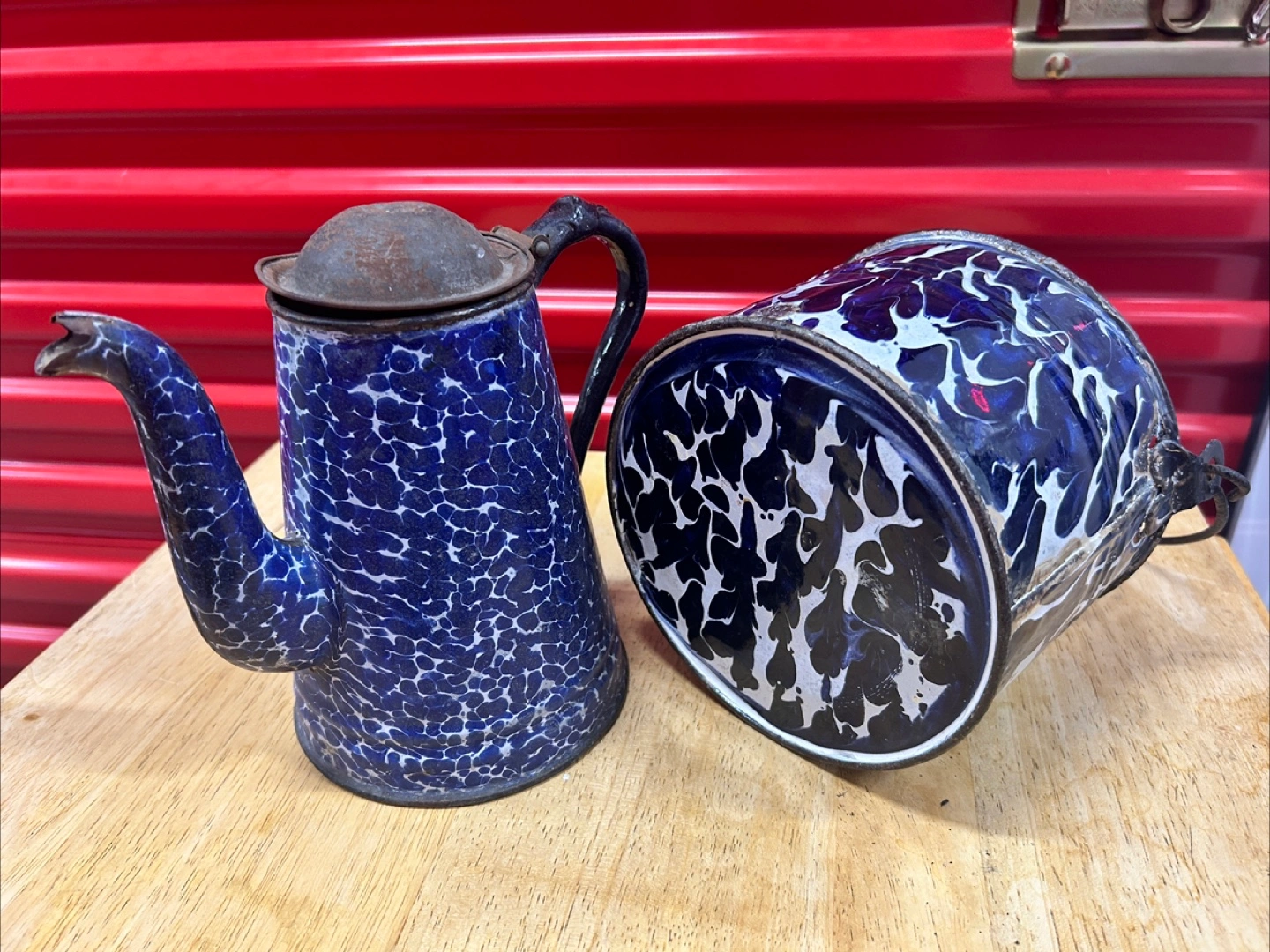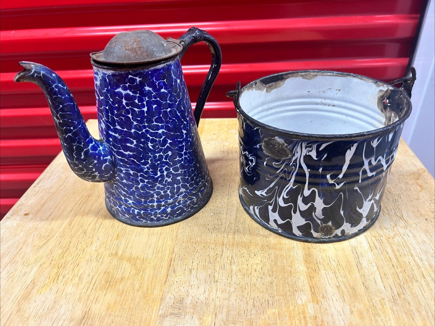 Selling a vintage enamelware set featuring a coffee pot and a bucket. The set is blue and white with a speckled pattern. They show signs of wear and age, but still have a lot of charm!