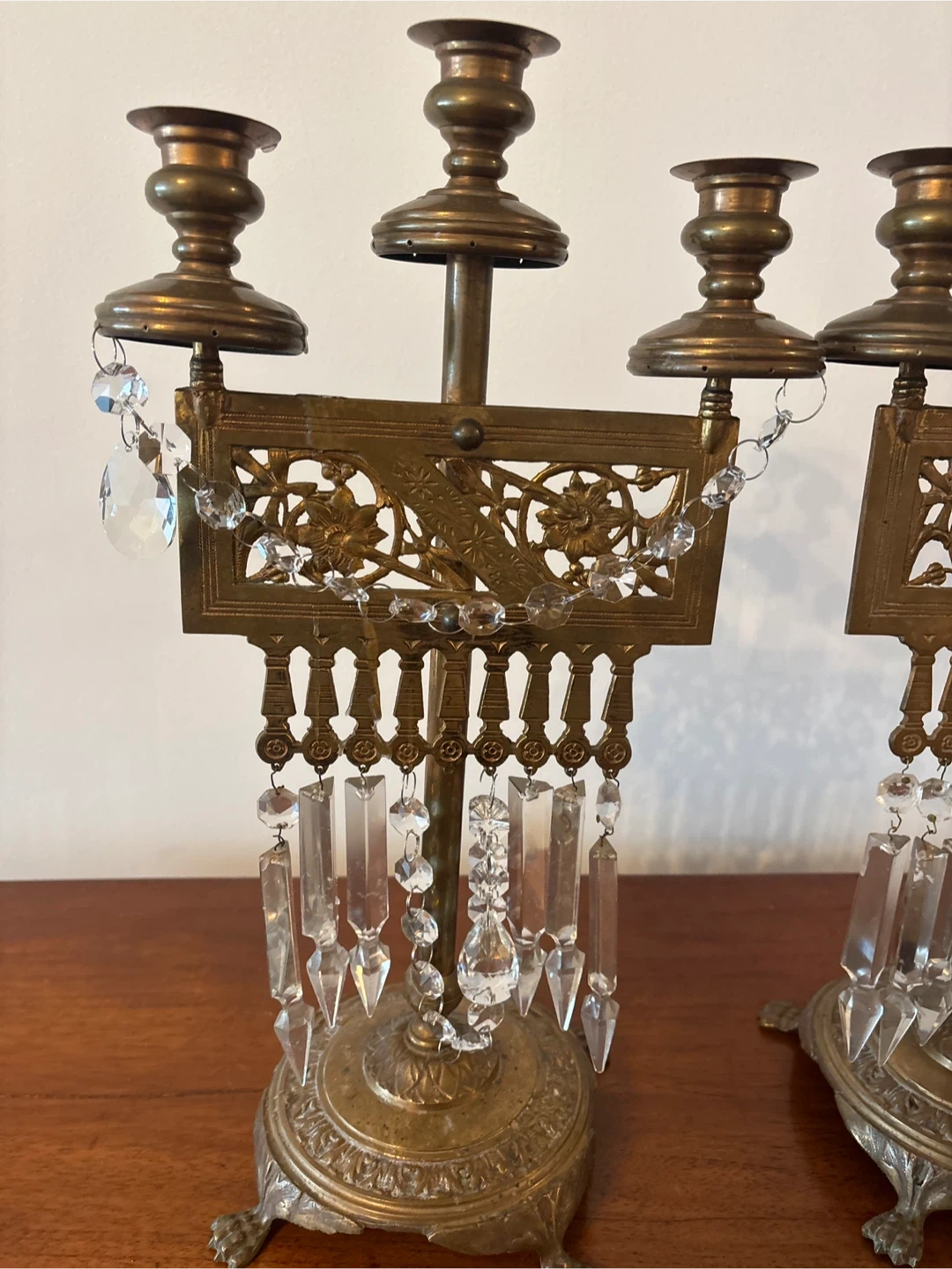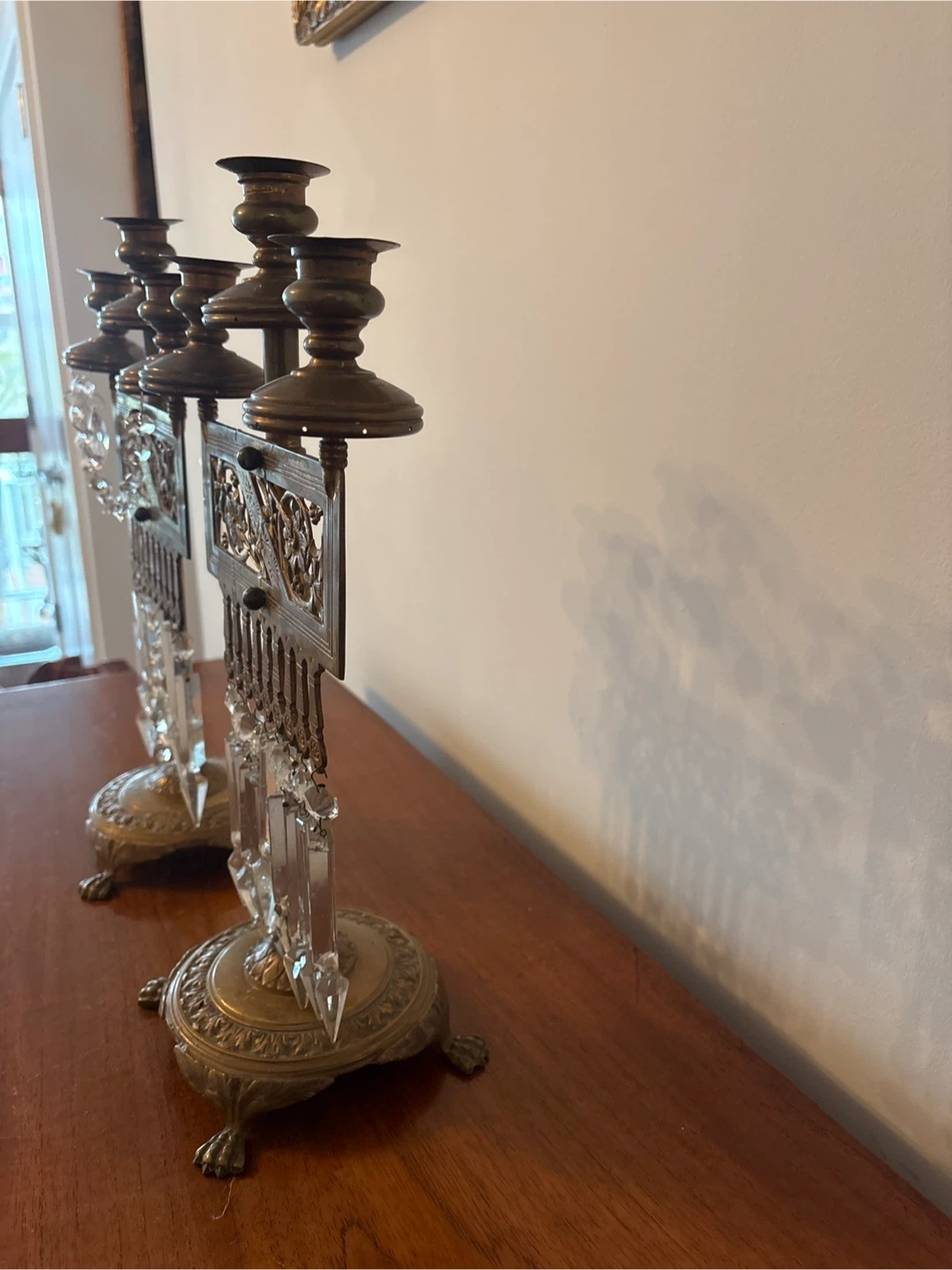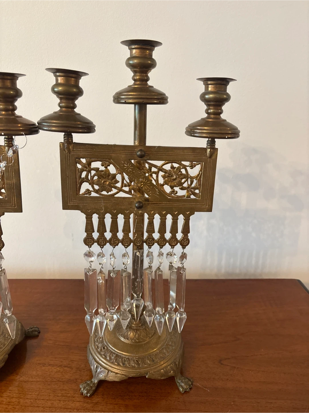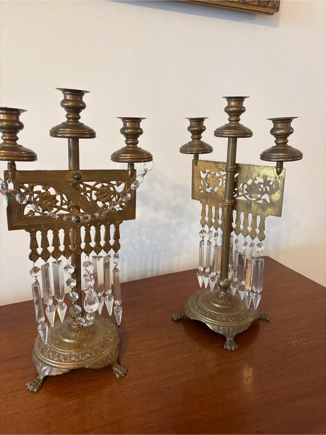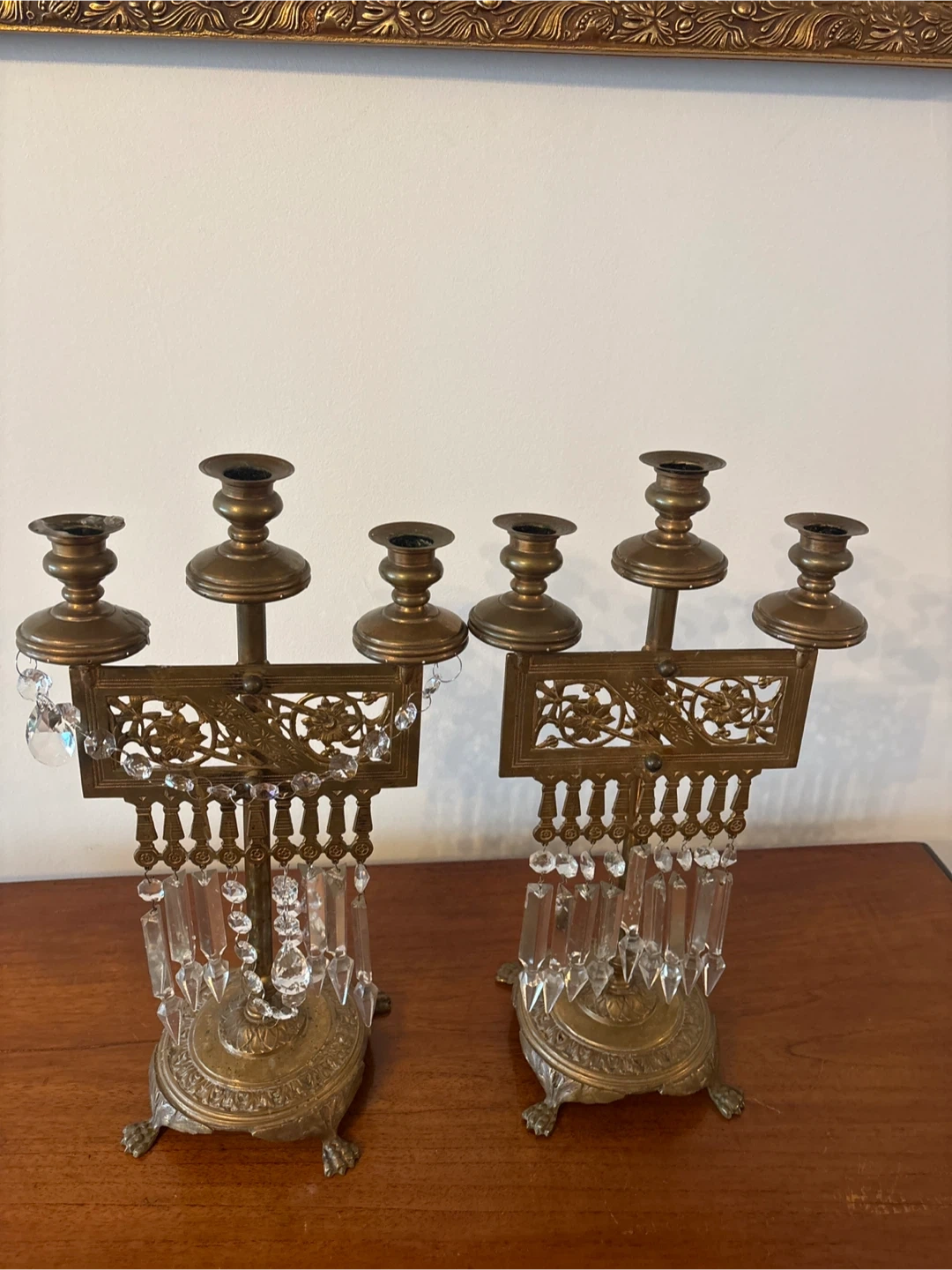 These are a pair of vintage brass candlestick holders. They feature ornate floral and designs and hanging crystals. They'd make a lovely addition to any home!