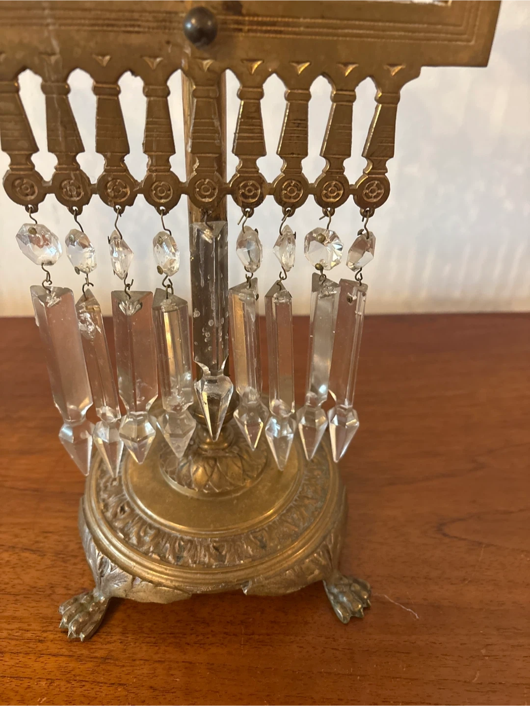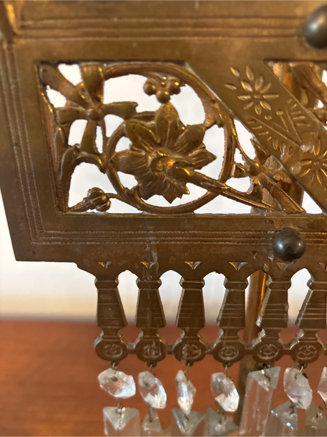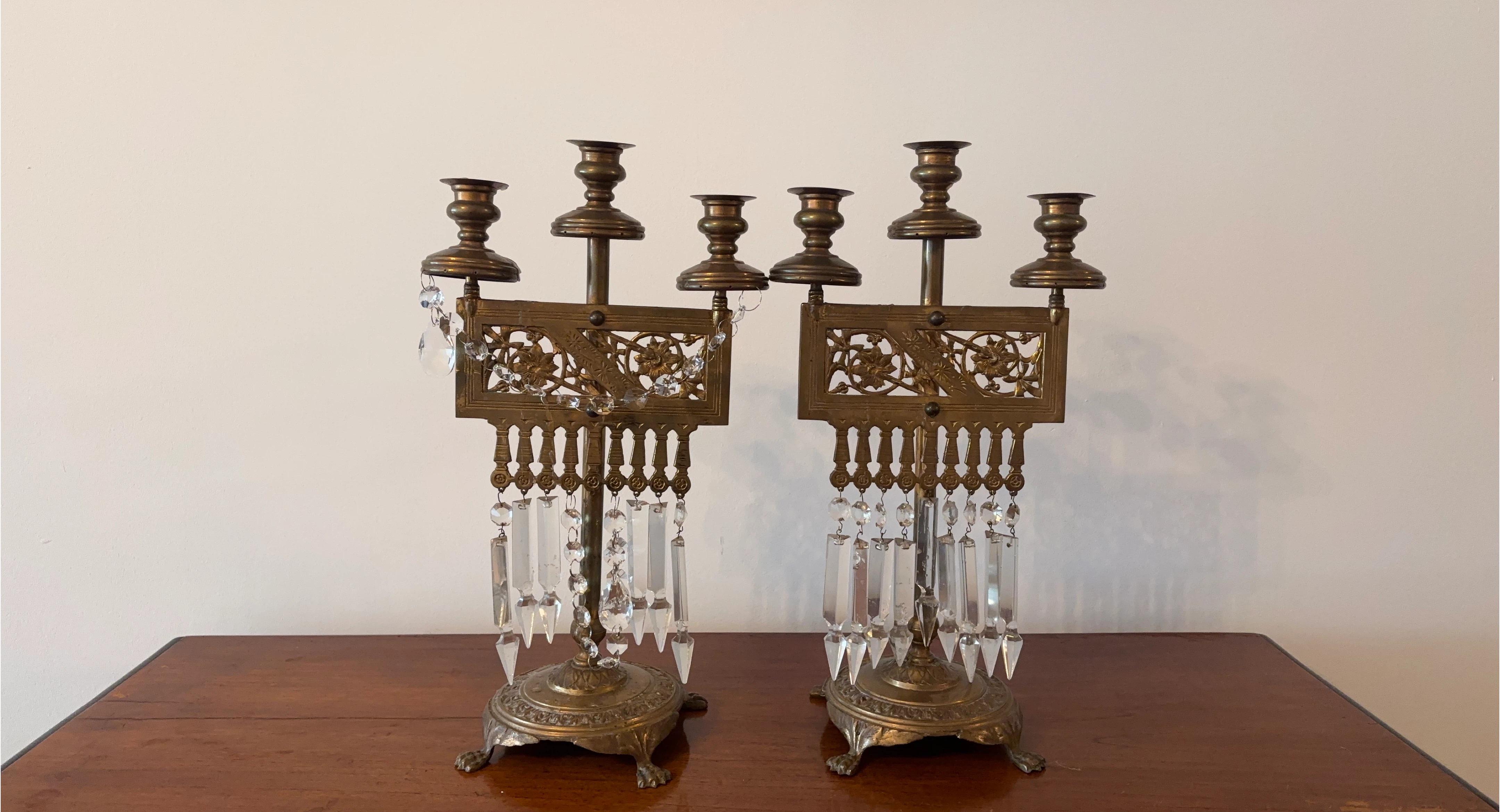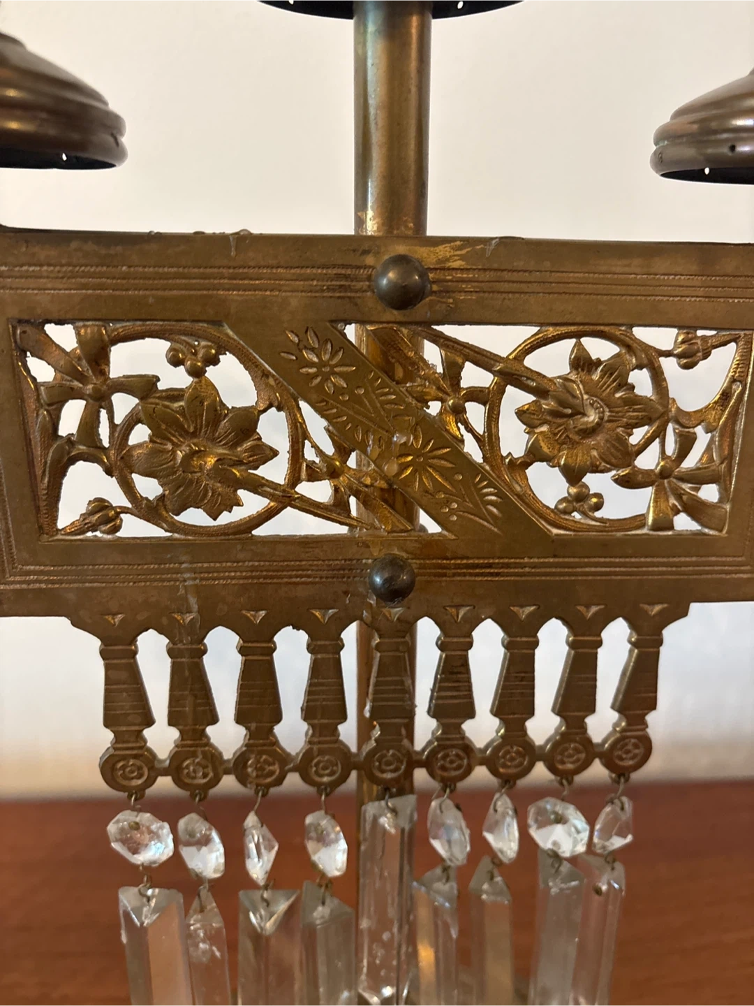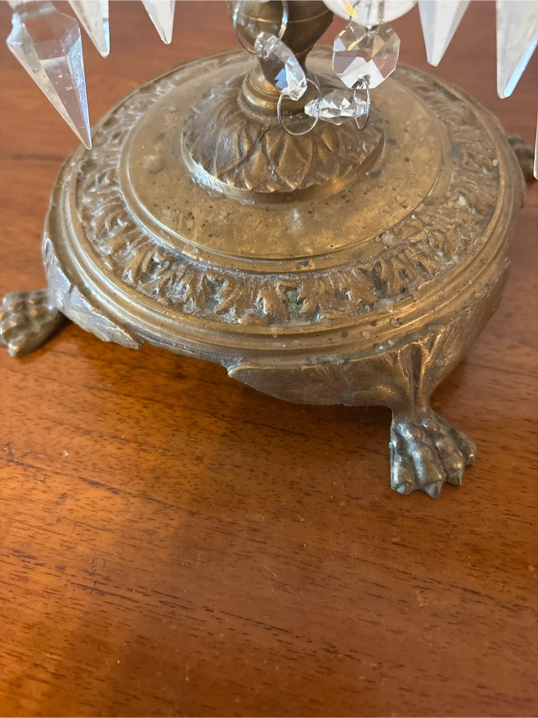 These are a pair of vintage brass candlestick holders. They feature ornate floral and designs and hanging crystals. They'd make a lovely addition to any home!