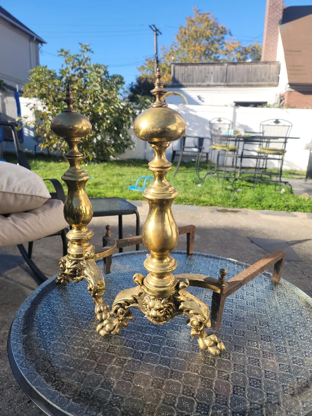 16Selling a pair of vintage brass fireplace andirons. They have a unique lion head design and are made of brass. They would make a great addition to any fireplace!
