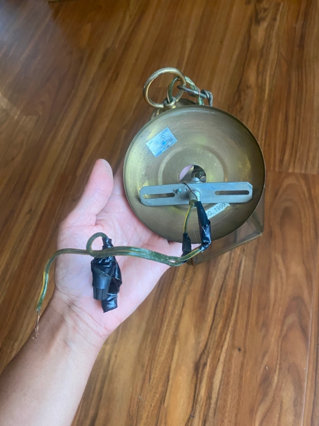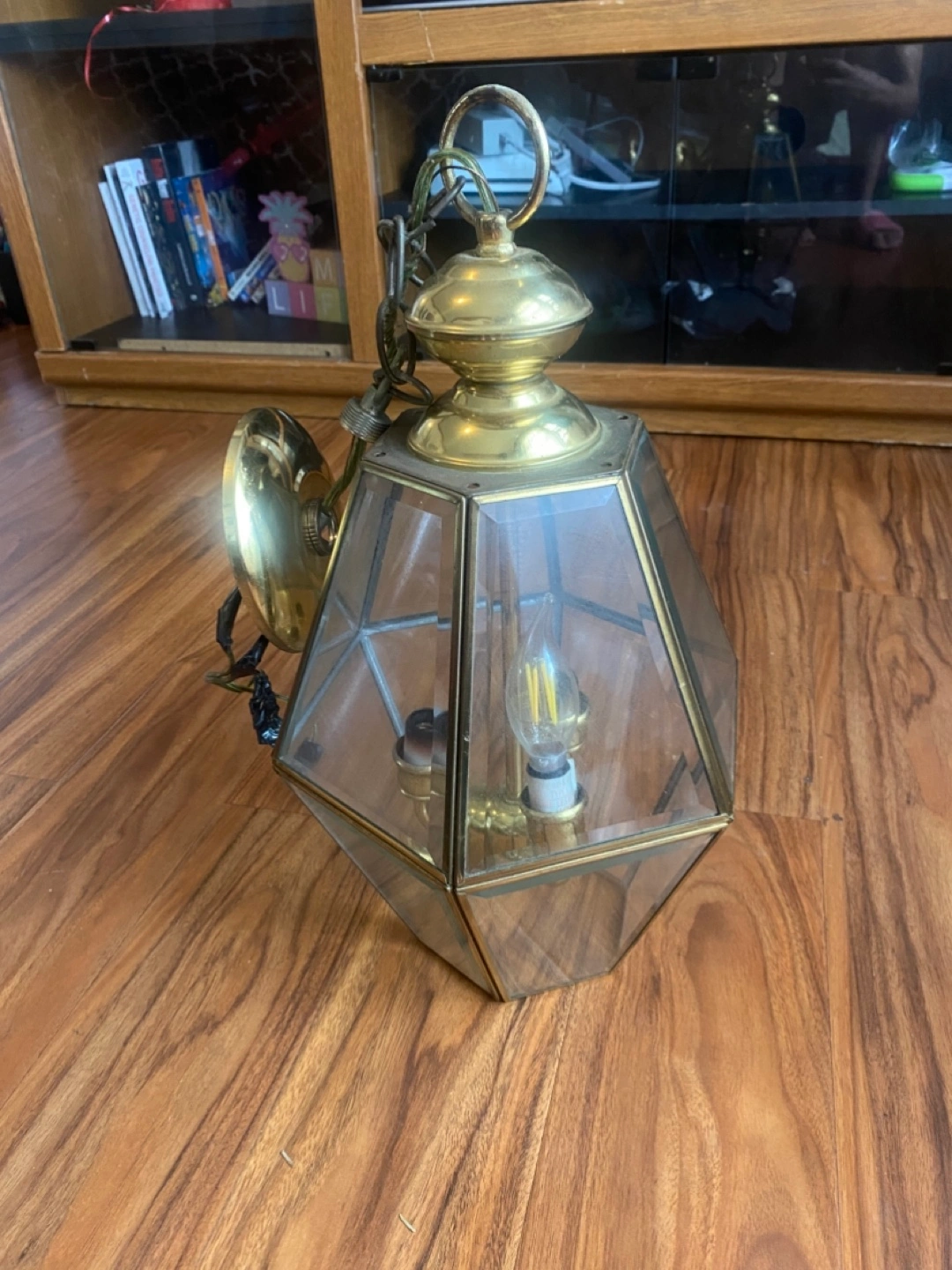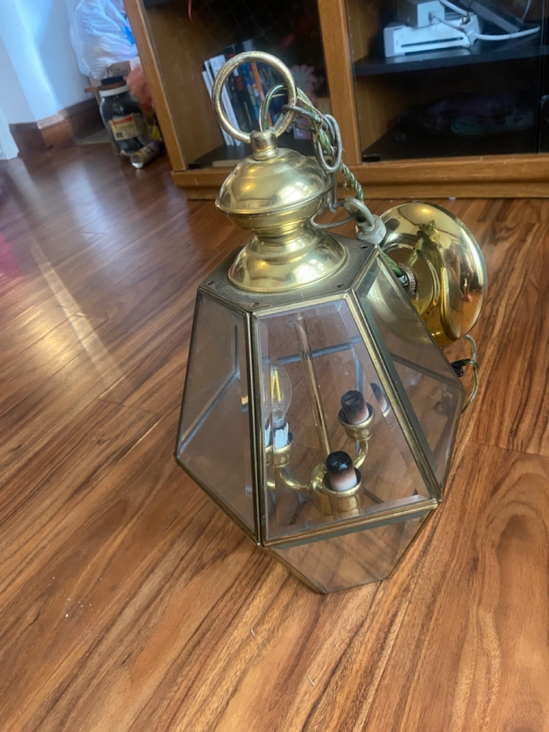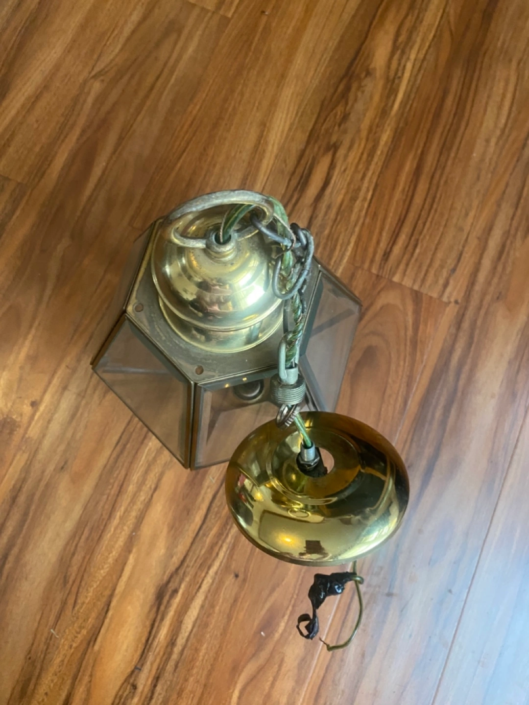 Selling a vintage pendant light with a brass finish and glass panels. It has a unique geometric shape and would add a touch of retro charm to any room. Good condition!