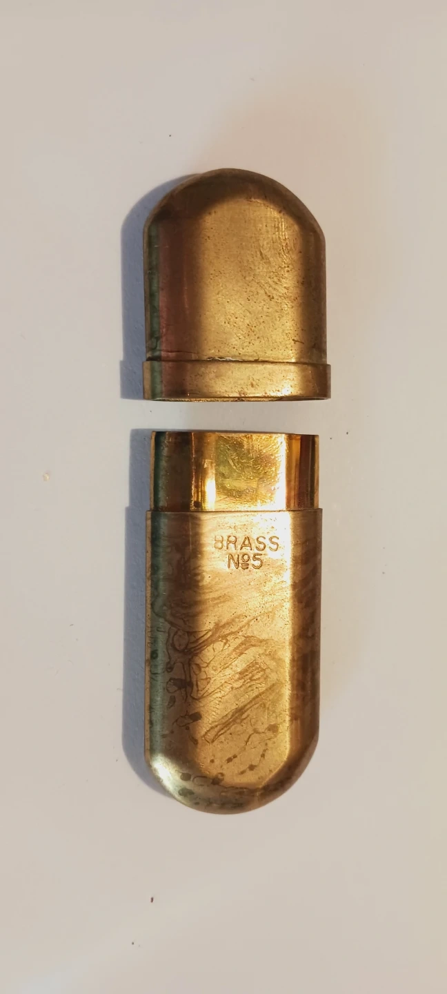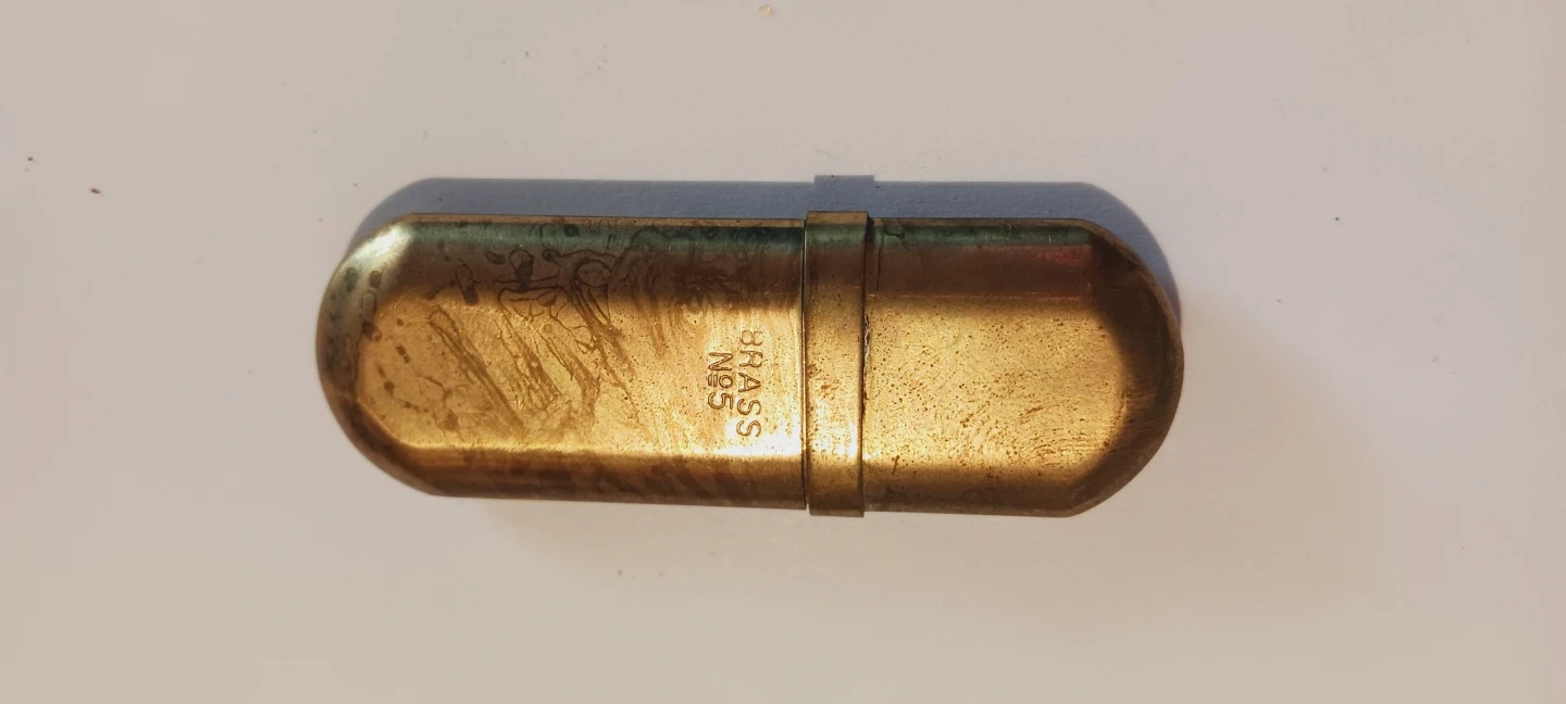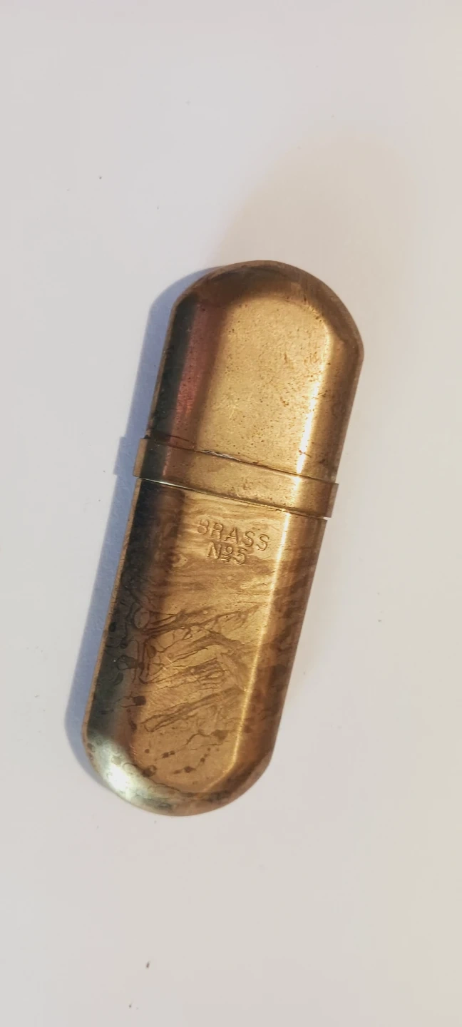 1000+Selling a vintage brass pill box. It has 'BRASS No.5' Lighter engraved on the side. It shows some wear and tear, adding to its vintage charm! 3"×1". IT IS BRASS TRINKET BOX THAT LOOKS LIKE A LIGHTER. ALL MY PRICES ARE NEGOTIABLE !!