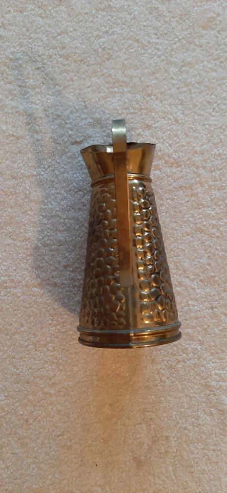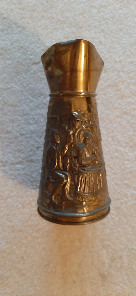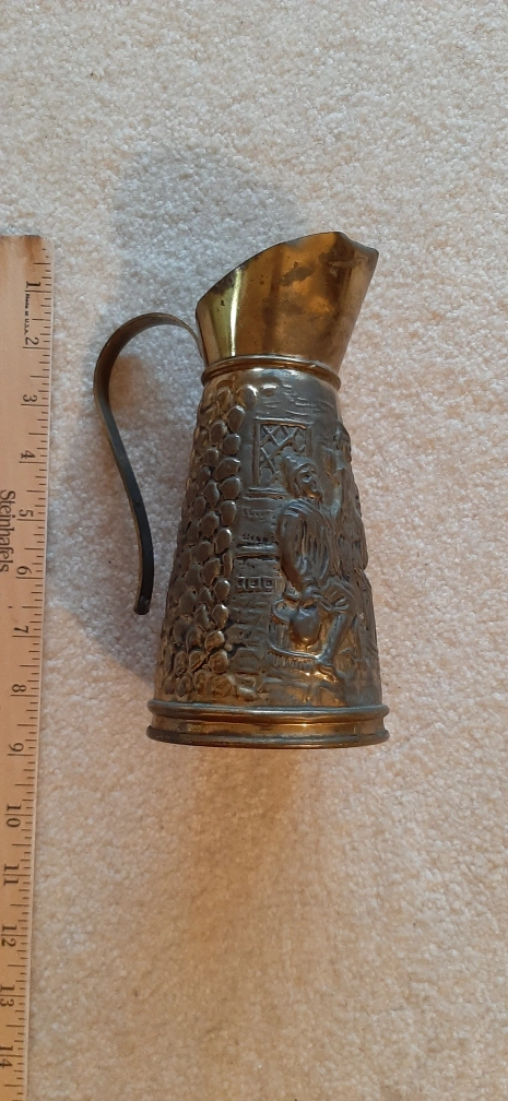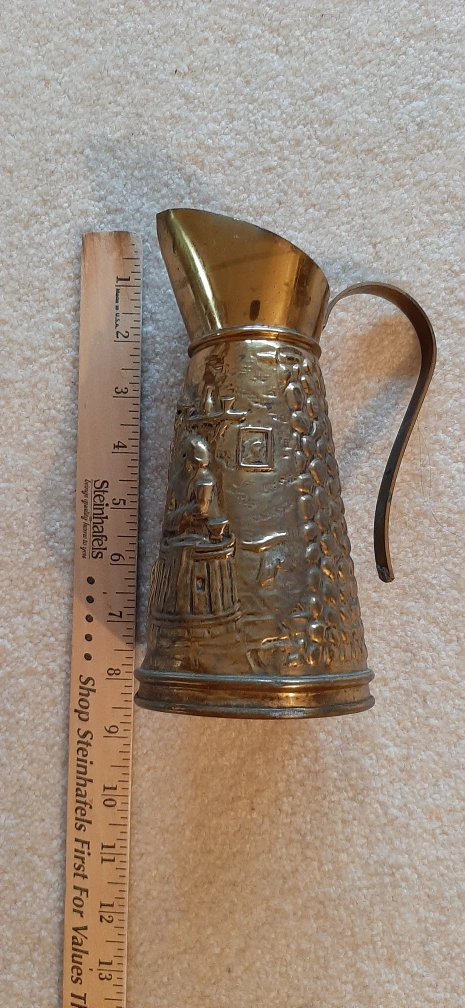 Selling a vintage brass pitcher. It has embossed figures on the side and a unique design. It measures around 5 inches tall. Great for decor or as a collectible! Marked 'Holland'