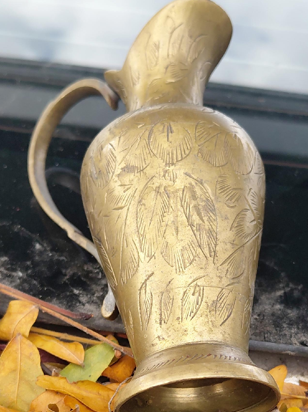 This is a vintage brass pitcher with a beautiful etched floral design. It would be a great addition to any home decor