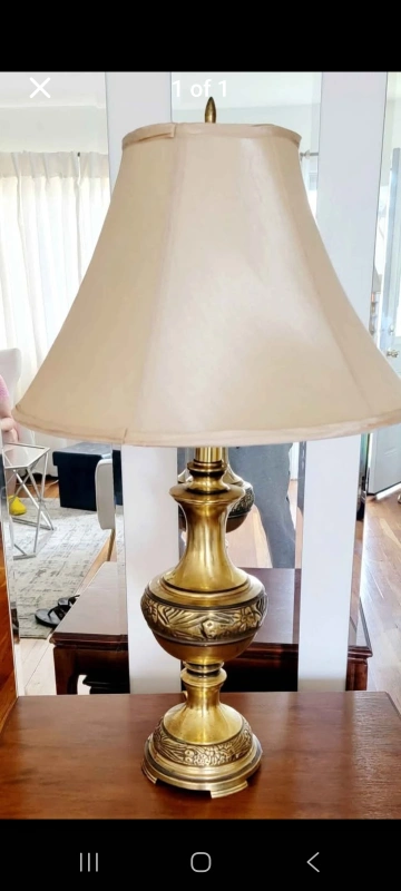 Selling a vintage brass table lamp! It features a decorative design on the base and a light-colored shade. It's a beautiful piece that would add a touch of elegance to any room