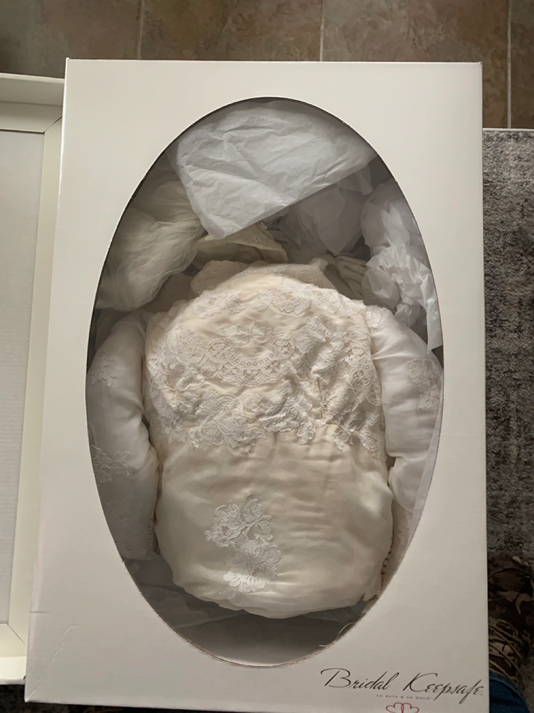 Beautiful vintage wedding dress. Lace bodice and long train. Comes in original Bridal Keepsake box. Perfect for a vintage wedding or special occasion.
