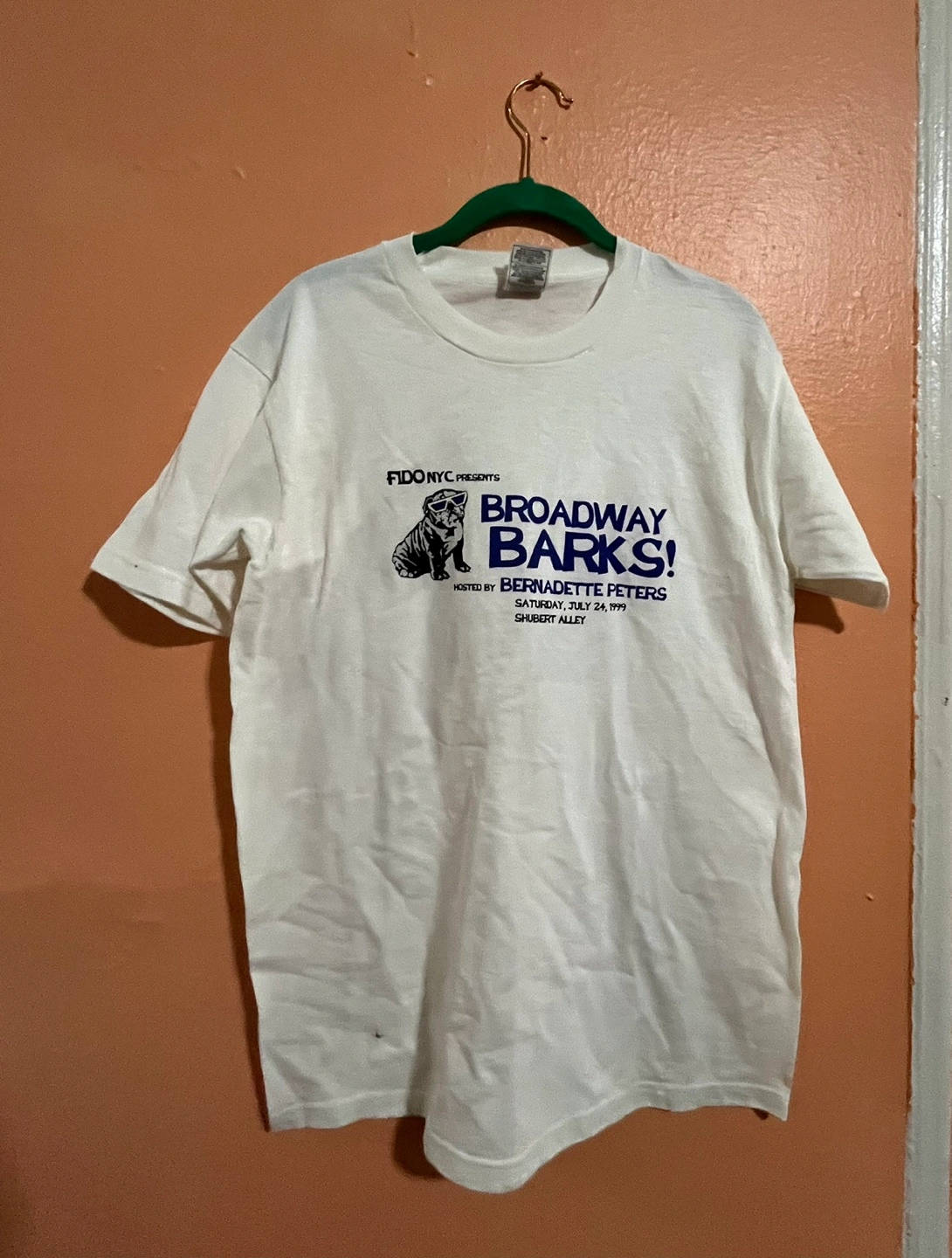 White t-shirt. Features Broadway Barks logo, Bernadette Peters, and date of event. 1999 event.