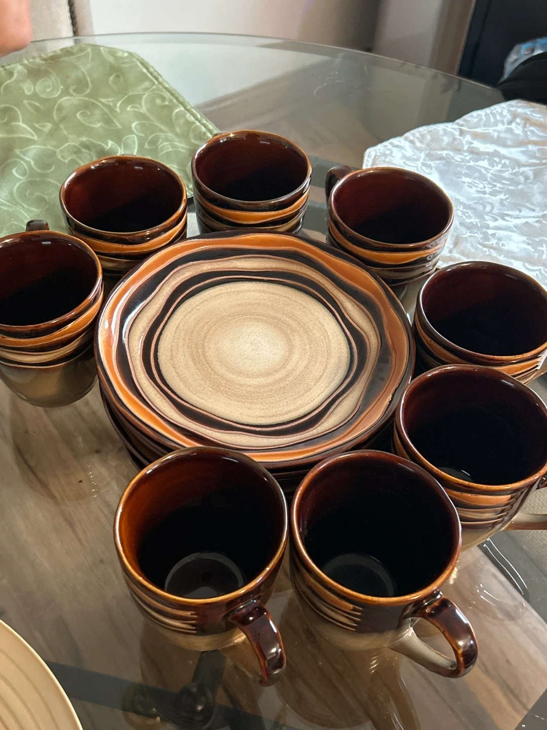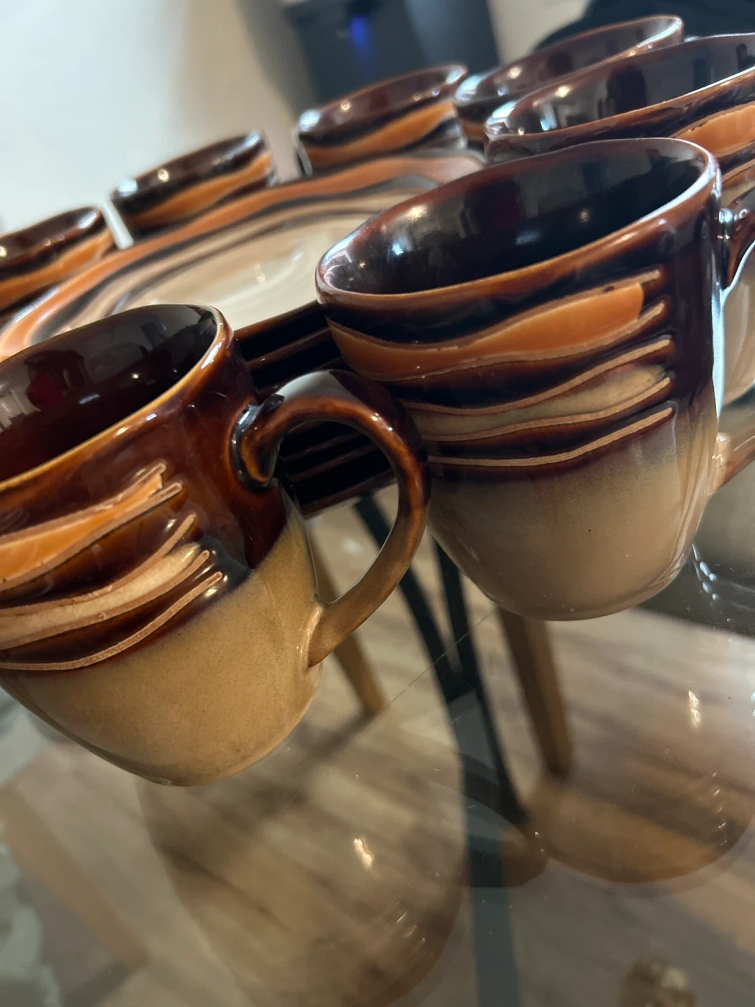 Selling a set of vintage stoneware dishes with a beautiful brown drip glaze. This set includes cups and plates, perfect for adding a retro touch to your kitchen or dining area. The unique glaze pattern and earthy tones make these dishes a standout addition to any collection 7 plates 7 Cups