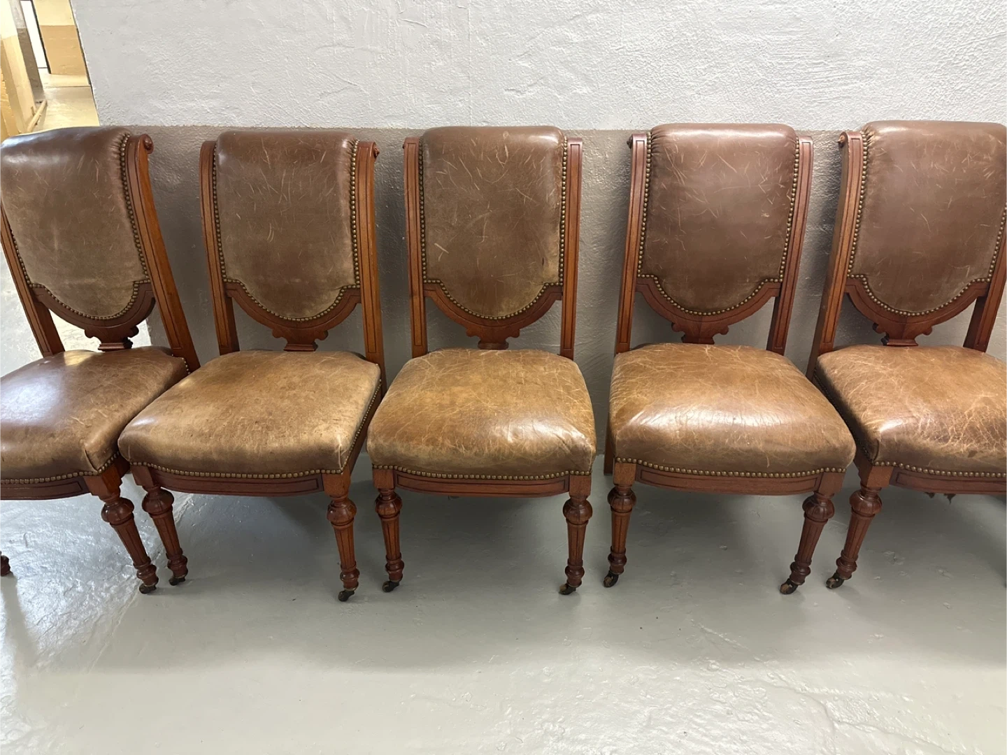 Set of 5 vintage dining chairs with brown leather seats and backs. These chairs have a classic design with wood frames and brass tack detailing. They show some signs of wear, adding to their vintage charm