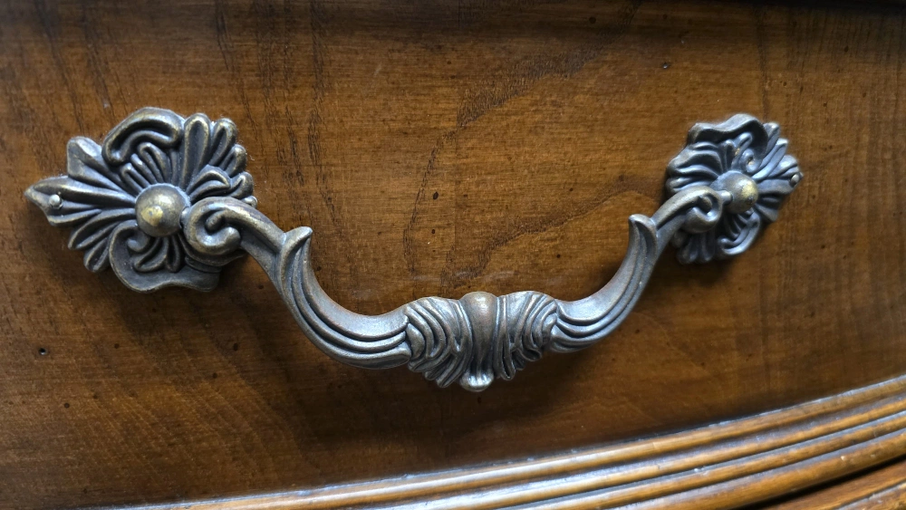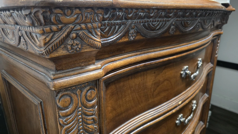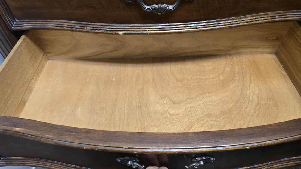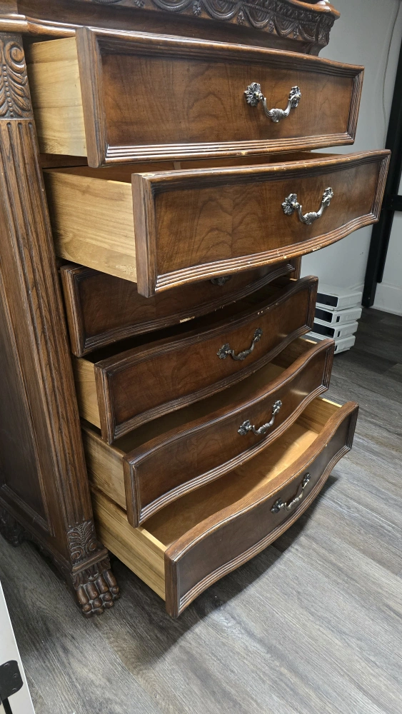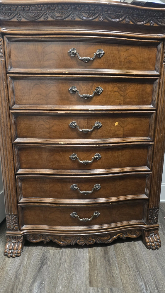 Selling a vintage five-drawer dresser with a classic brown wood finish. It features ornate drawer pulls and detailed carvings along the top and sides. Perfect for adding a touch of elegance to any bedroom! Payment only accepted at the time of purchase after you have seen and tested. will not accept any payments or request for personal information. Until you've seen the item. cash zelle venmo