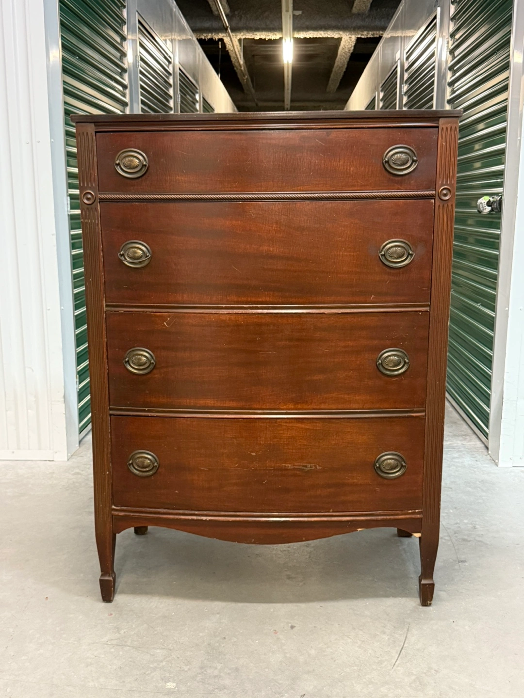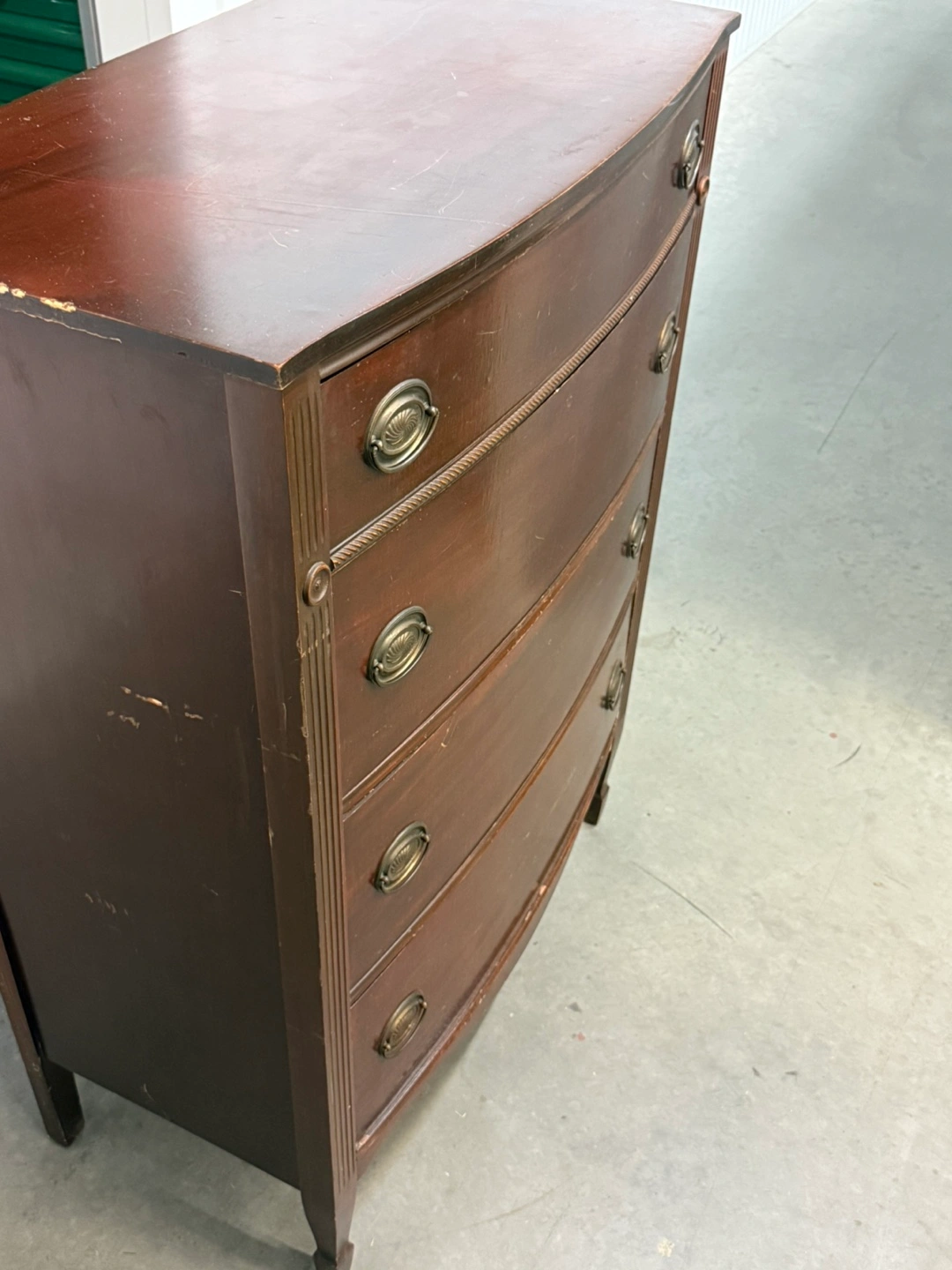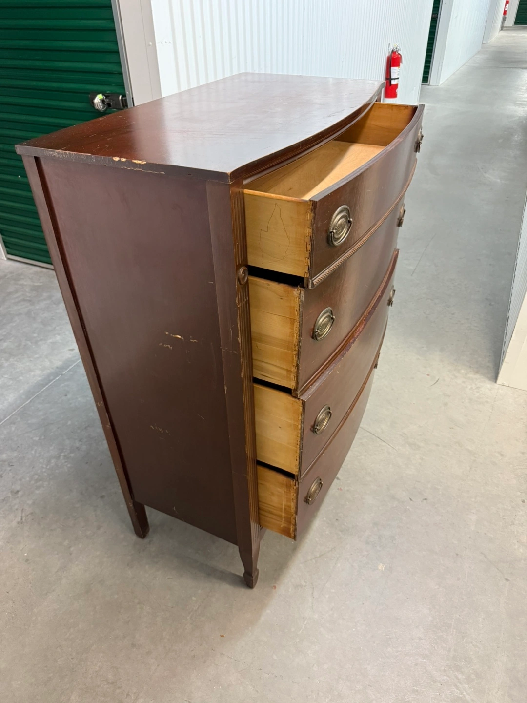 27VINTAGE BROWN WOODEN DRESSER Selling a vintage brown wood dresser with five drawers. It has a classic design with decorative drawer pulls and carved details. It shows signs of wear and use, but it's still a functional and stylish piece of furniture. EVERYTHING WORKS GREAT. Very sturdy piece —— MEASUREMENTS H - 48 inches W - 35 inches in D - 19 inches ——- DELIVERY - available for an additional charge —— PICKUP - in zipcode 11249 or 10704