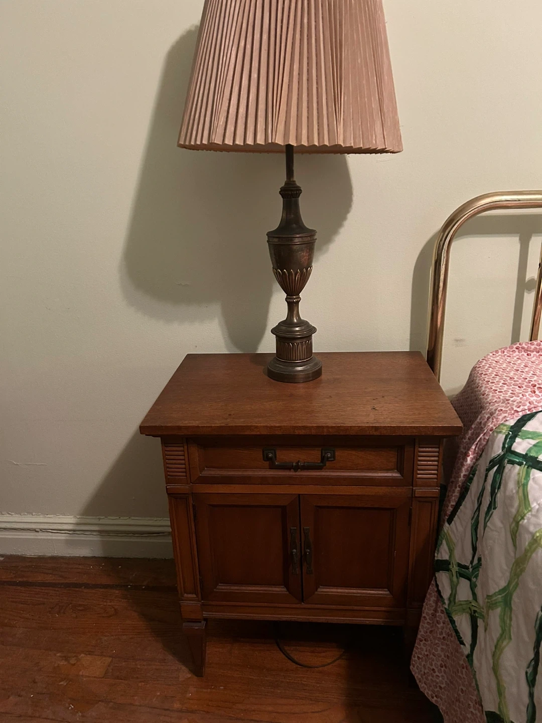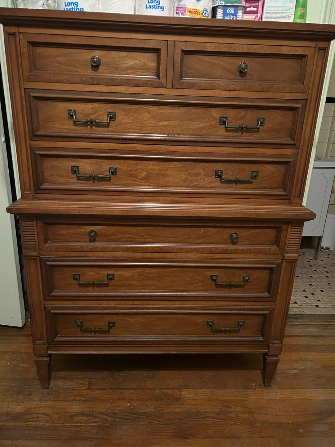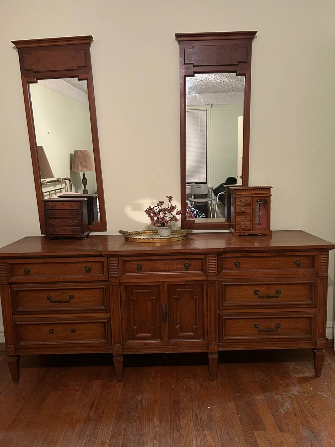 60Selling a vintage bedroom set with a rich brown wood finish. The set includes two nightstand, a tall dresser with multiple drawers, and a wide dresser with attached mirrors. All pieces feature classic hardware and detailing. Perfect for adding a touch of vintage charm to your bedroom!