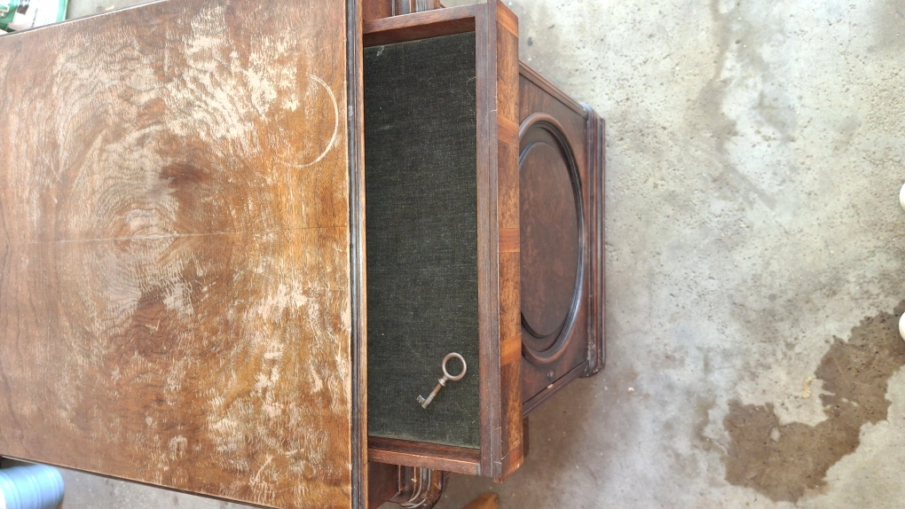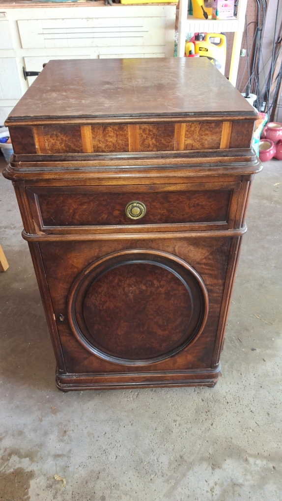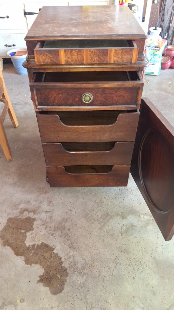 Selling a vintage brown wooden cabinet. It has a drawer and several shelves. It would be great for storage or as a unique piece of furniture. Has "secret" drawer for security.