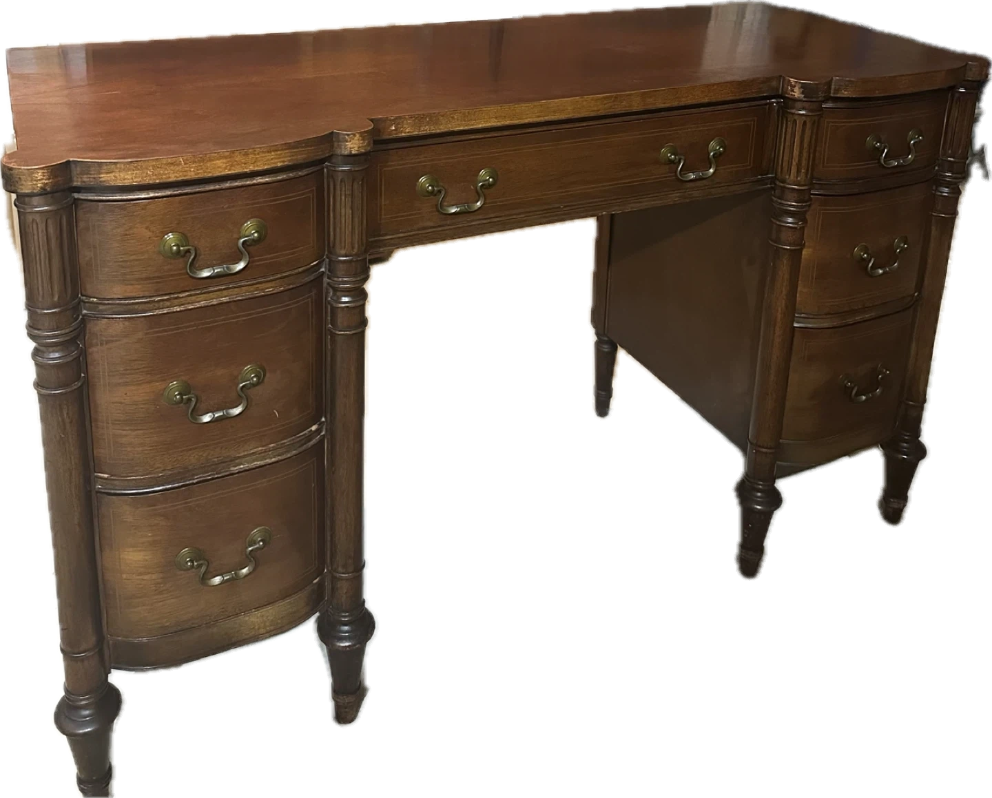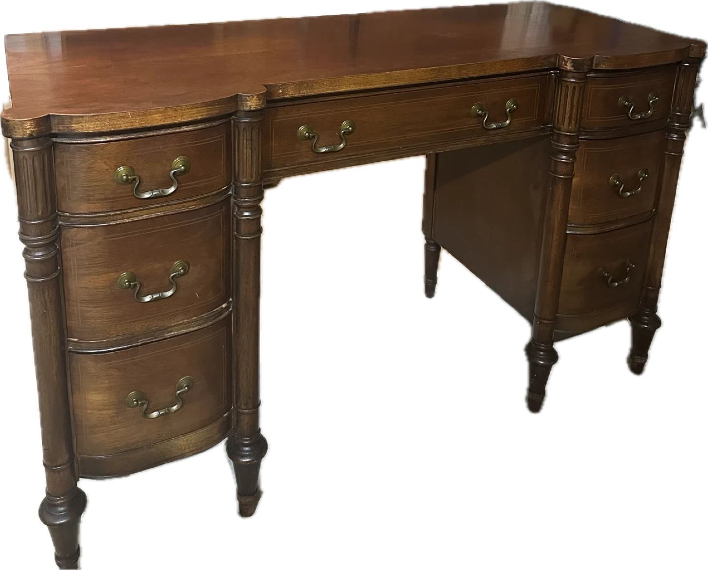 10Selling a vintage genuine mahogany wooden desk. It features multiple drawers for storage and a classic design. The desk shows some signs of wear consistent with its age, but it's still a sturdy and beautiful functional piece of furniture