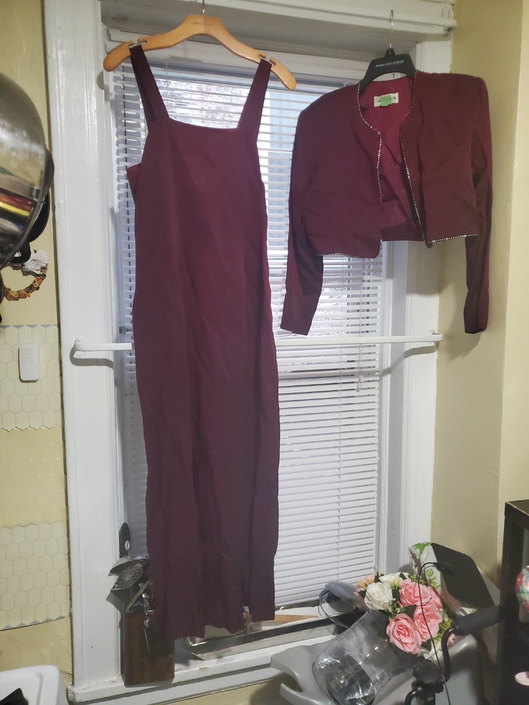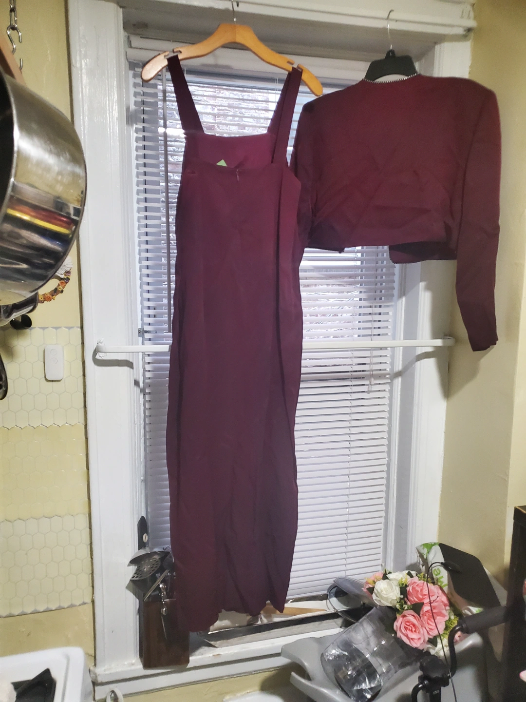 Beautiful burgundy gown and bolero set. Long gown with thin straps. Matching cropped bolero jacket with long sleeves. Perfect for special occasions dry clean already!