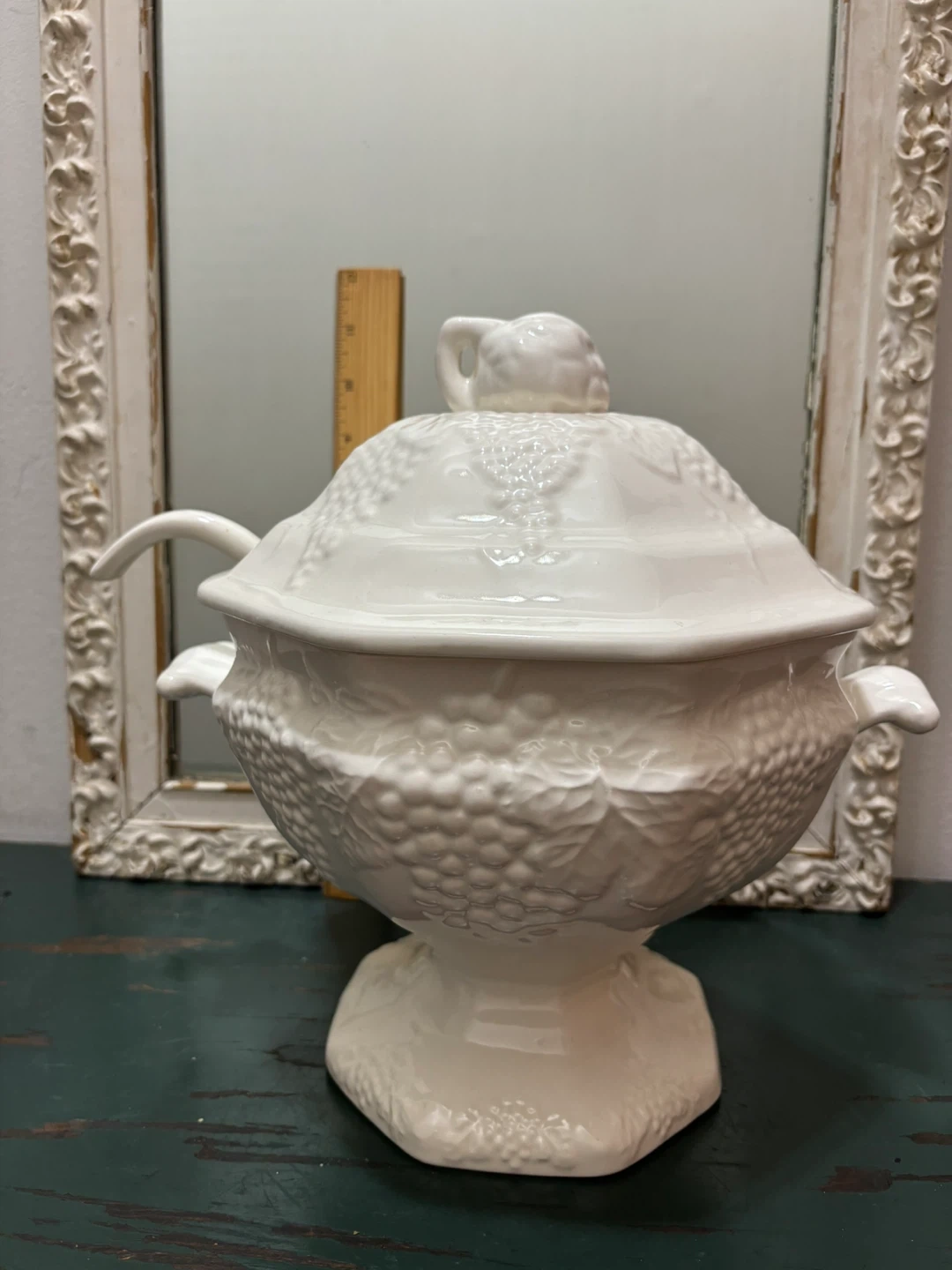 This large white ceramic tureen set from CALIFORNIA POTTERY is in the grapevine pattern and a beautiful vintage find. Use for soups, stews or as a table centerpiece adding an elegant and stylish touch to any decor. 11 inches H 8 inches W Like-new condition Made in USA $40 Cash & carry Smoke & pet-free home UES or Midtown