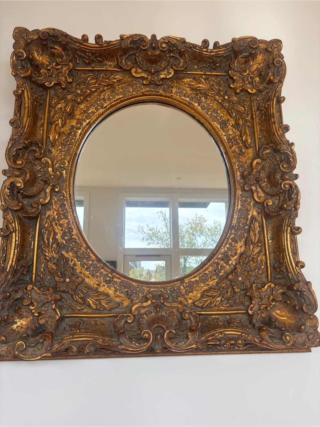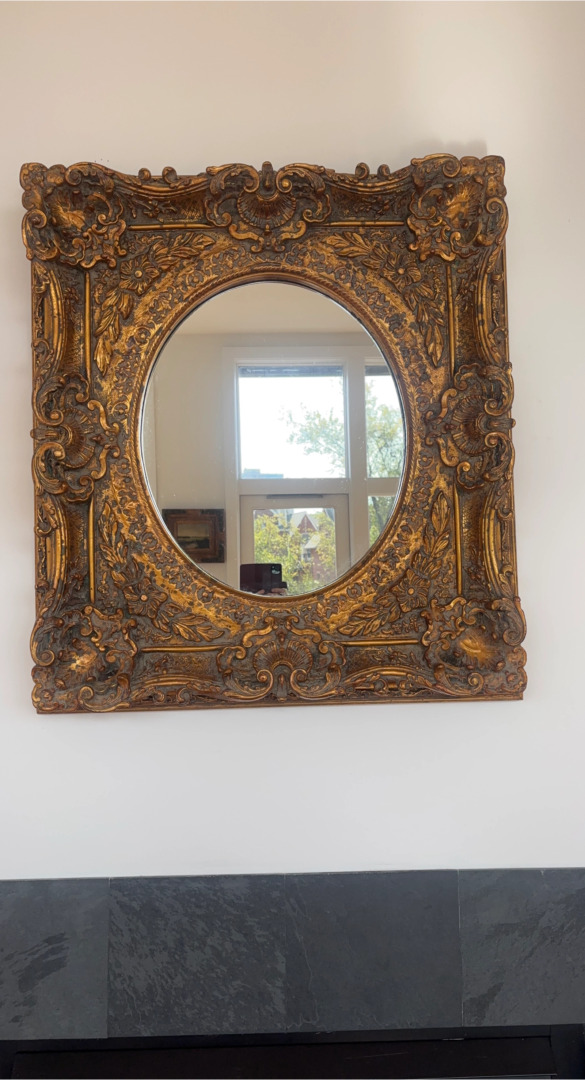 Beautiful very unique ornate mirror with a gold frame. The frame has intricate details and a vintage look. It would be a great addition to any room!