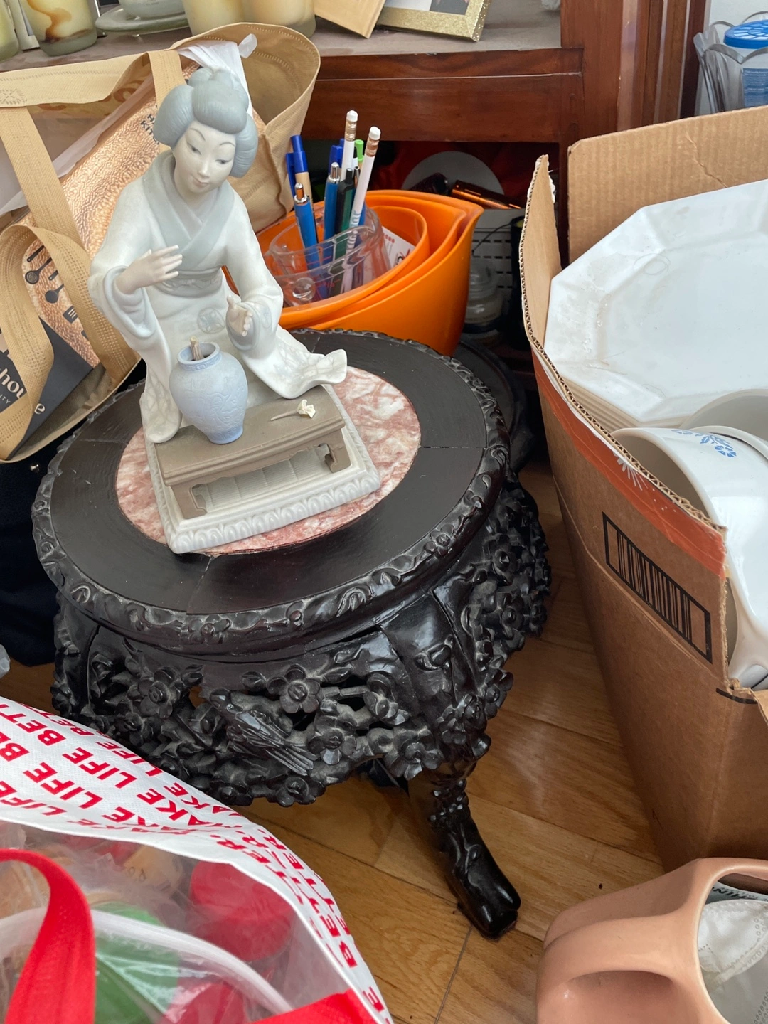 Beautiful carved wooden table. Includes a porcelain figurine of a woman with a vase. This would look amazing in a living room as a decorative piece.