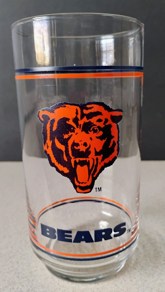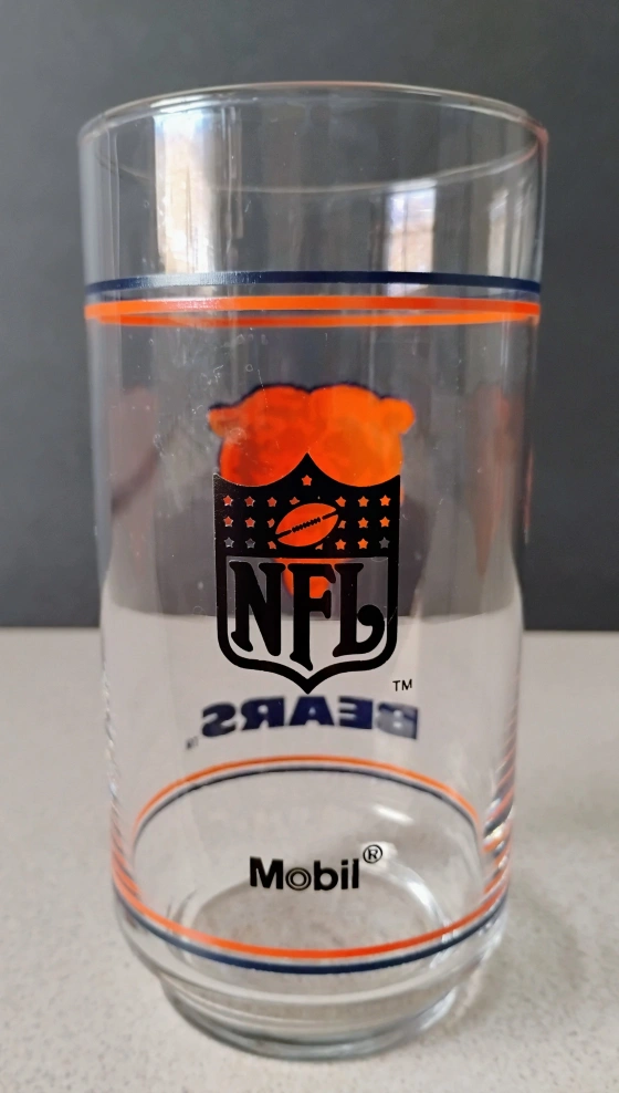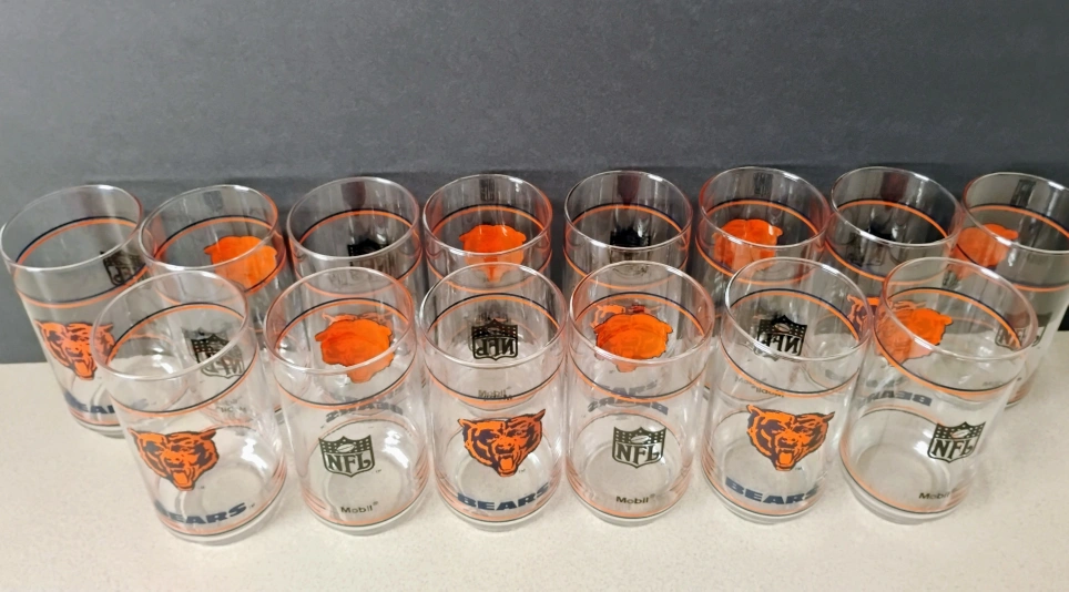 Circa 1990’s Set of 14 drinking glasses. Chicago Bears logo on one side and the NFL logo on the opposite side. 5-1/2” high. 16 ounce capacity. Never used – like new condition. They have been in a display case ever since my father started collecting them in the 1990’s when buying gasoline at Mobil stations! Not cloudy, no chips or cracks. The logos are not faded or worn away. Non-smoking and pet free home. CASH ONLY at time of pick-up in Gilberts, IL. No other form of payment accepted. No delivery or shipping available.