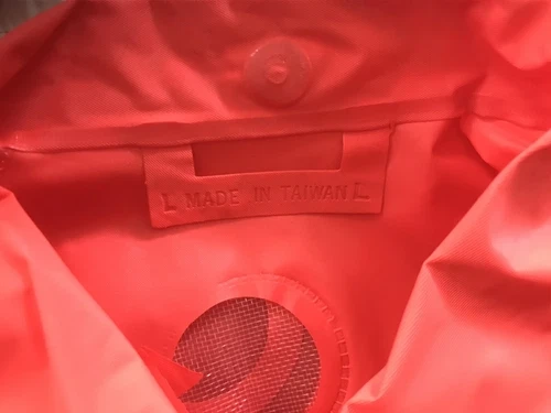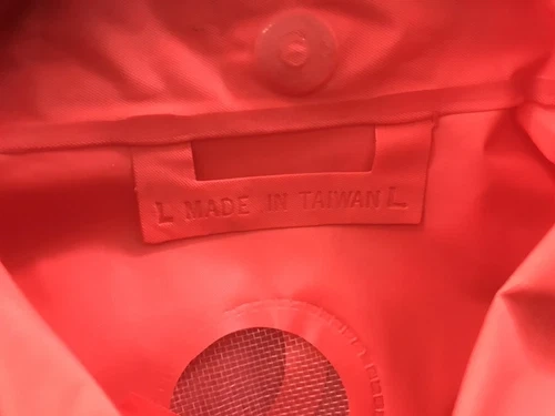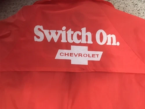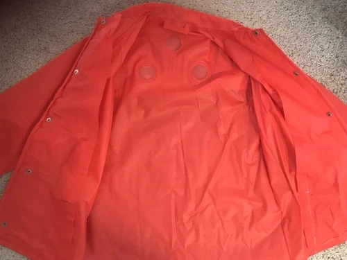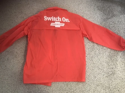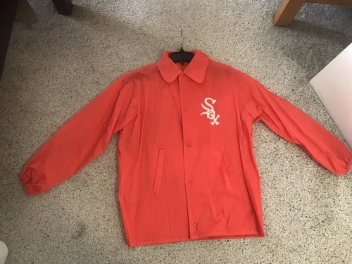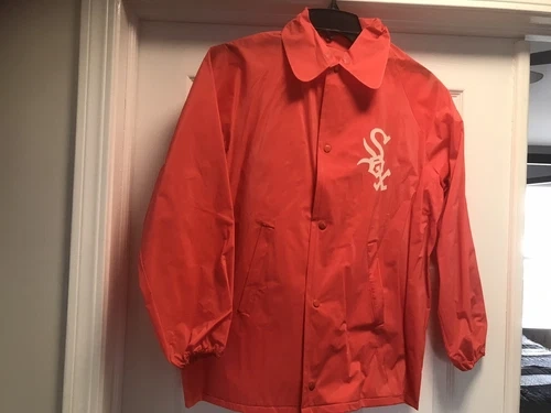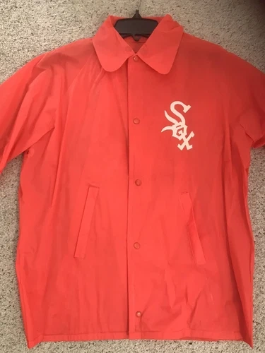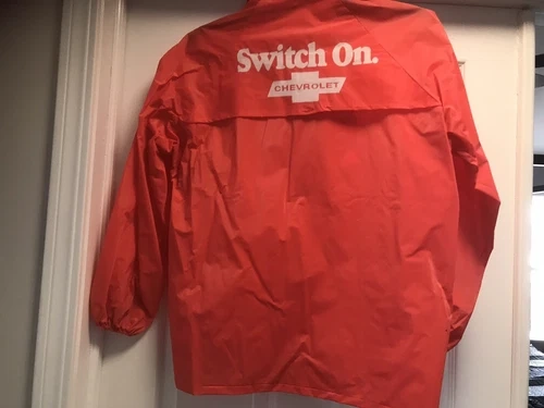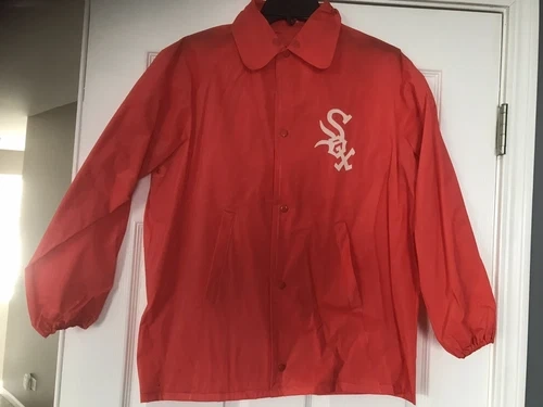 65This is a vintage red coat that was likely given away at a Chicago White Sox game. It features a Chevrolet logo and is estimated to be from the 70s or 80s. It would be a great addition to any baseball fan's collection. Some stains on coat. Size Large Kids. Raincoat material.. plastic?