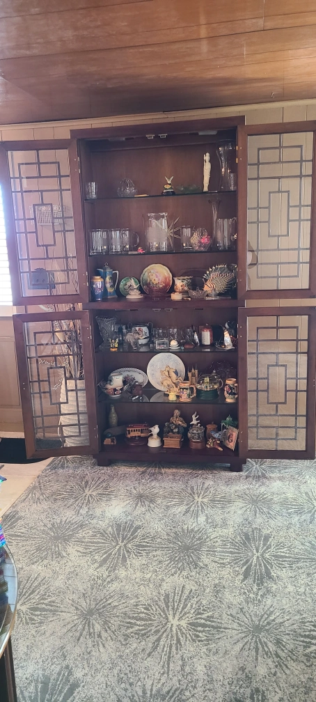 Display cabinet with glass doors and shelves. Perfect for displaying collectibles or storing items. It's in great condition and ready for a new home Display Cabinet with geometric design. Four door with brass hardware. 40"w x 14"d x 84"h CONTENTS NOT INCLUDED
