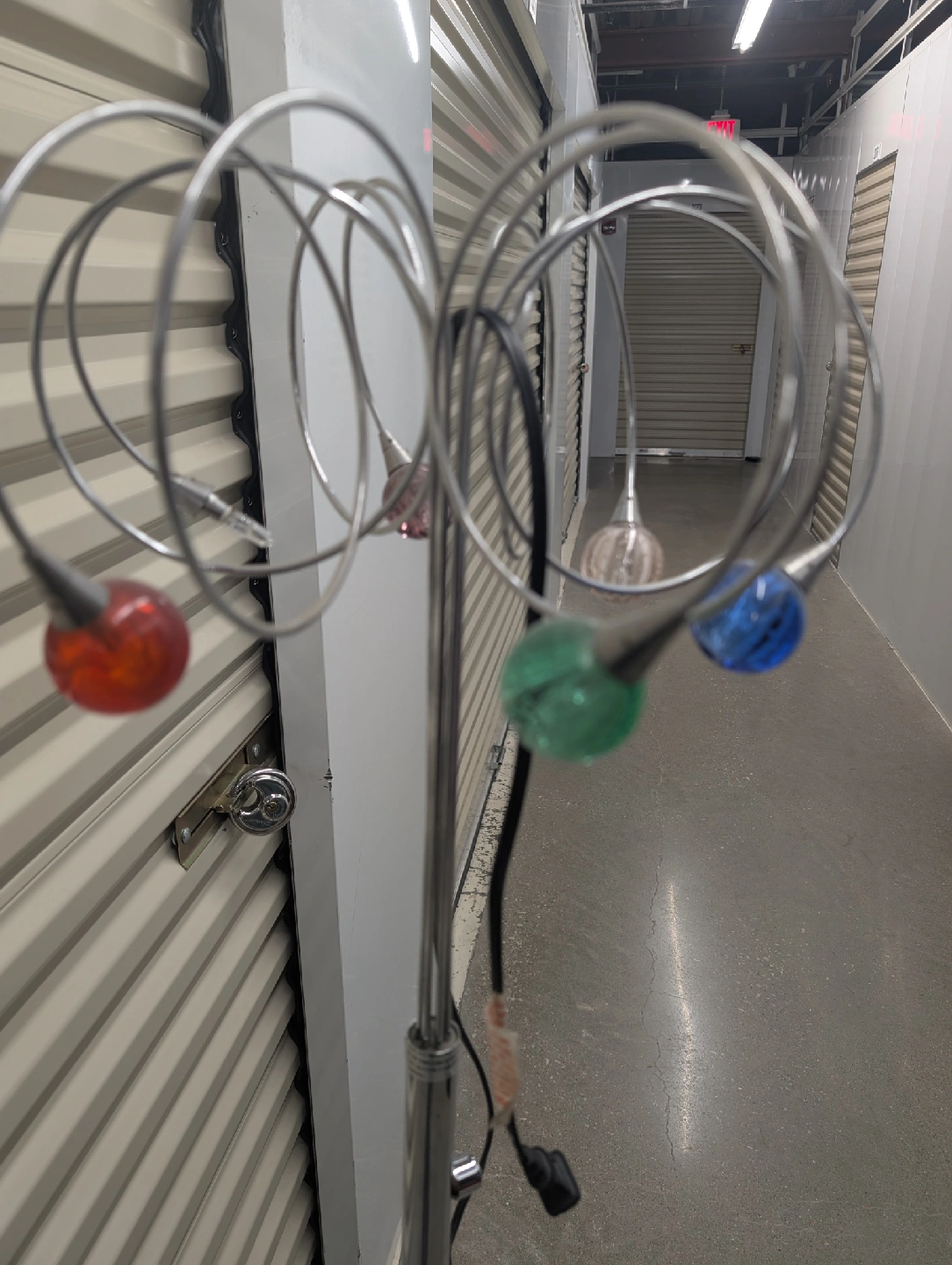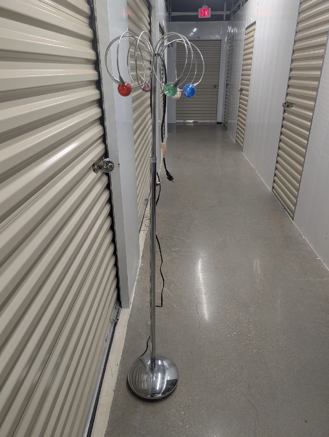 10This is a vintage "eyeball" floor lamp, likely from the 1970s. It features a chrome finish and five adjustable arms with round shades, each in a different color. The design is characteristic of the "space age" era. The arms can be swiveled to direct the light.